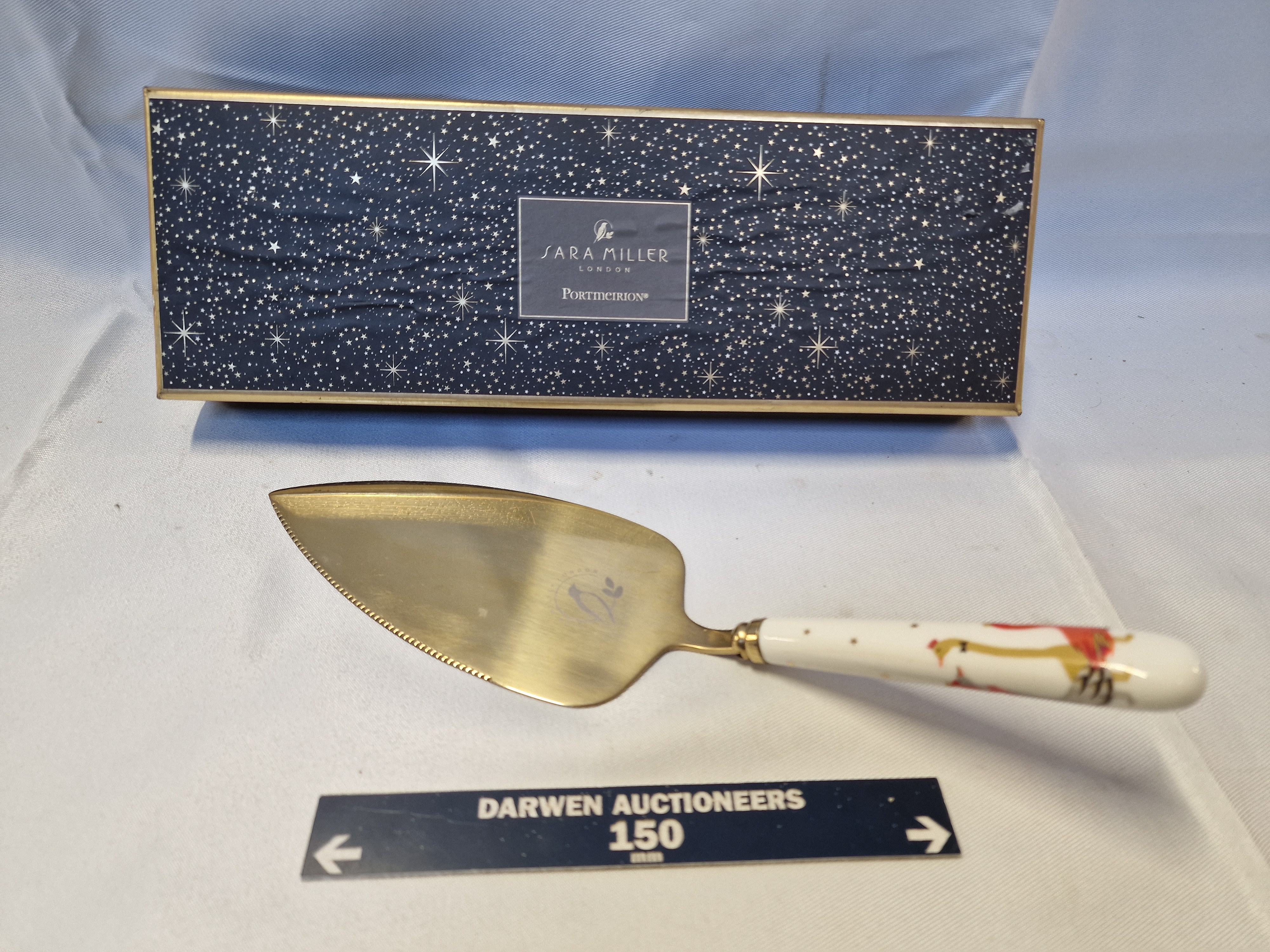 Sara Miller London for Portmeirion cake slice in the Chelsea pattern, contemporary. Features a gold-toned stainless steel blade with a serrated edge and a ceramic handle decorated with bird motifs and gold-coloured star accents. The blade bears an etched bird logo and the item is presented in its original dark blue star-patterned box.