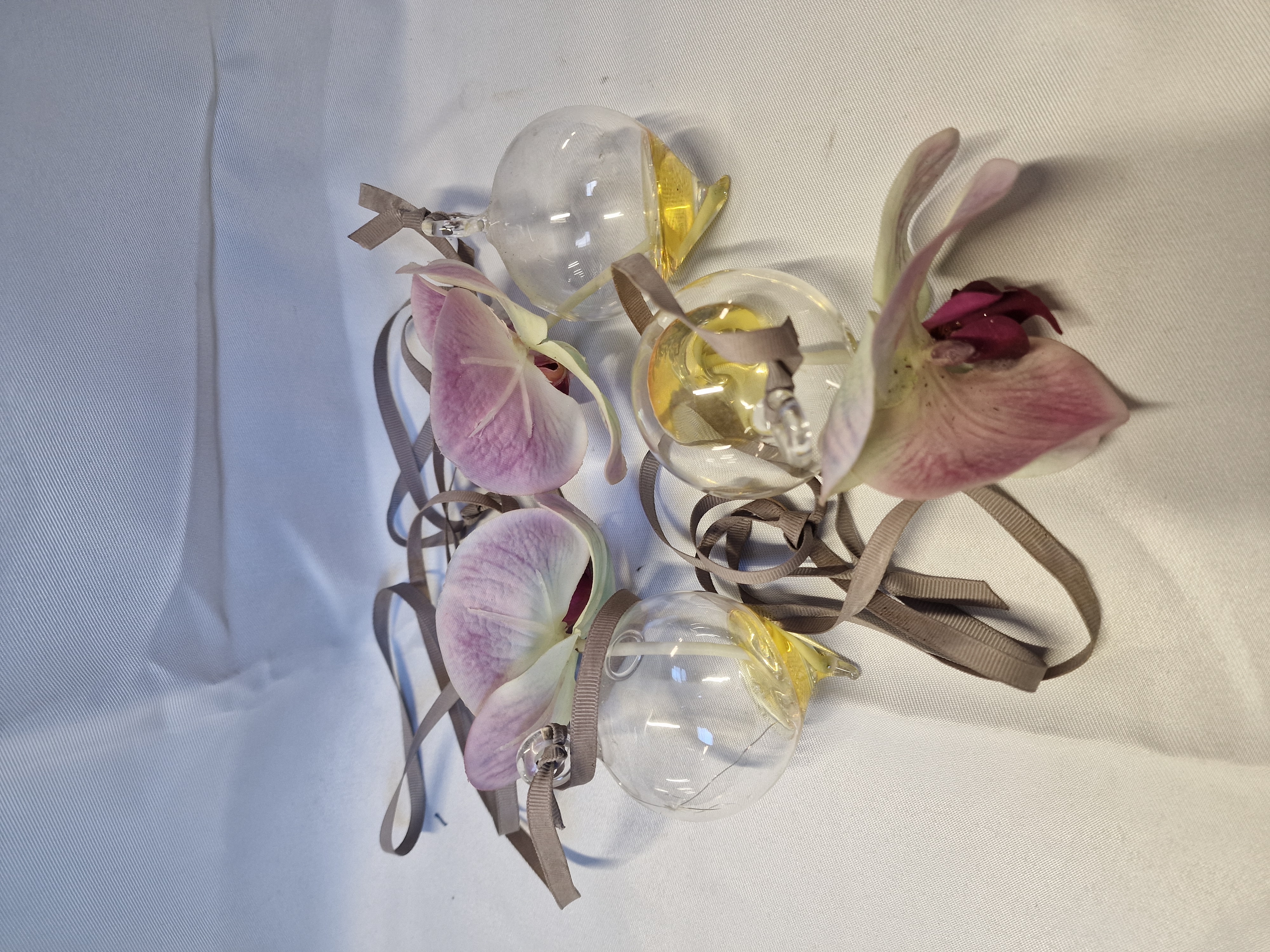A Trio of Contemporary Mouth-Blown Glass Hanging Ornaments with Artificial Orchids