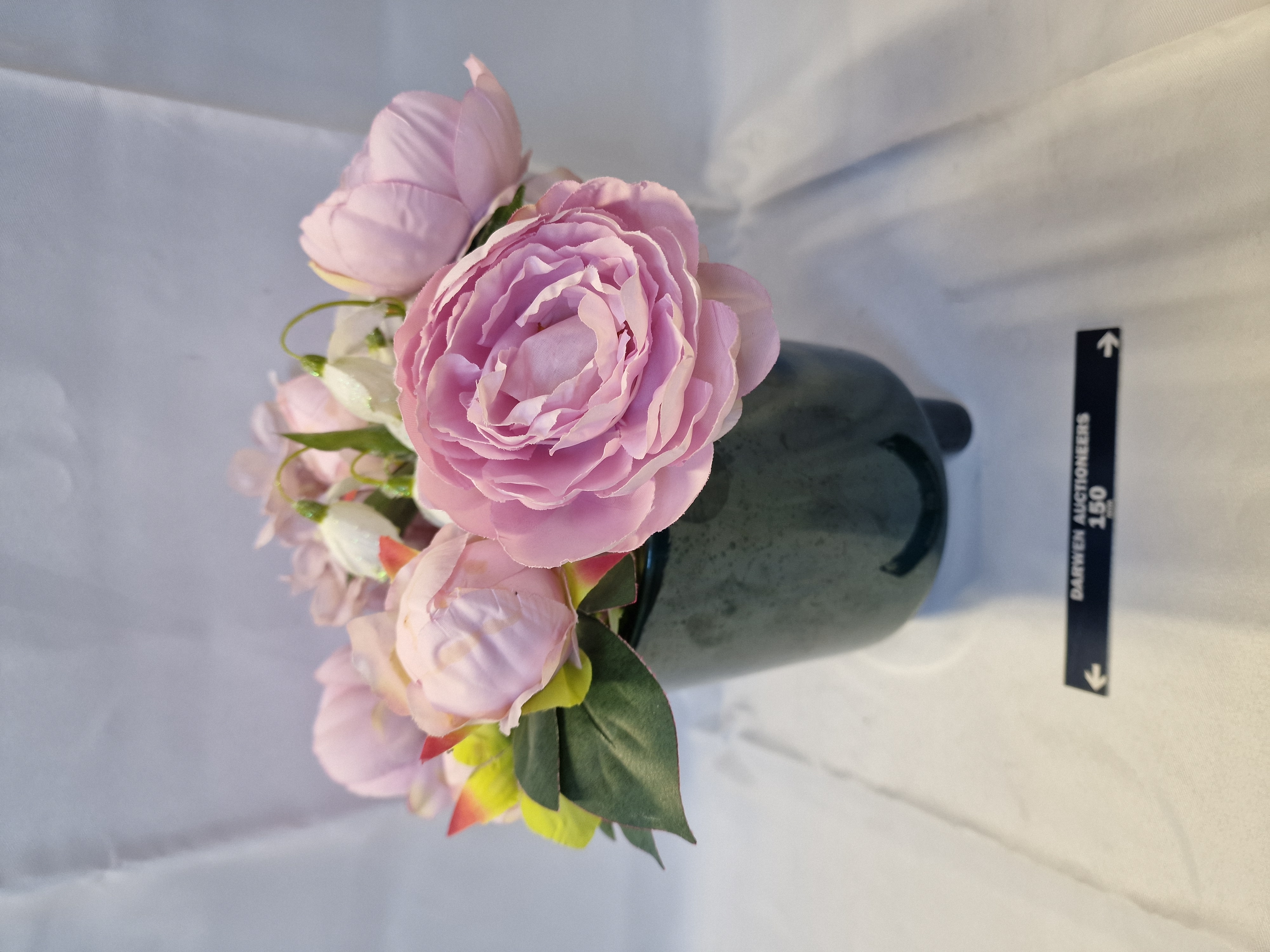 Contemporary artificial floral arrangement. Comprising pink fabric peonies and roses with white accent blossoms and green foliage, set within a dark-glazed ceramic tripod vessel. No visible maker’s marks or signatures are present.