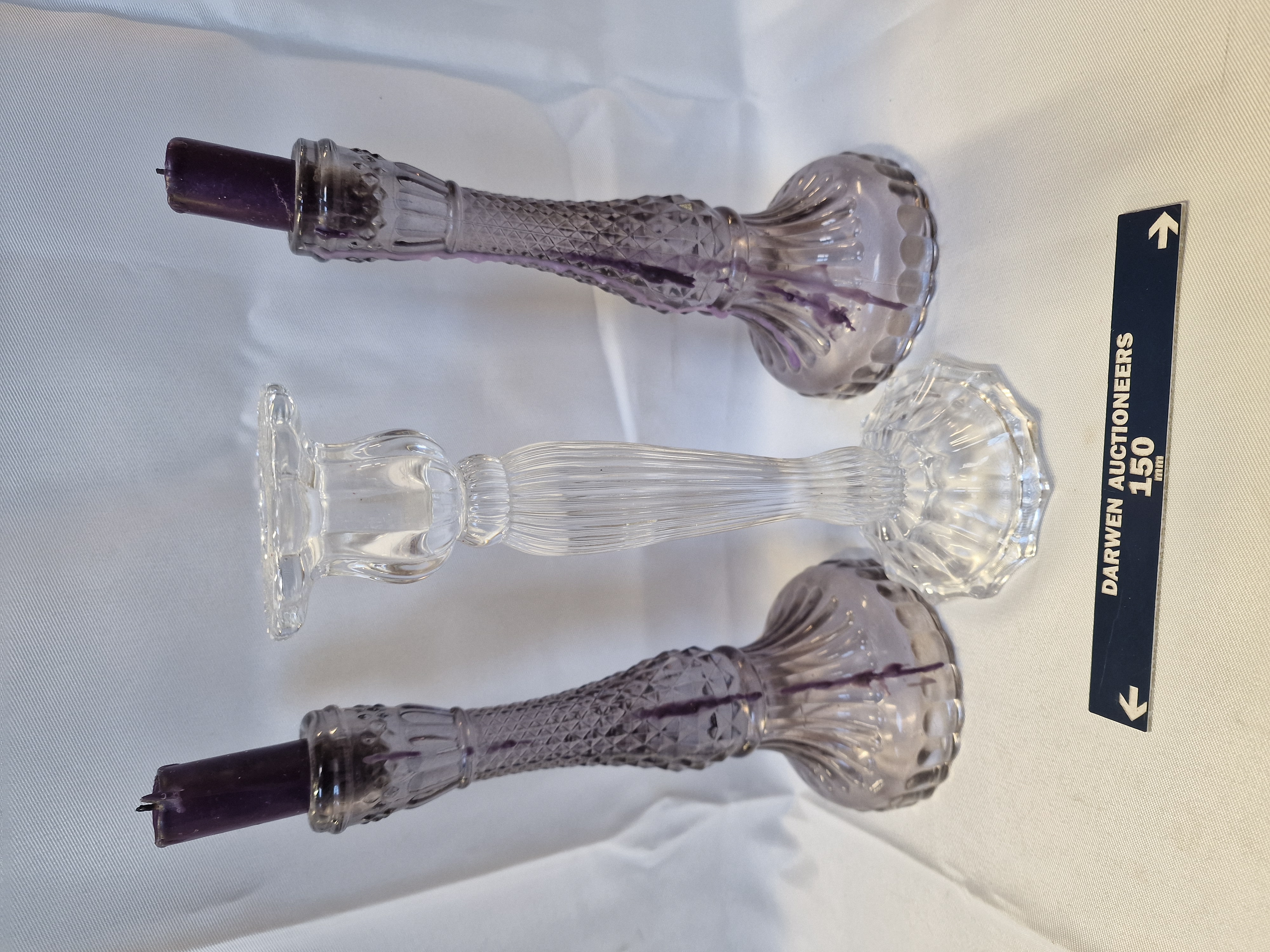 A trio of pressed glass candlesticks comprising a matching pair in a pale amethyst tint and a single clear glass example, likely late 19th or early 20th century. The amethyst pair features diamond-moulded lattice stems with vertical fluting on circular scalloped bases, while the clear candlestick has a fluted stem and a multi-lobed base. All pieces exhibit visible mould lines and smooth-moulded bases, with the amethyst pair retaining two dark purple candles.