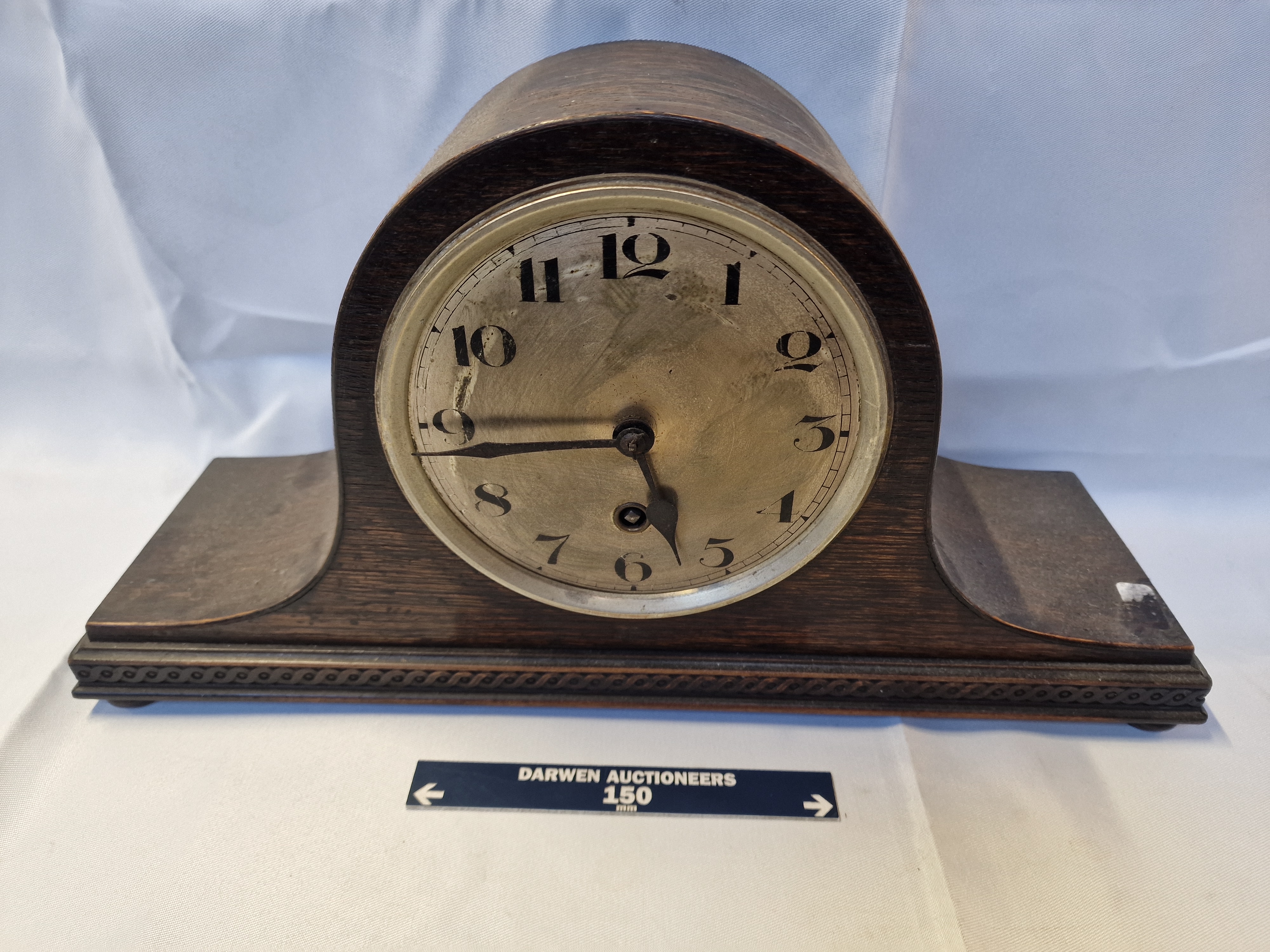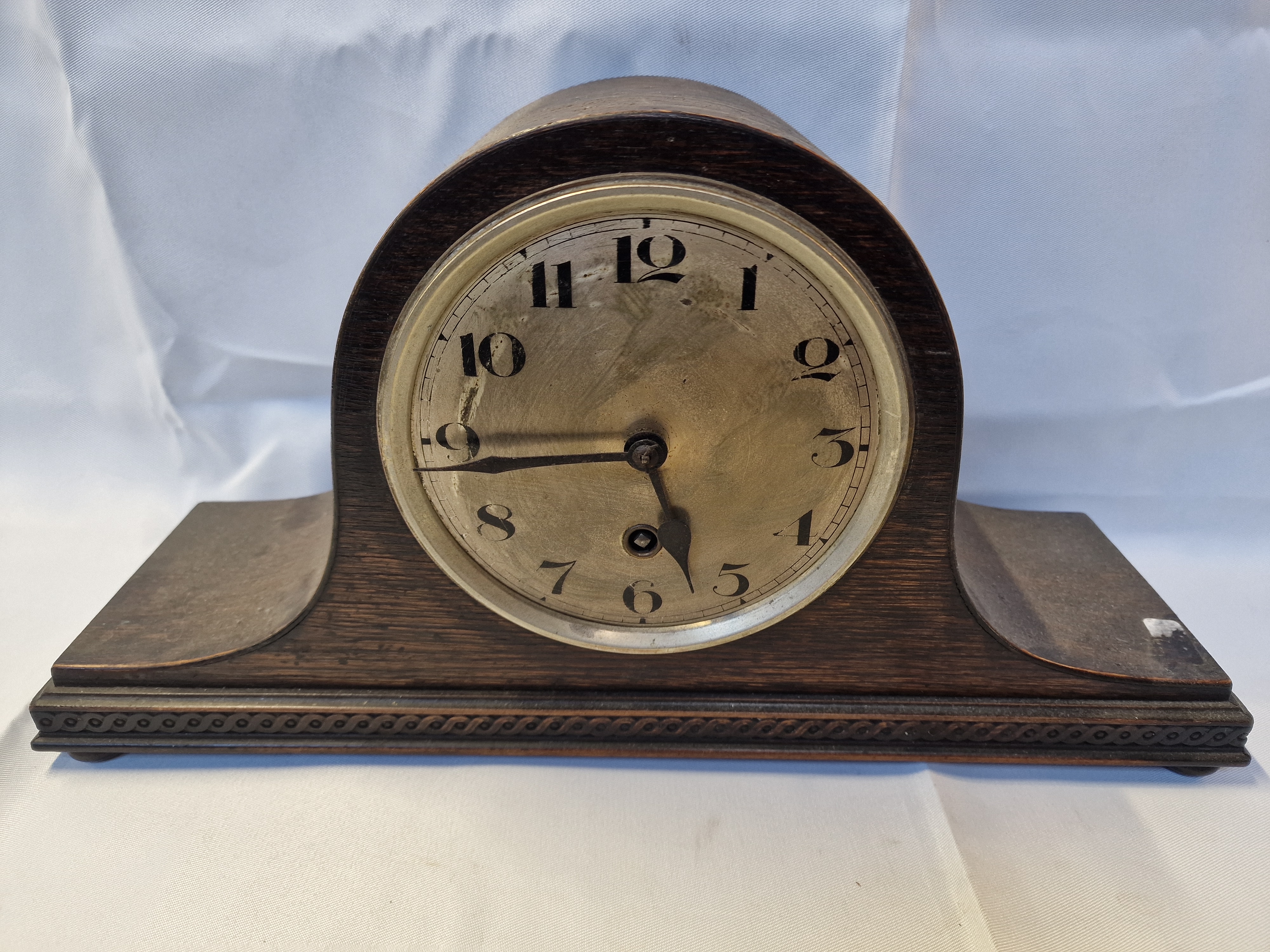 An early to mid-20th-century mantel clock of tambour or Napoleon hat form. The stained oak case features a curved top and a moulded base with a carved guilloché or rope-twist border. The circular metal dial displays Arabic numerals and a single winding aperture for a time-only mechanical movement.