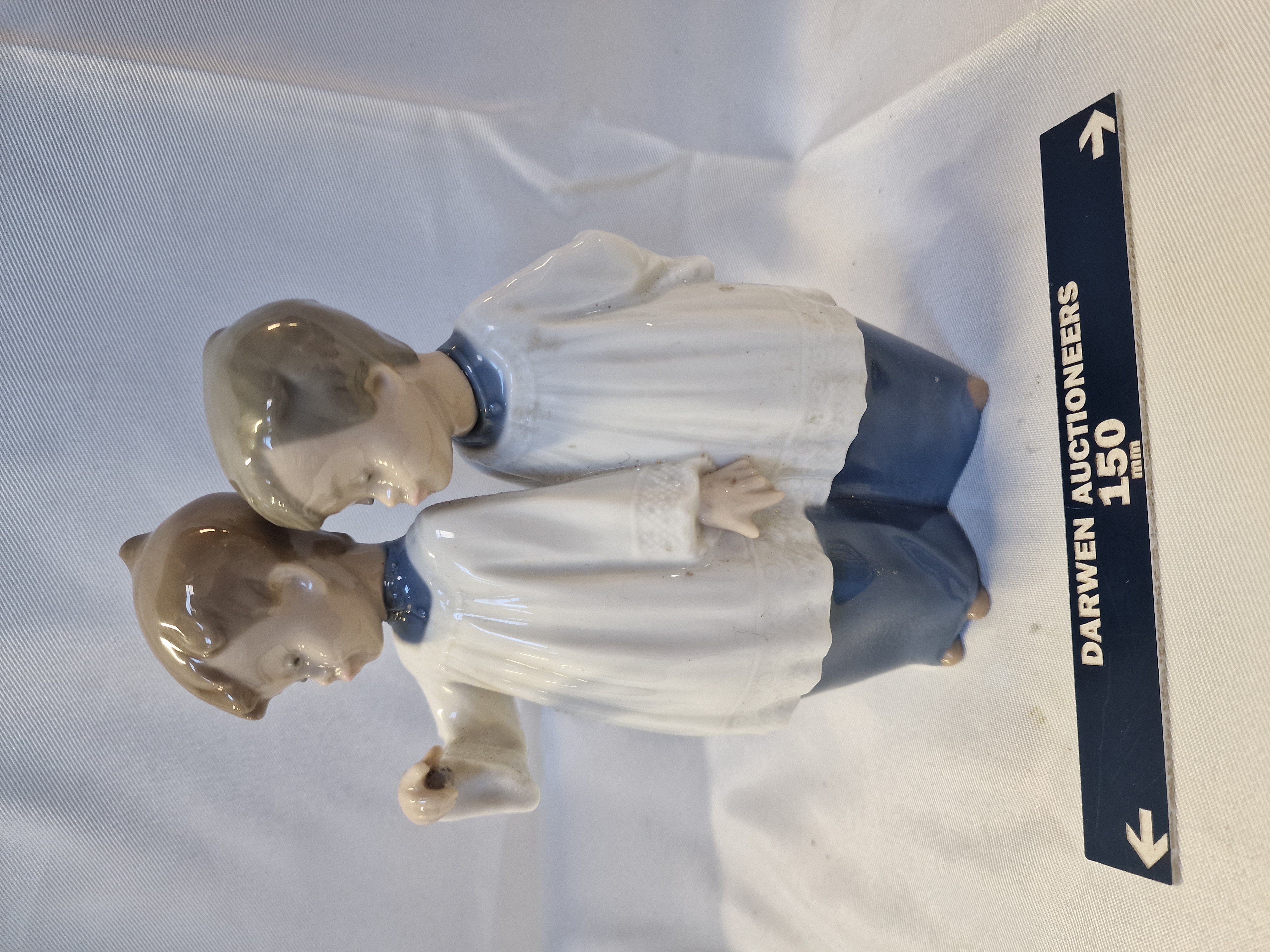 Nao by Lladro glazed porcelain figurine of two kneeling choir boys, model number 1072, dated 1988. The figures are depicted in traditional white surplices over blue cassocks with a polychrome finish. The underside bears the printed Nao by Lladro mark, DAISA 1988 copyright, and the stylized sailing vessel logo.
