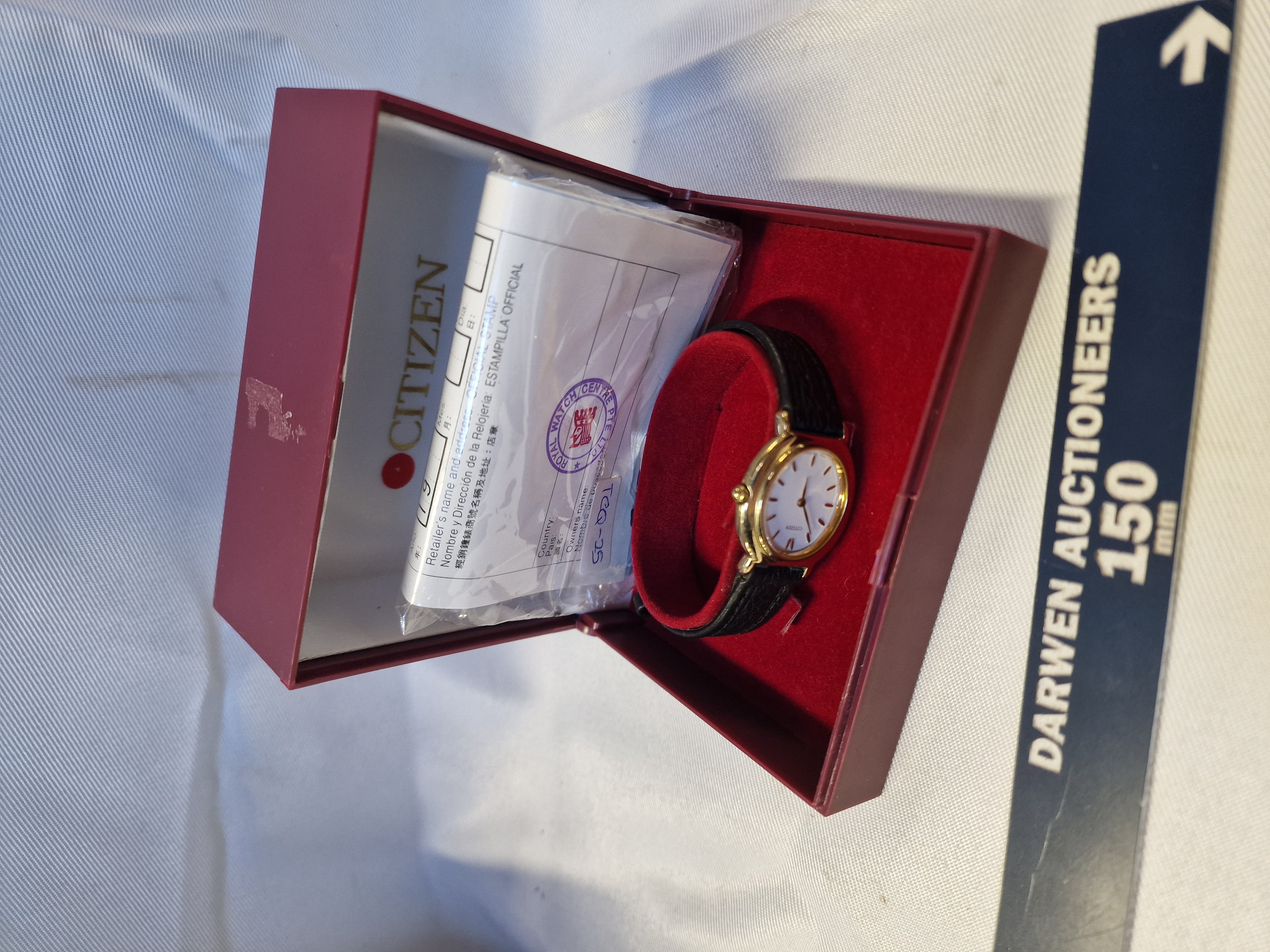 Citizen ladies quartz wristwatch, reference 5921-S2, late 20th century. Features a gold-tone metal case, white dial with gold-tone baton hour markers, and a black textured leather strap with a pin buckle. Presented in the original red Citizen branded box with an international guarantee booklet featuring a retailer stamp from Royal Watch Centre Pte Ltd.
