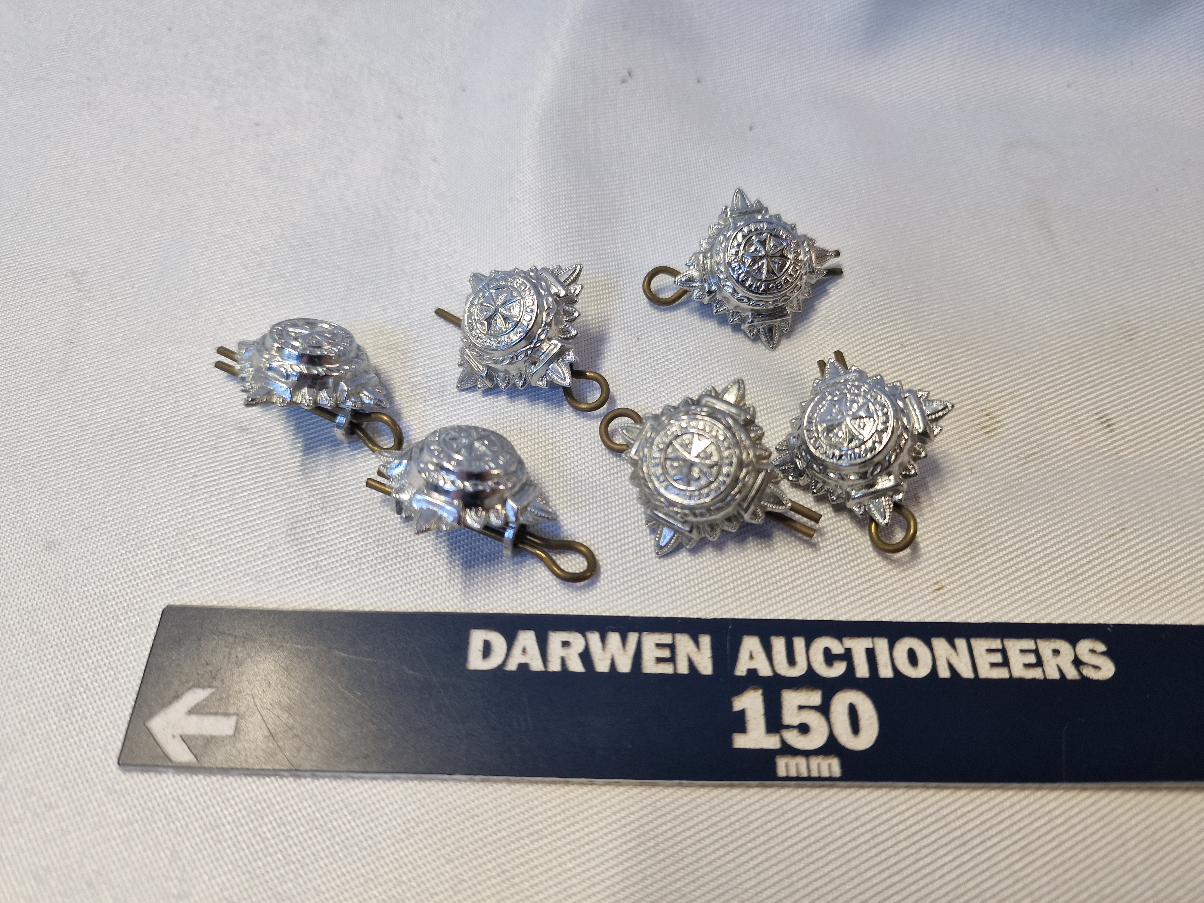 St John Ambulance Brigade uniform rank insignia, 20th century. Six chrome-plated white metal four-pointed faceted stars, each featuring a central boss with a Maltese cross and the circular inscription ST JOHN AMBULANCE BRIGADE. Each pip is fitted with two brass split-pin lugs to the reverse for epaulette attachment.