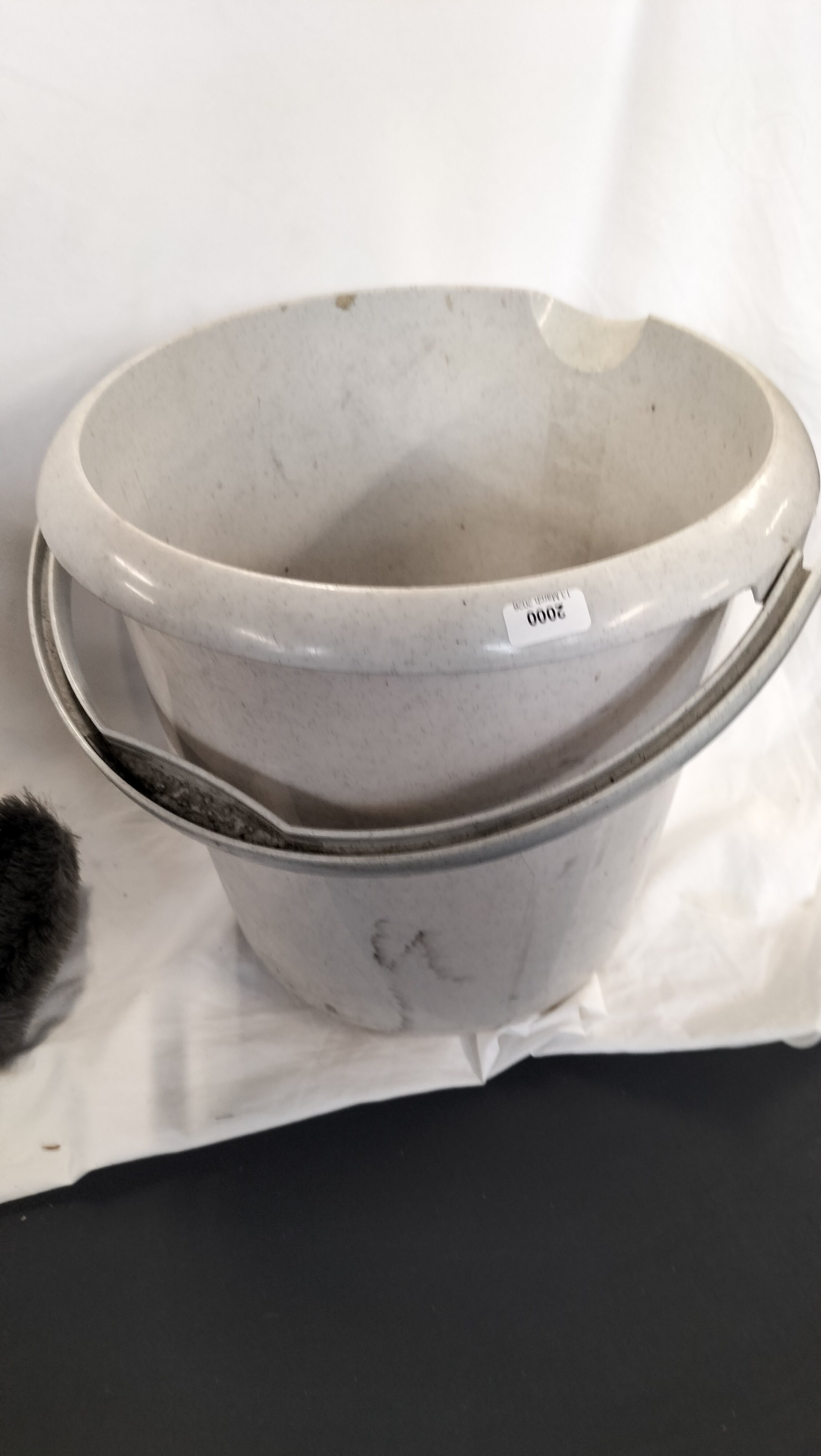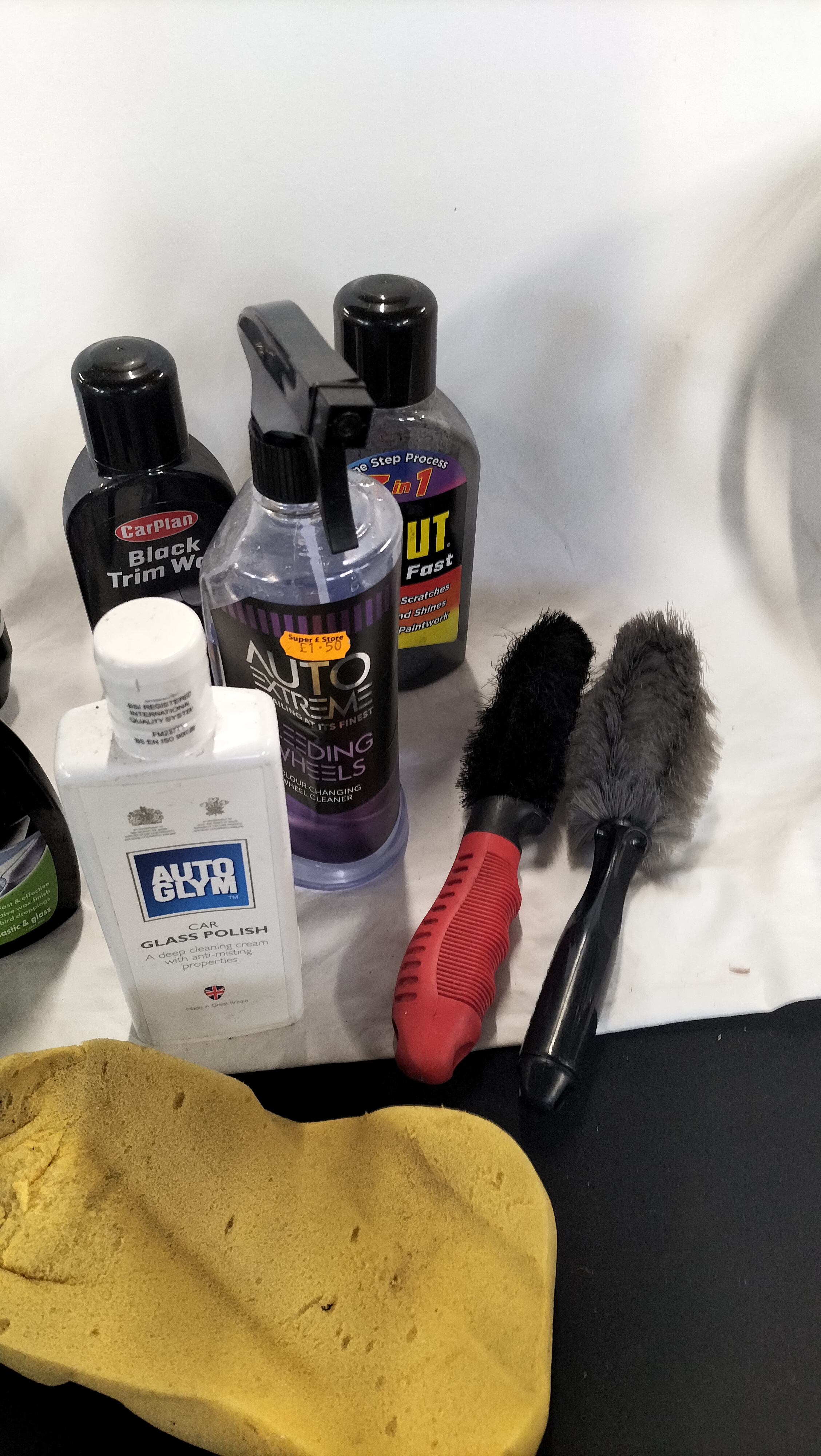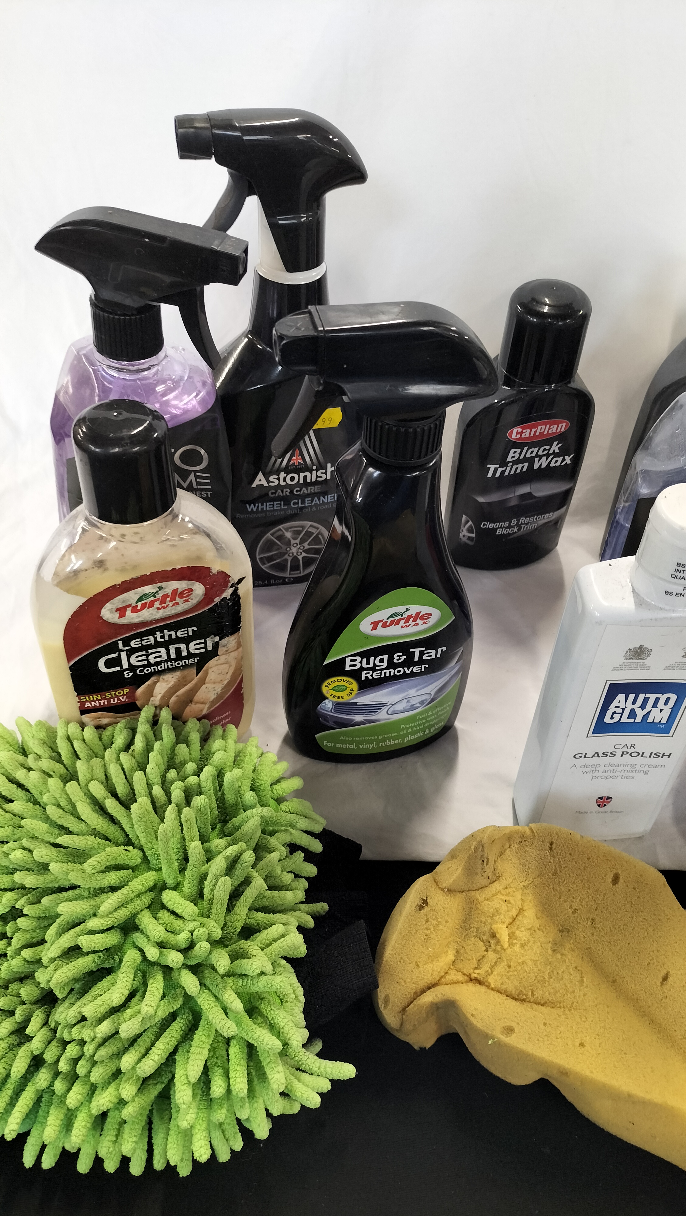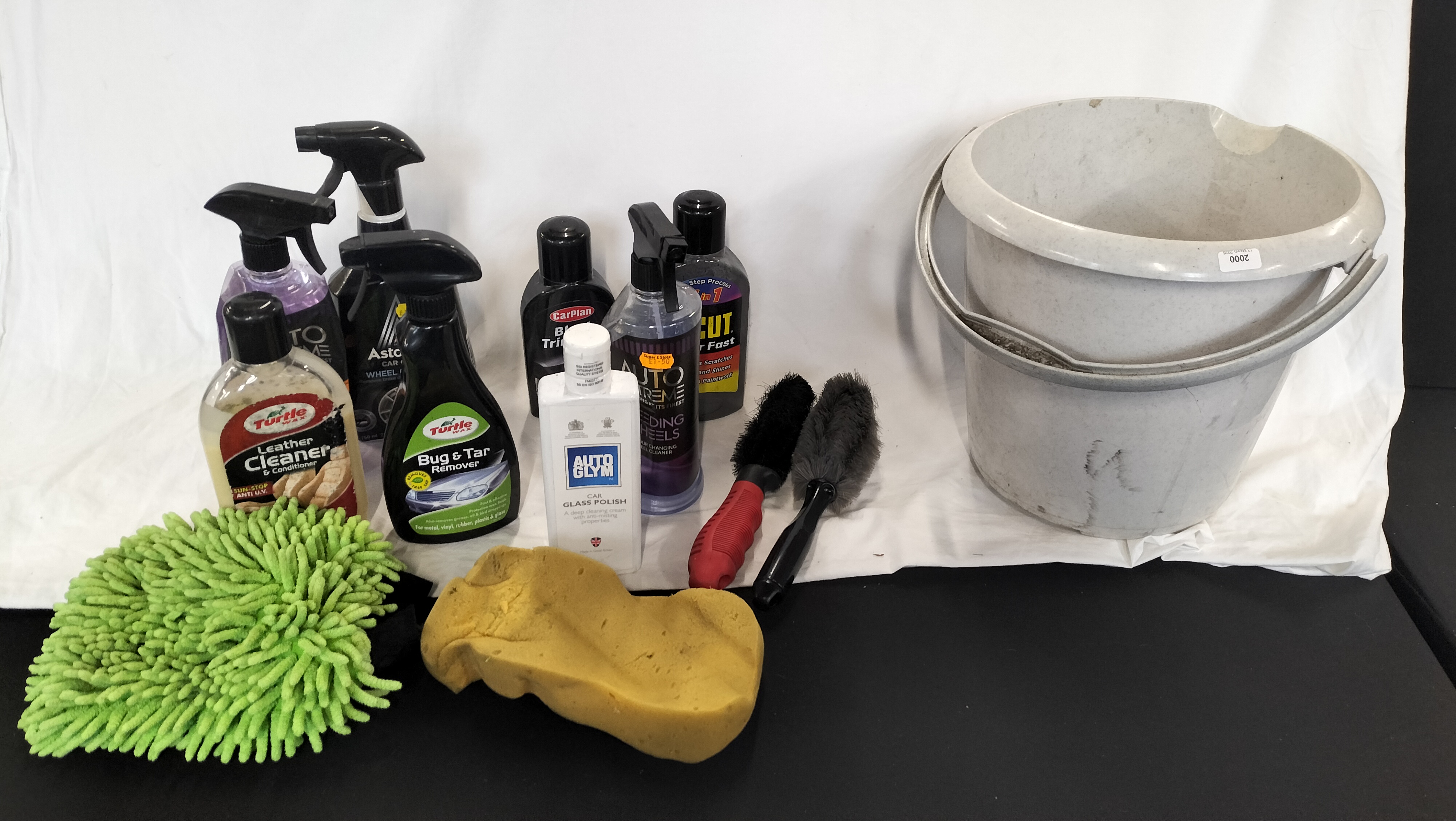 An assortment of automotive care products and cleaning accessories. The collection includes various chemical treatments from established brands: one bottle of Autoglym Car Glass Polish, one bottle of Turtle Wax Leather Cleaner and Conditioner, one spray bottle of Turtle Wax Bug and Tar Remover, one spray bottle of Astonish Wheel Cleaner, one bottle of CarPlan Black Trim Wax, and one spray bottle of Auto Extreme Bleeding Wheels colour-changing cleaner. Also included is a bottle of T-Cut and an additional spray bottle containing purple liquid. The cleaning tools comprise a green microfibre noodle-style wash mitt, a large yellow contoured sponge, and two detailing brushes, one featuring a red and black ergonomic handle and the other a long-reach black handle. The items are contained within a large grey plastic bucket with a metal carry handle. The bucket bears a white rectangular lot sticker numbered 2000.