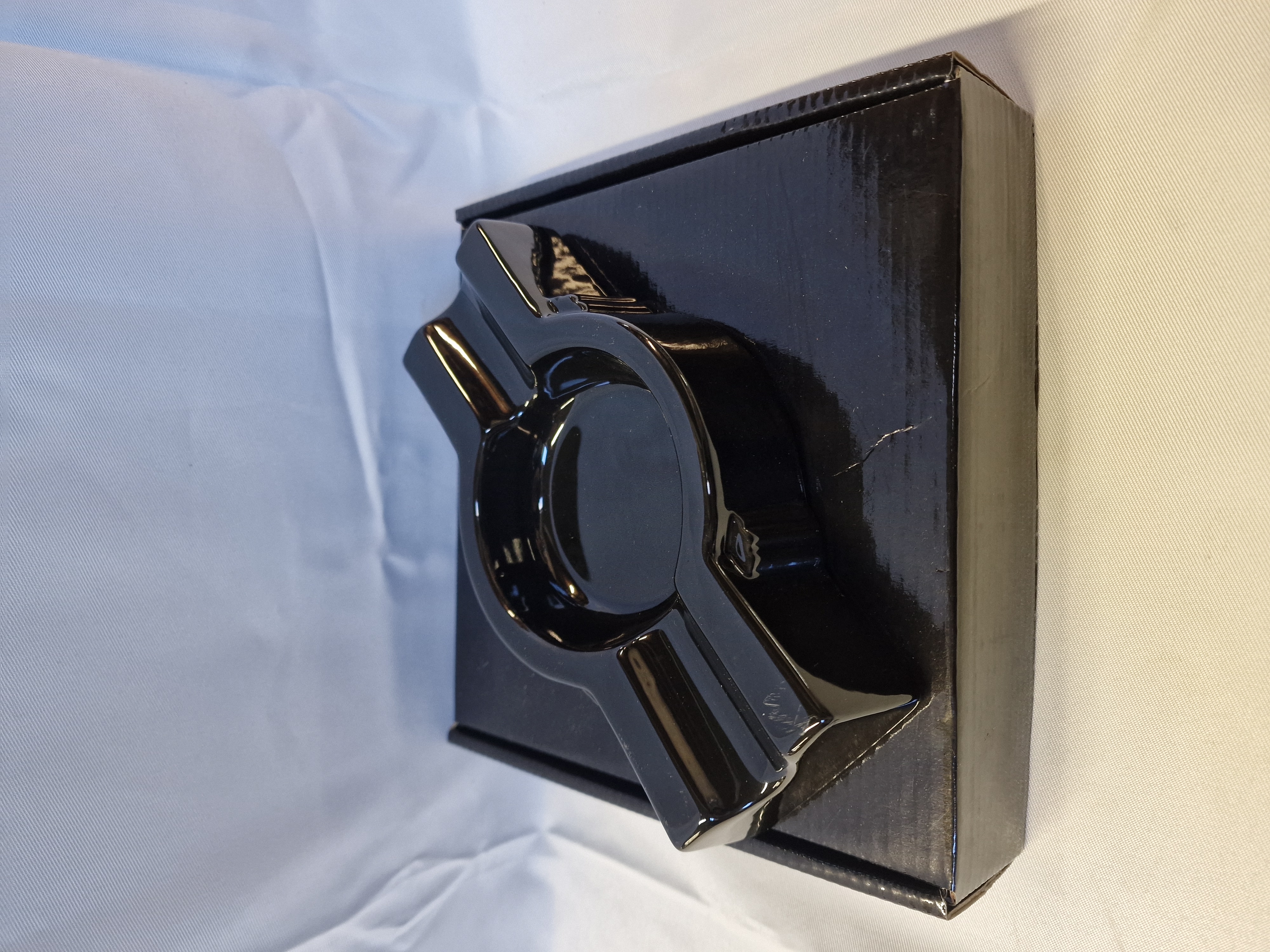 A contemporary large cigar ashtray featuring a circular central well and three integrated rests. The piece is constructed from ceramic with a high-shine black gloss finish throughout. It is presented with its original plain black cardboard retail packaging.