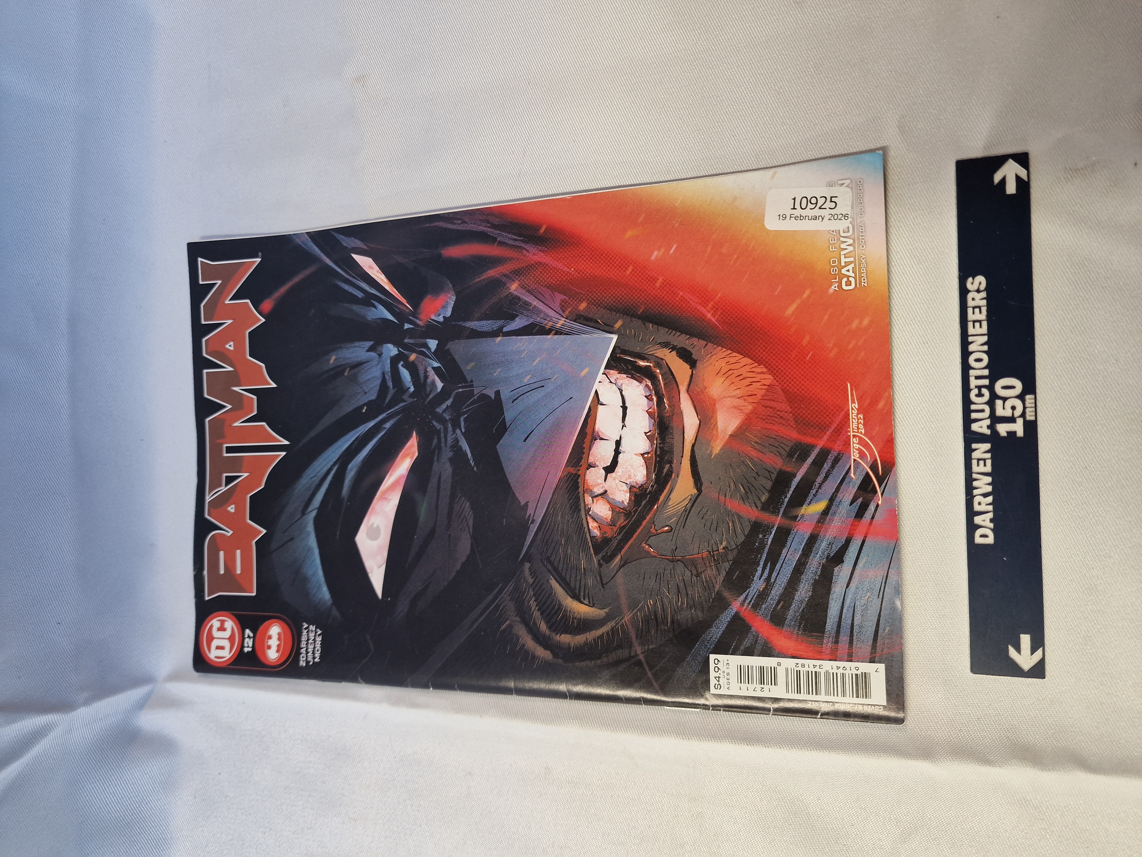 DC Comics Batman issue number 127, Cover A by Jorge Jimenez, published September 2022. This staple-bound comic book features part three of the Failsafe story arc written by Chip Zdarsky with art by Jimenez and colours by Tomeu Morey. The front cover displays the DC logo, title, and a printed artist signature, with an external auction label numbered 10925 attached to the protective sleeve.