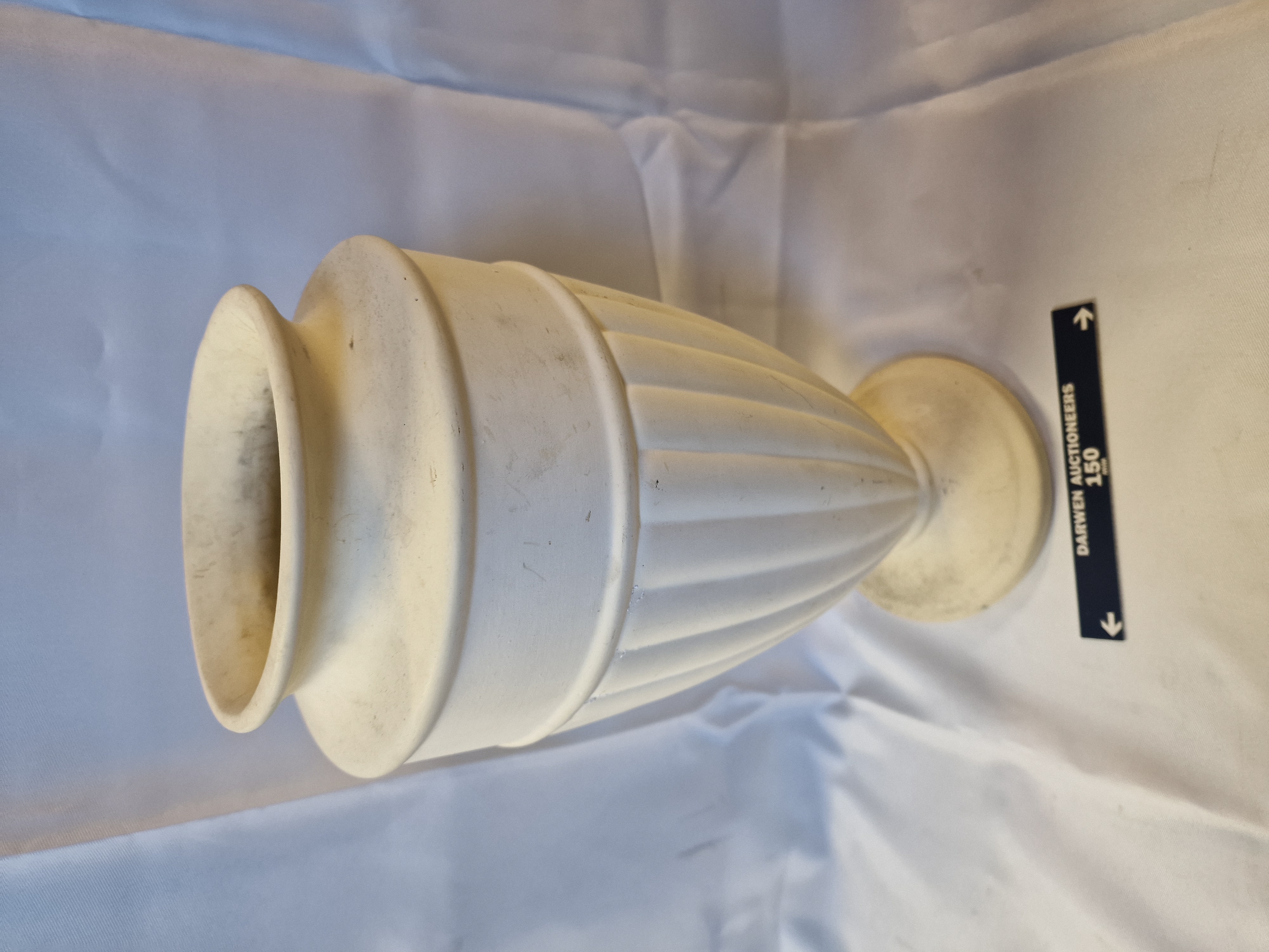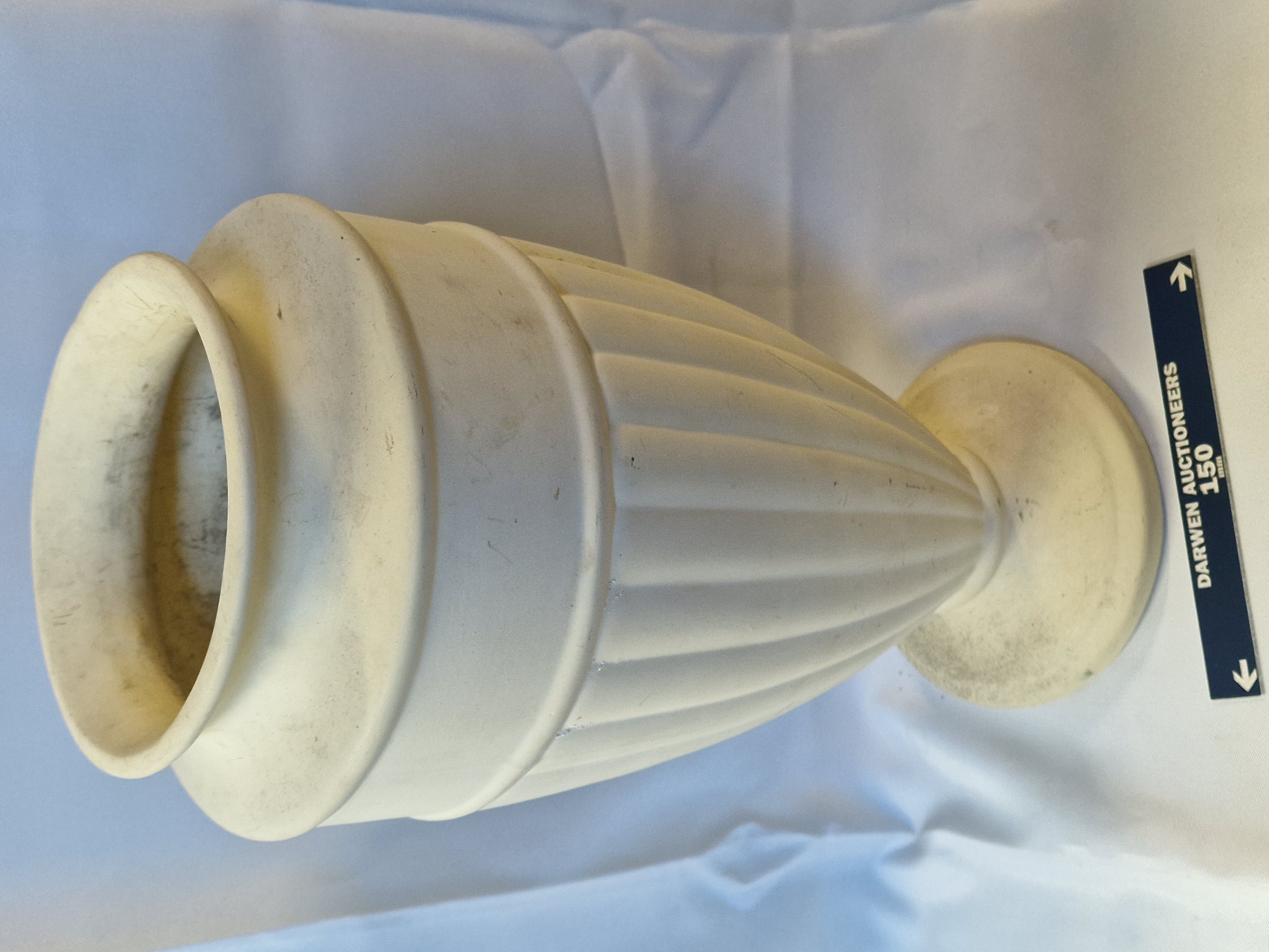 Large ceramic pedestal urn, mid-to-late 20th century, attributed to Haeger Pottery. The vessel features a flared rim above three raised concentric bands at the shoulder and a vertically fluted lower body supported by a circular pedestal foot. It is finished in a matte cream-coloured ceramic with no visible maker’s marks.