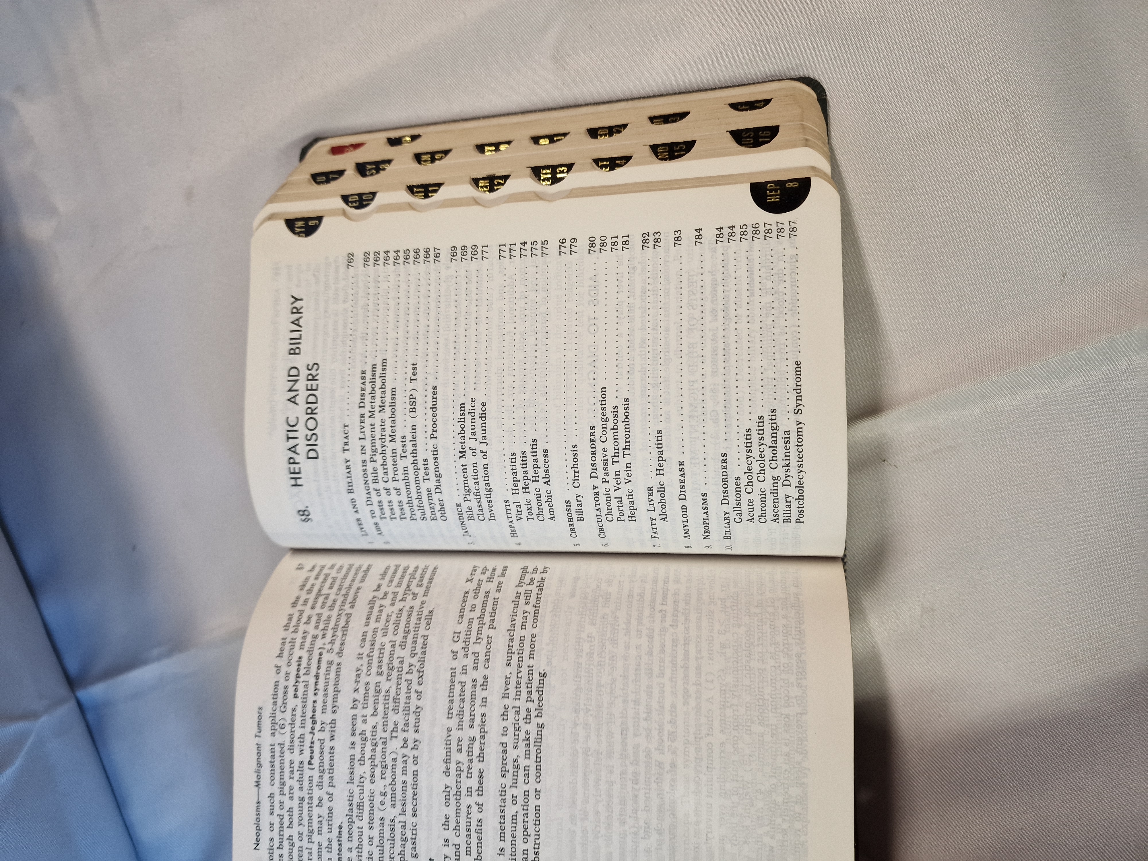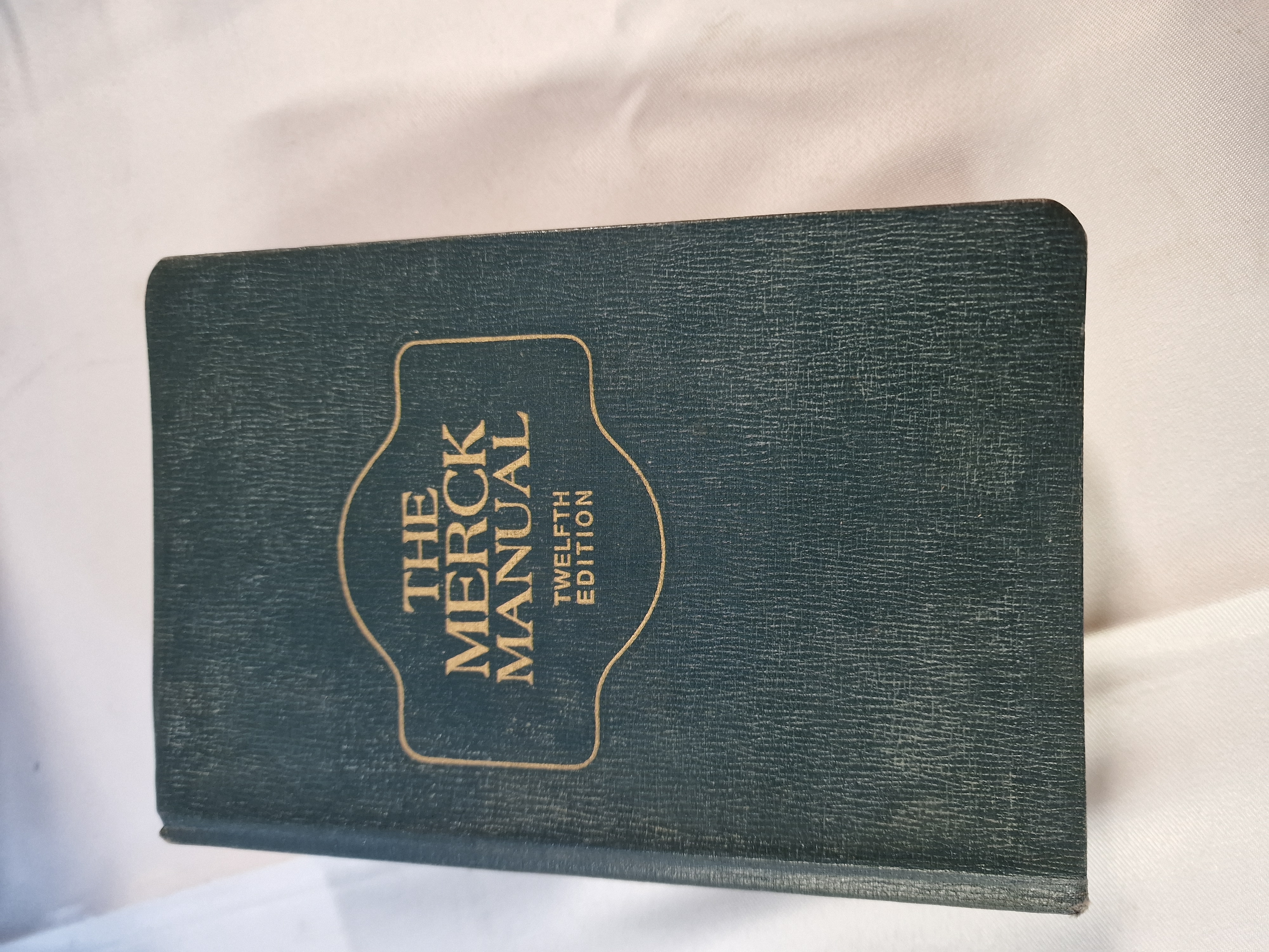 Merck Sharp & Dohme, The Merck Manual of Diagnosis and Therapy, Twelfth Edition, 1972. This small-format medical reference is bound in dark green textured cloth with gilt-stamped lettering and a decorative border to the front cover. The volume features a thumb-indexed fore-edge with black-labelled tabs for various clinical sections including Hepatic and Biliary Disorders.