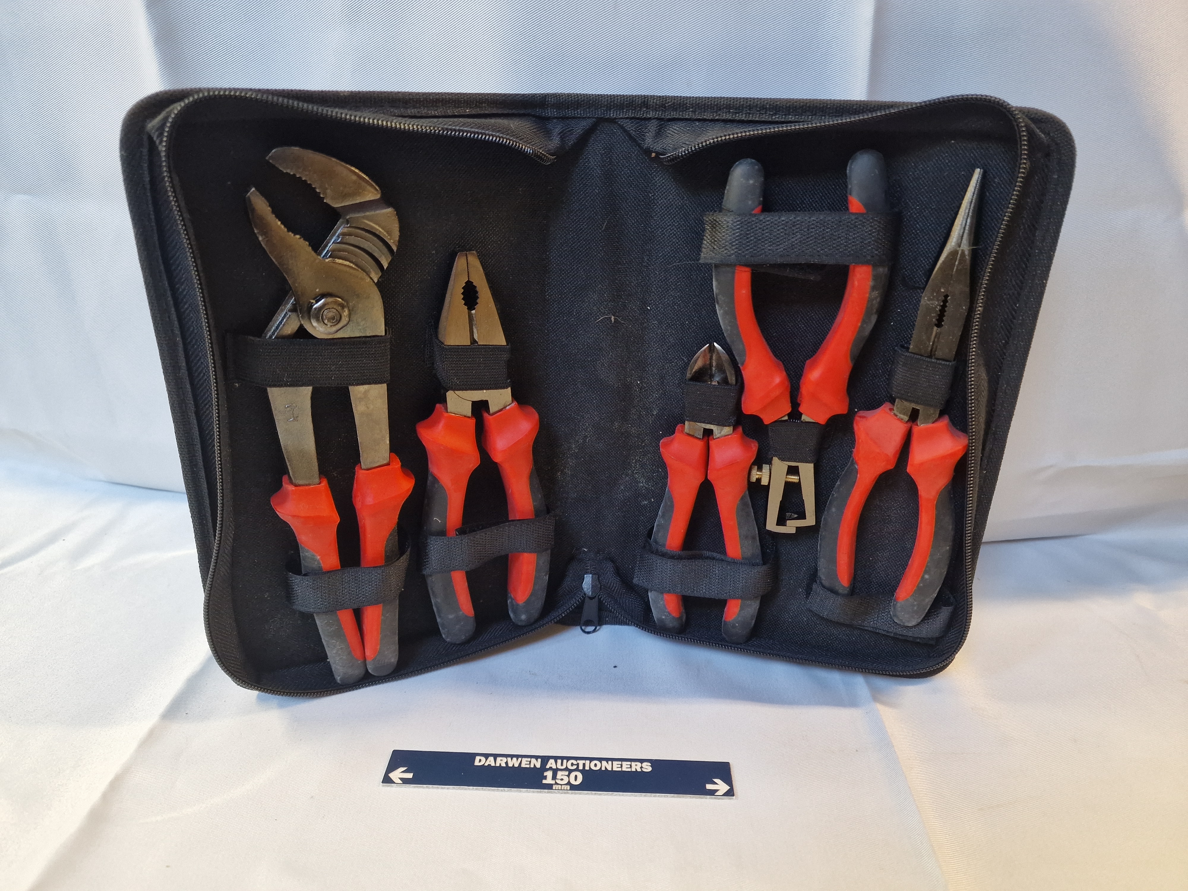 A five-piece set of assorted pliers and wire-working tools, late 20th or early 21st century. The collection comprises adjustable groove-joint pliers, combination pliers, diagonal cutters, wire strippers, and long-nose pliers with red and black ergonomic rubberised grips. The items are housed in a black fabric zippered case with internal elasticated security straps, with an incised character Y or V visible on the shank of the largest tool.