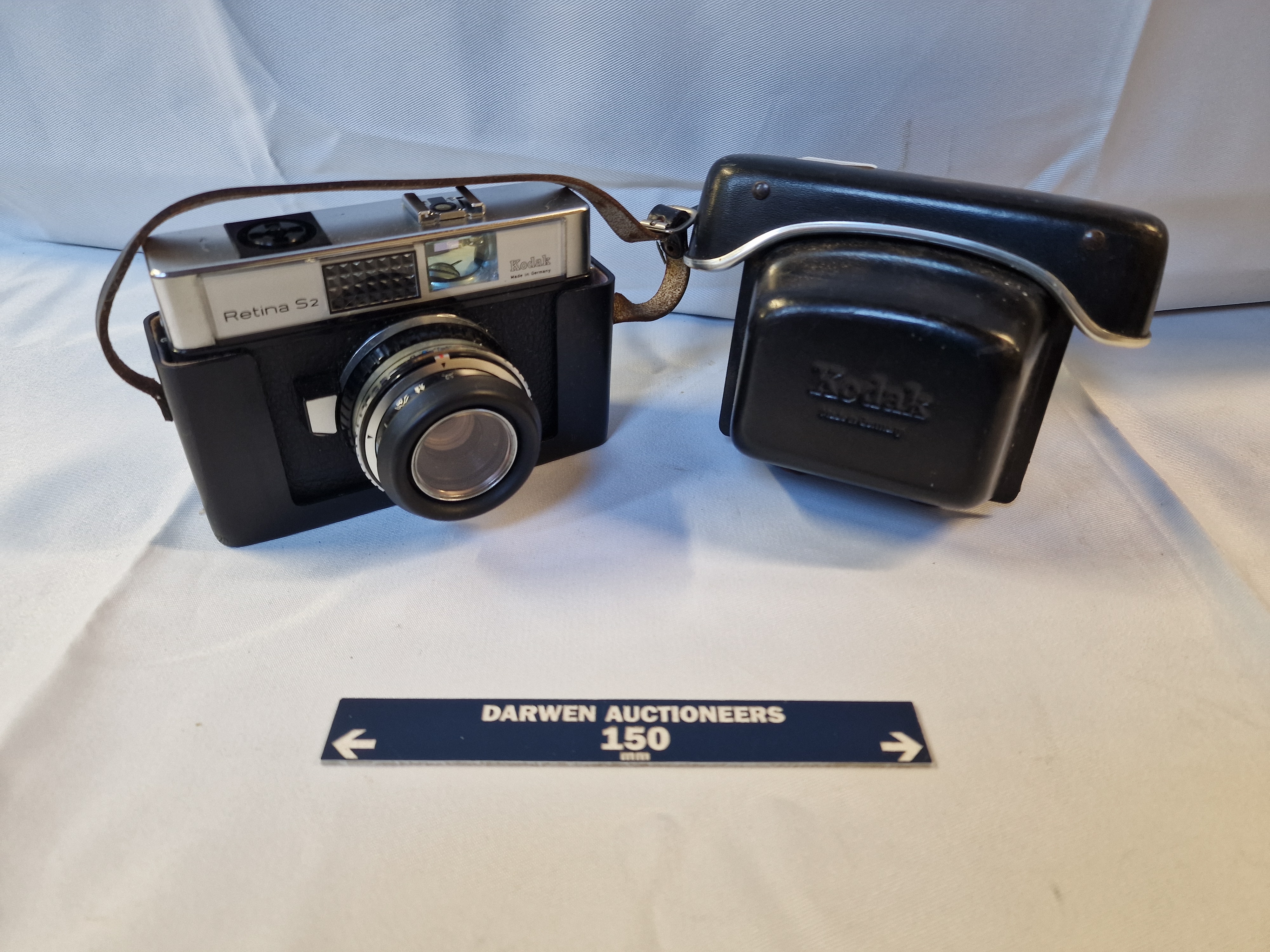Kodak Retina S2 35mm viewfinder camera, manufactured by Kodak AG in Stuttgart, Germany, circa late 1960s. The camera features a Schneider-Kreuznach Reomar 45mm f/2.8 lens and an integrated selenium light meter set in a satin-finish chrome and black textured body. It is accompanied by a black Kodak-branded ever-ready carrying case with an integrated neck strap.