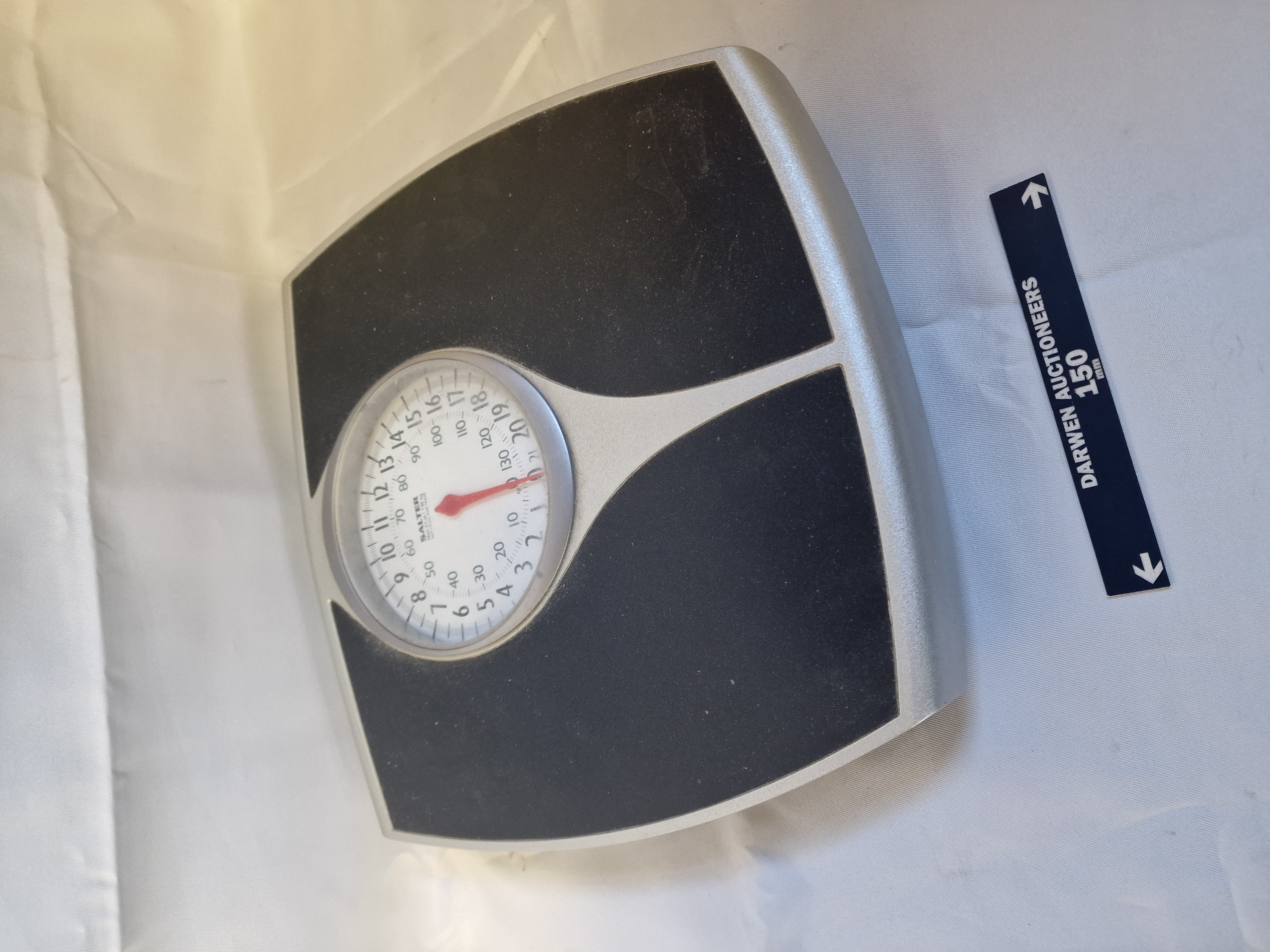 Salter 148 BKSVDR Speedo Dial mechanical bathroom scales, 21st century. Features a silver-toned frame with black textured footpads and a circular analogue dial with a red pointer. Dial marked SALTER with capacity MAX 133kg / 21st / 300lb and increments d=1kg/2lb.