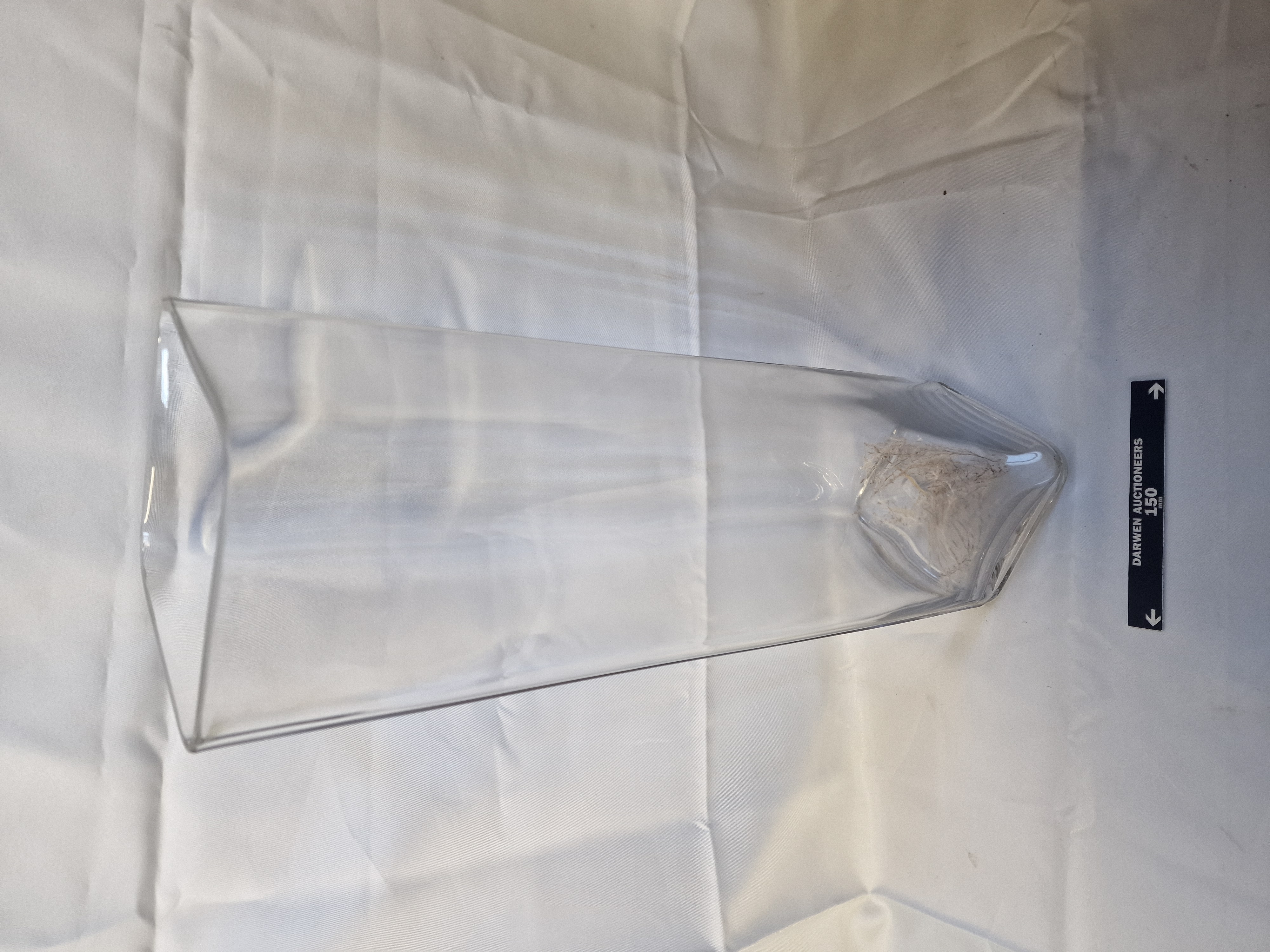 A contemporary clear glass vase of elongated, tapering four-sided form, terminating in a faceted pointed base. The piece is constructed from thick-walled colourless glass with a modern geometric aesthetic. No maker’s marks are present, though residue of a paper label remains internally at the base.