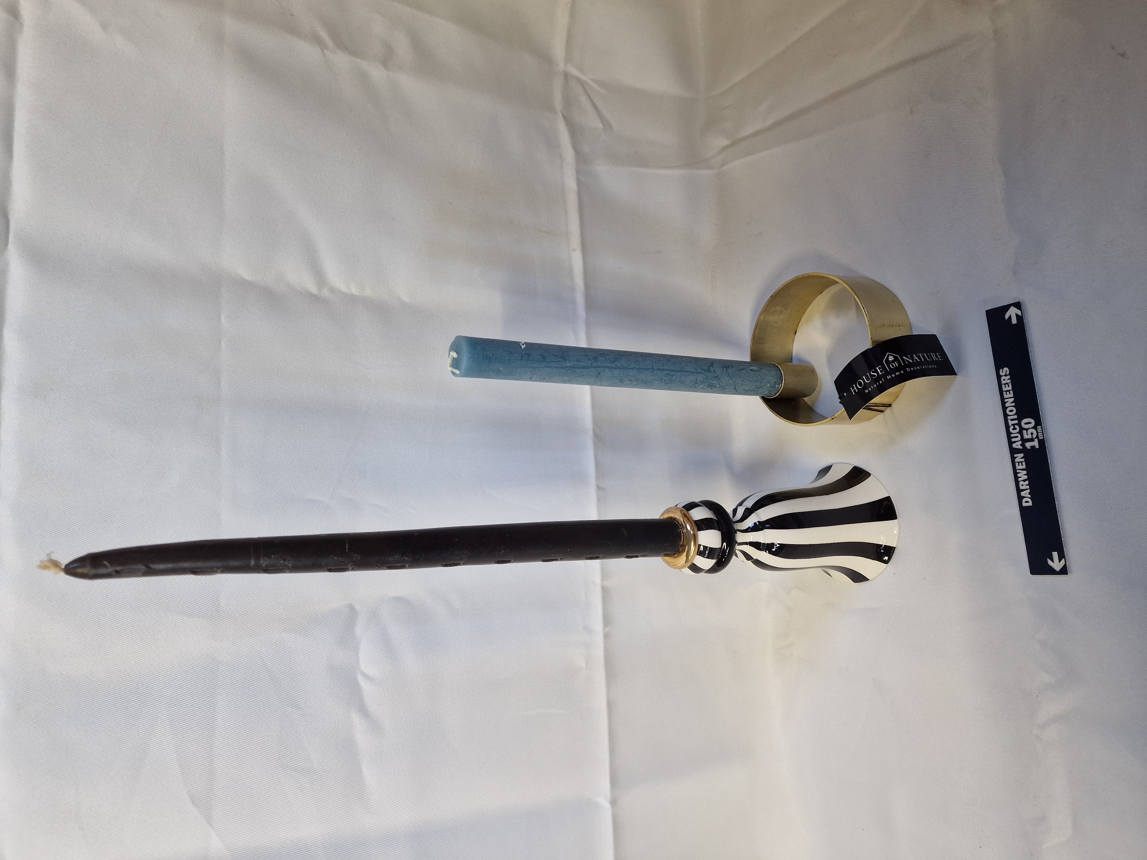 A House of Nature brass-tone metal ring candle holder and a contemporary glazed ceramic candlestick, both presented with taper candles. The ceramic holder features a waisted, flared form with vertical black and white striped decoration and a gold-tone metallic collar. The brass-tone holder retains a black and white paper label for House of Nature – Natural Home Decorations.