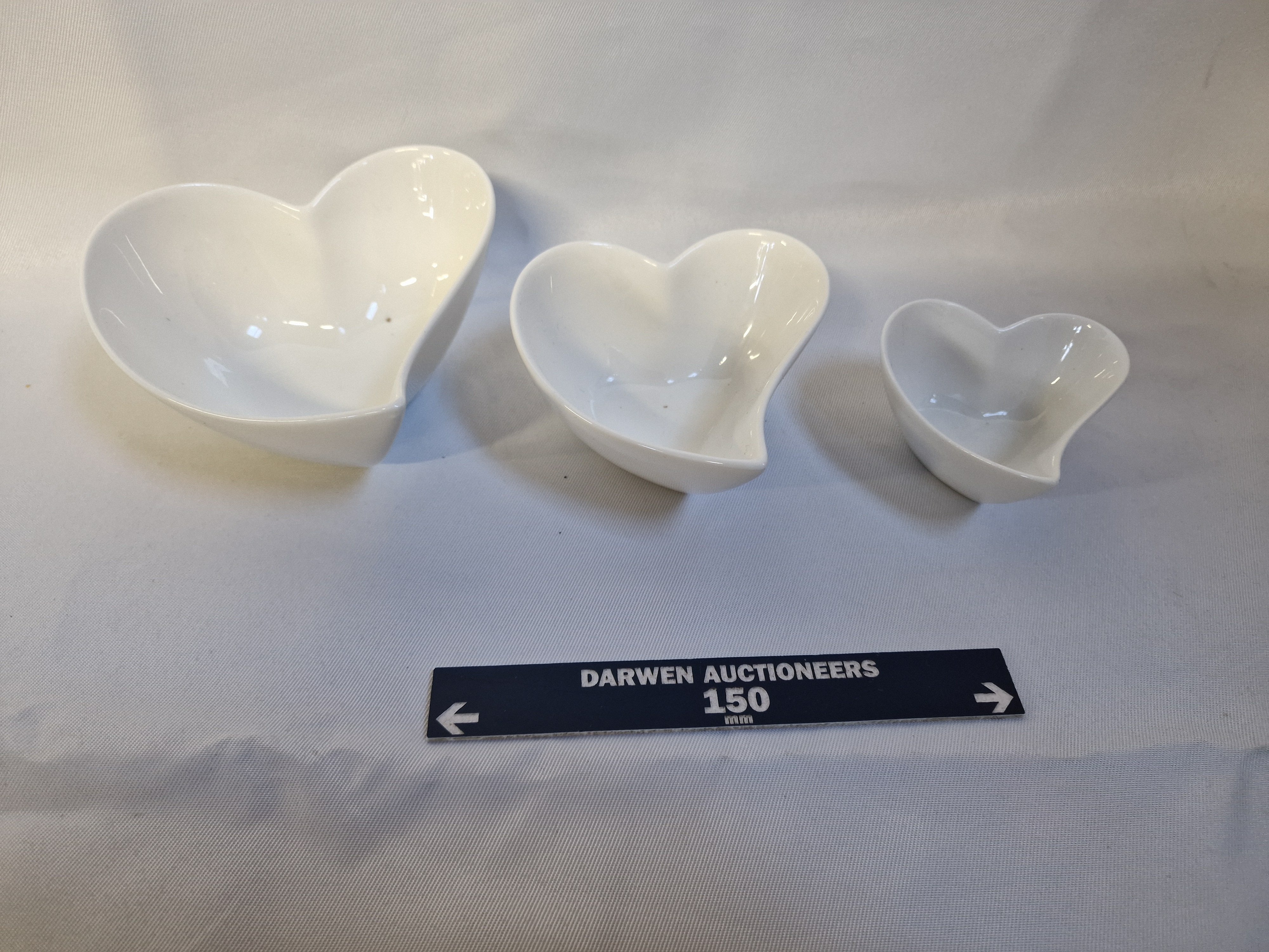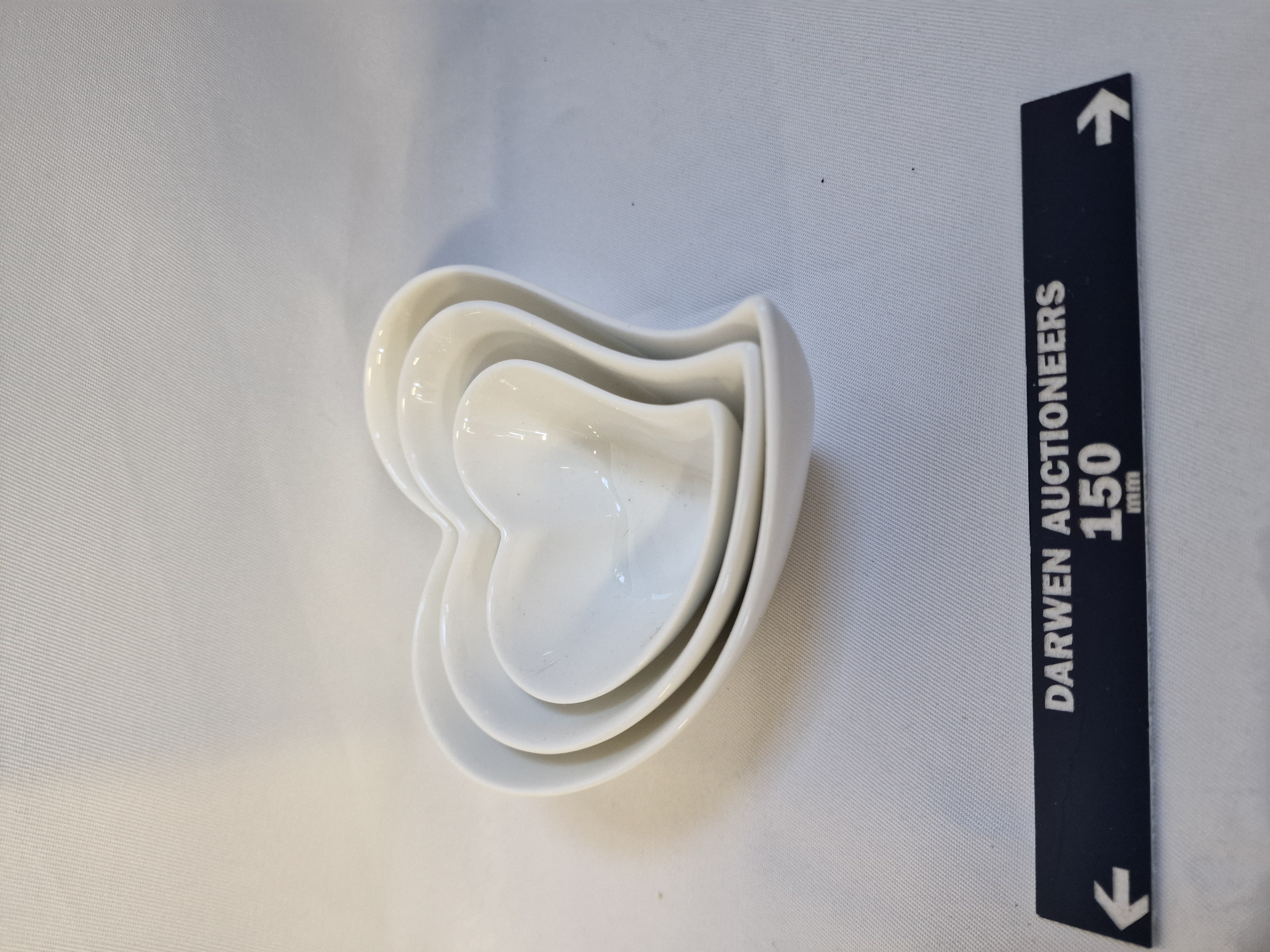 A trio of contemporary nesting dishes in an asymmetrical heart form. Each piece is constructed from white glazed ceramic with a smooth, undecorated finish. No factory marks or signatures are visible on the surfaces.