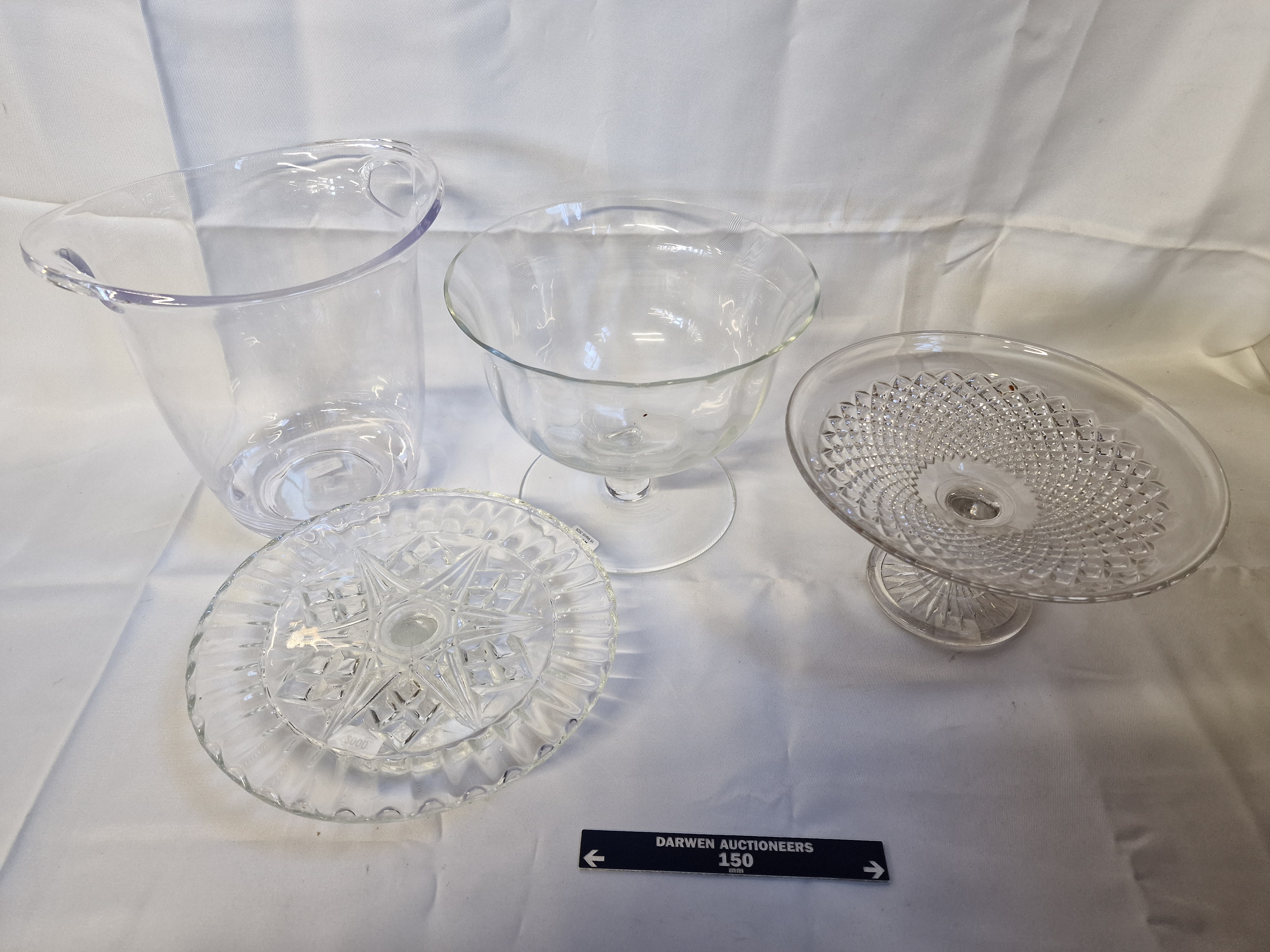 A group of four clear glass and lead crystal items, 20th century. The collection includes a moulded glass ice bucket with integrated side handles, a plain flared footed bowl, a pedestal tazza with deep-cut diamond facets and a star-cut foot, and a circular plate with a central starburst motif. Two pieces retain white adhesive labels with the digits 3000.