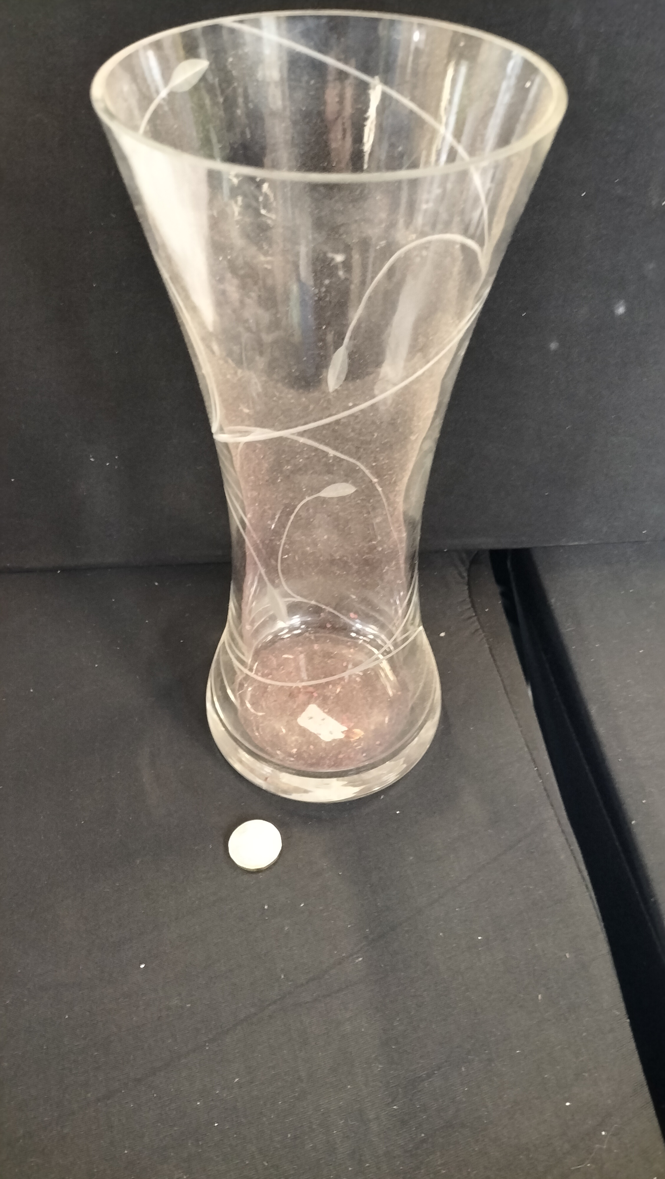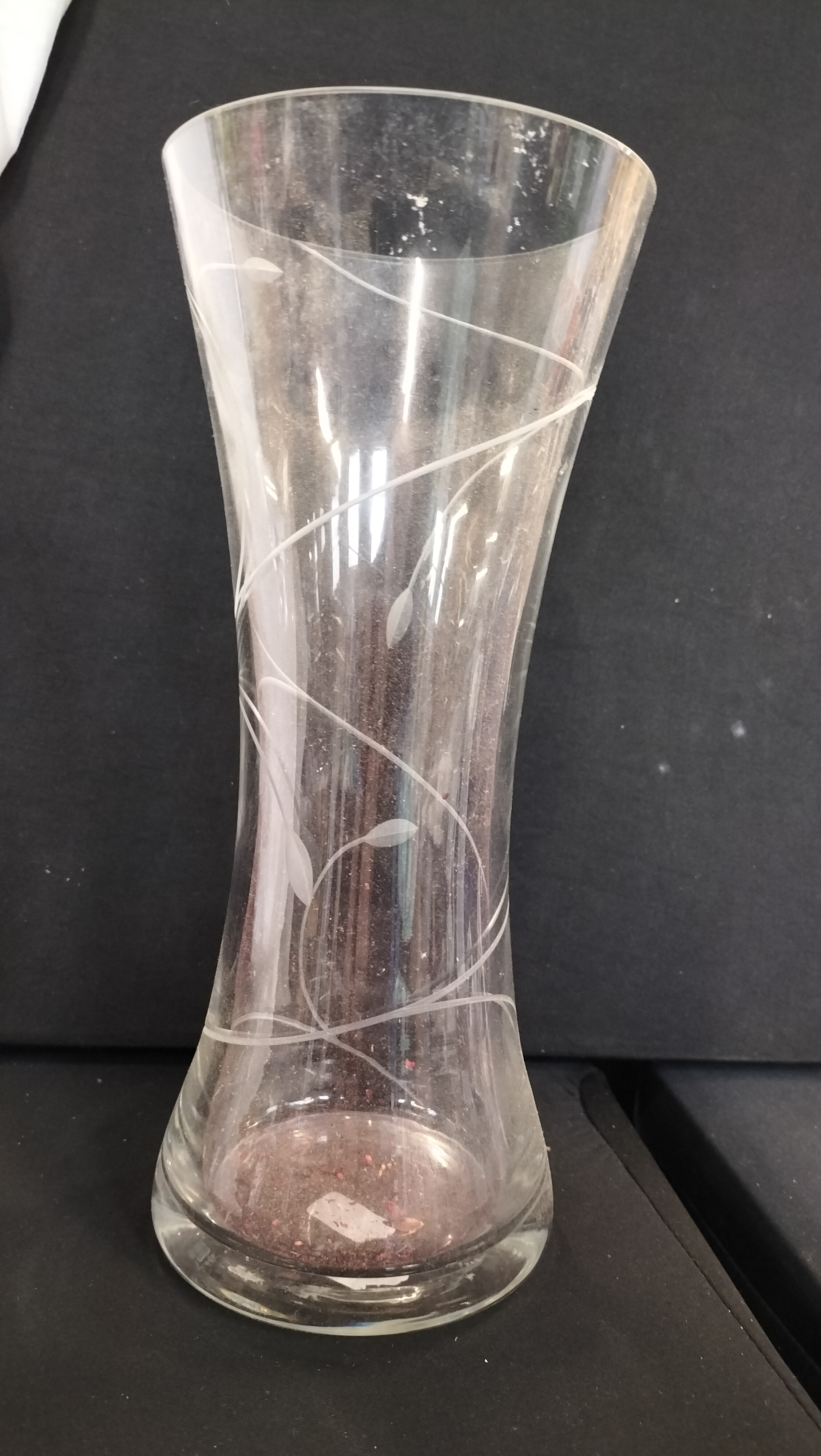 A contemporary clear glass vase of waisted hourglass form featuring a flared rim and a thick, weighted base. The exterior is decorated with an etched or frosted trailing vine and leaf design. No maker’s marks or signatures are visible on the body or base. The design and construction are consistent with contemporary commercial crystal production.
