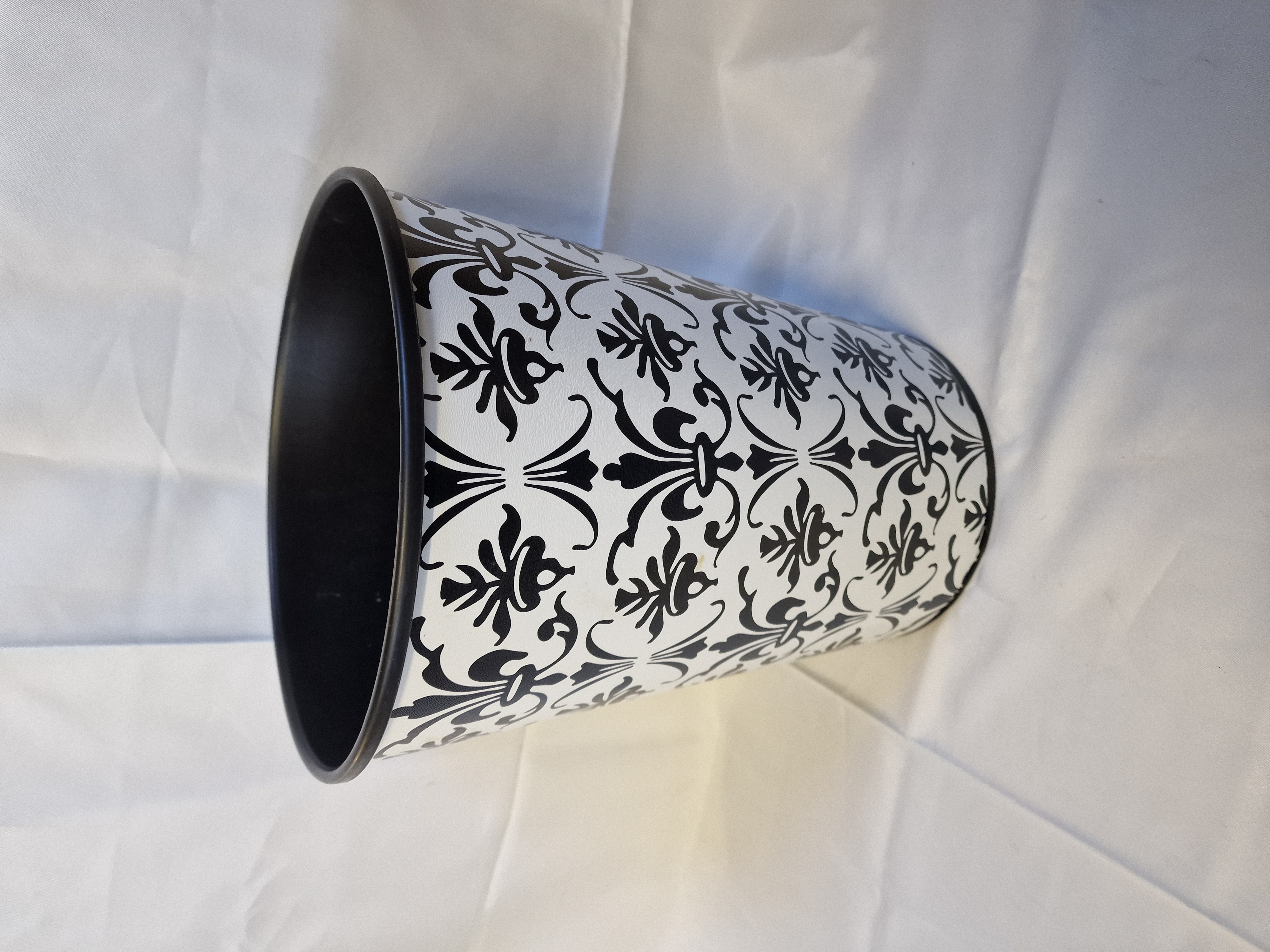 A tapered cylindrical wastepaper bin constructed from thin-gauge metal. The exterior features a monochromatic black-on-white damask floral pattern, while the interior and rolled top rim are finished in matte black. No maker’s marks or labels are visible on the exterior body.