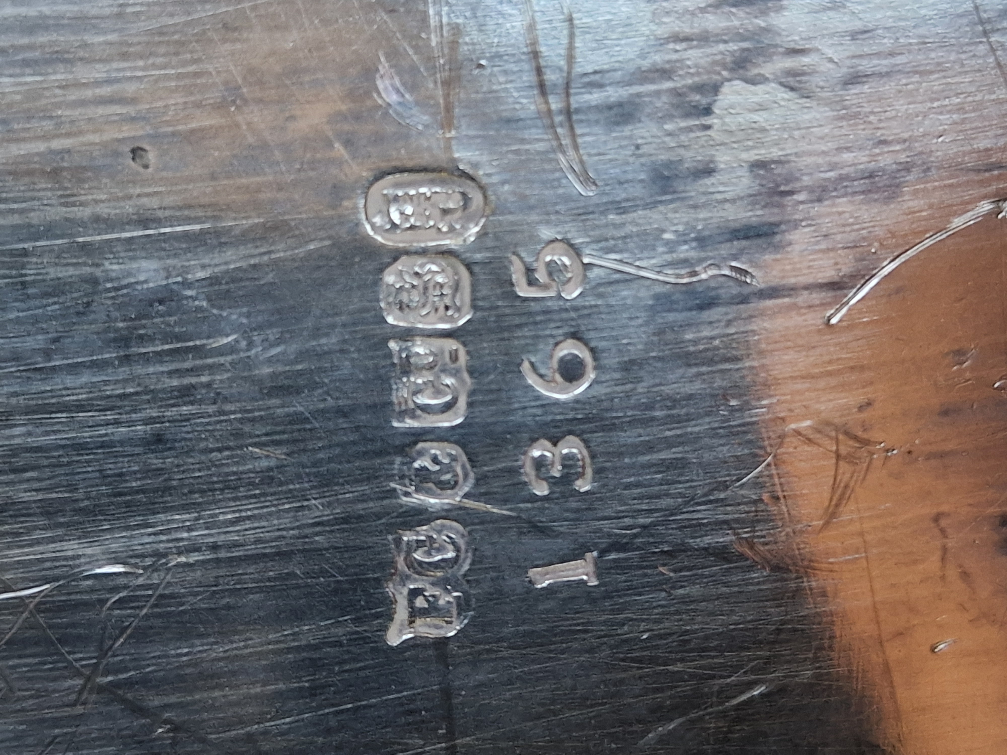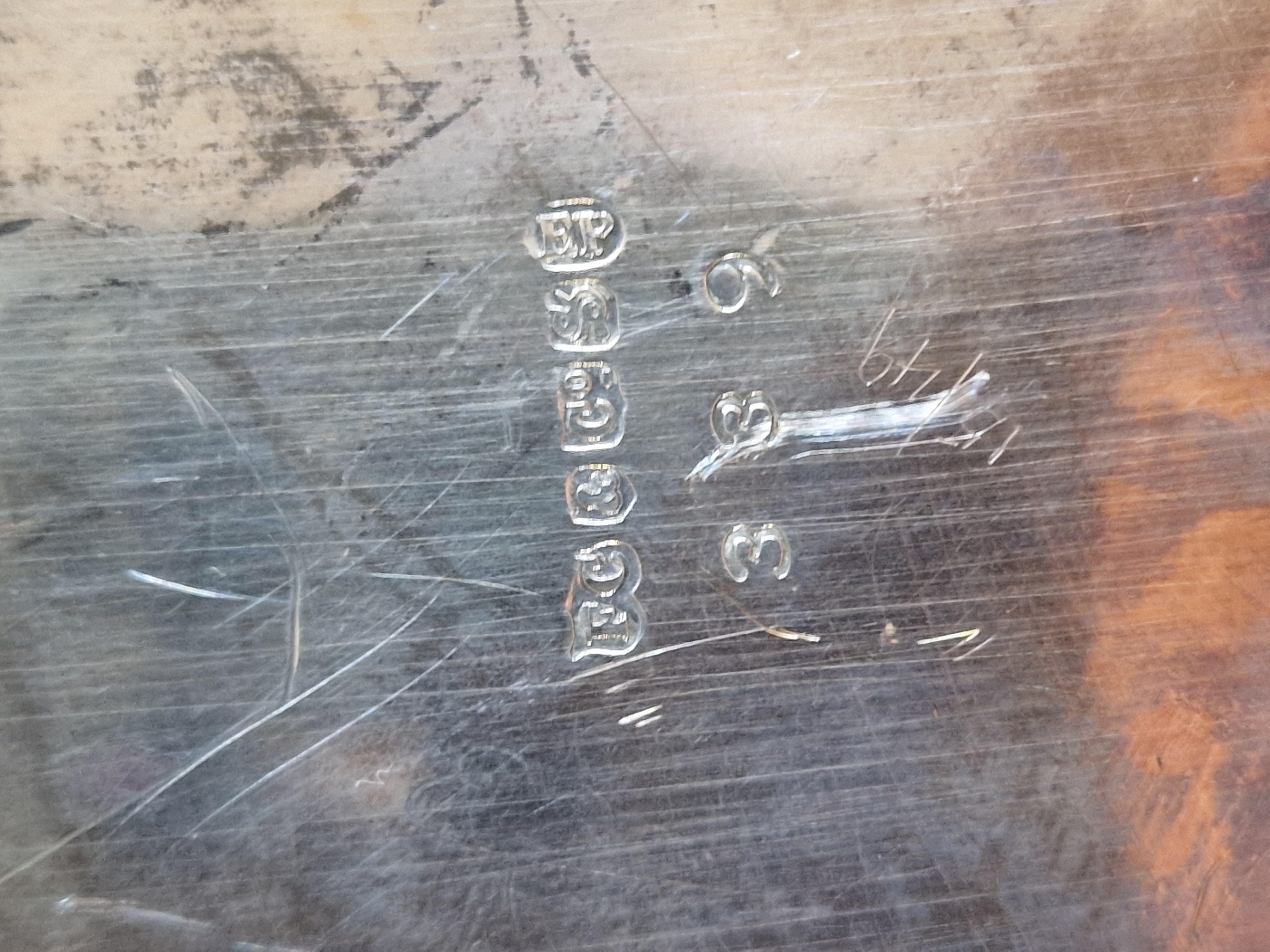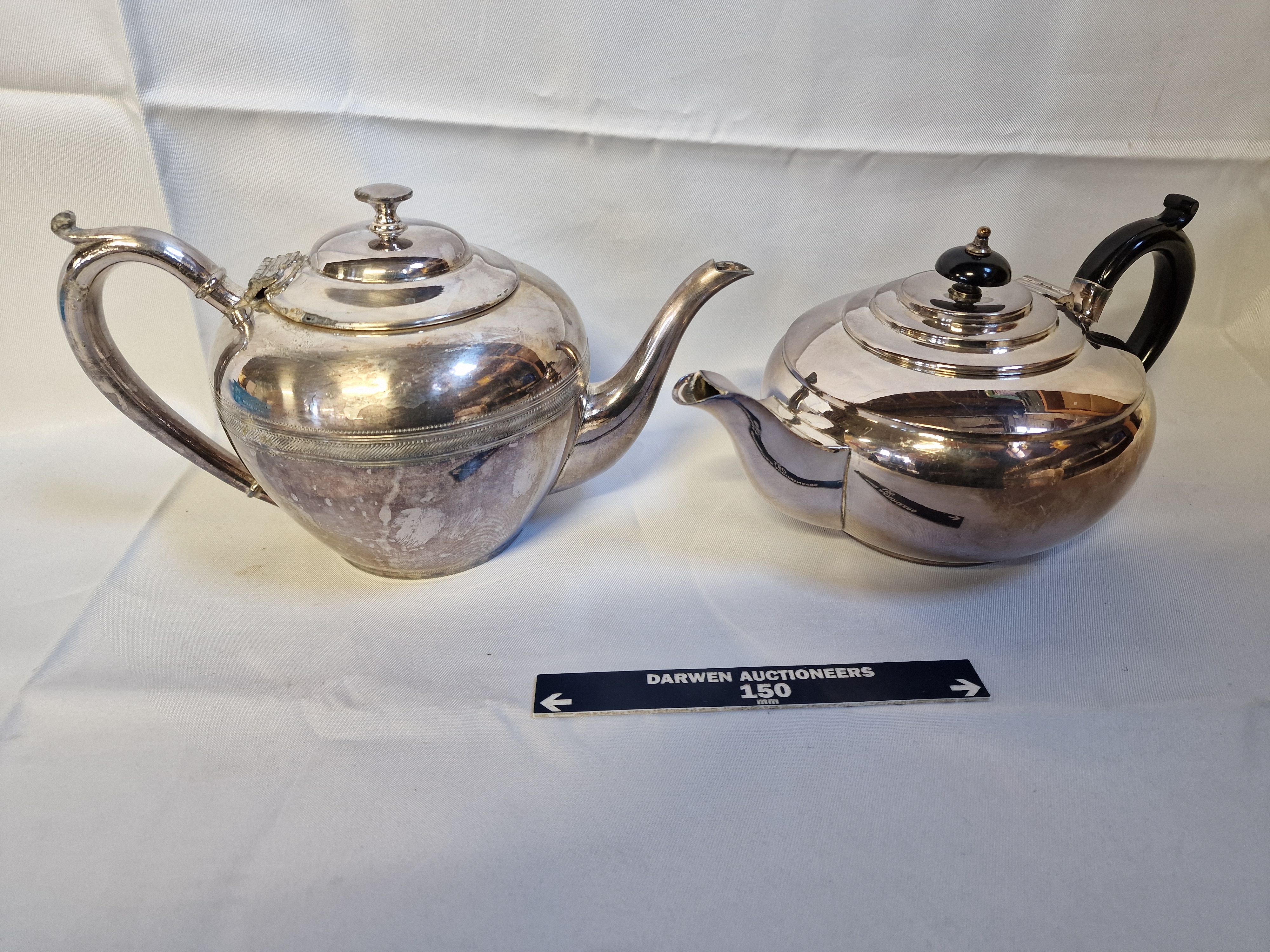 Two silver-plated teapots by E. Glass and Co, Birmingham, comprising a Victorian style bright-cut engraved example and an Art Deco style stepped shoulder example. Both are constructed from electroplated German silver, with the Victorian pot featuring a metal handle and the Art Deco pot a black composite handle. Bases are marked with E and G in a cartouche, individual shield punches for S, G, and B, pattern numbers 633 and 1365, and additional EP or crown symbols.