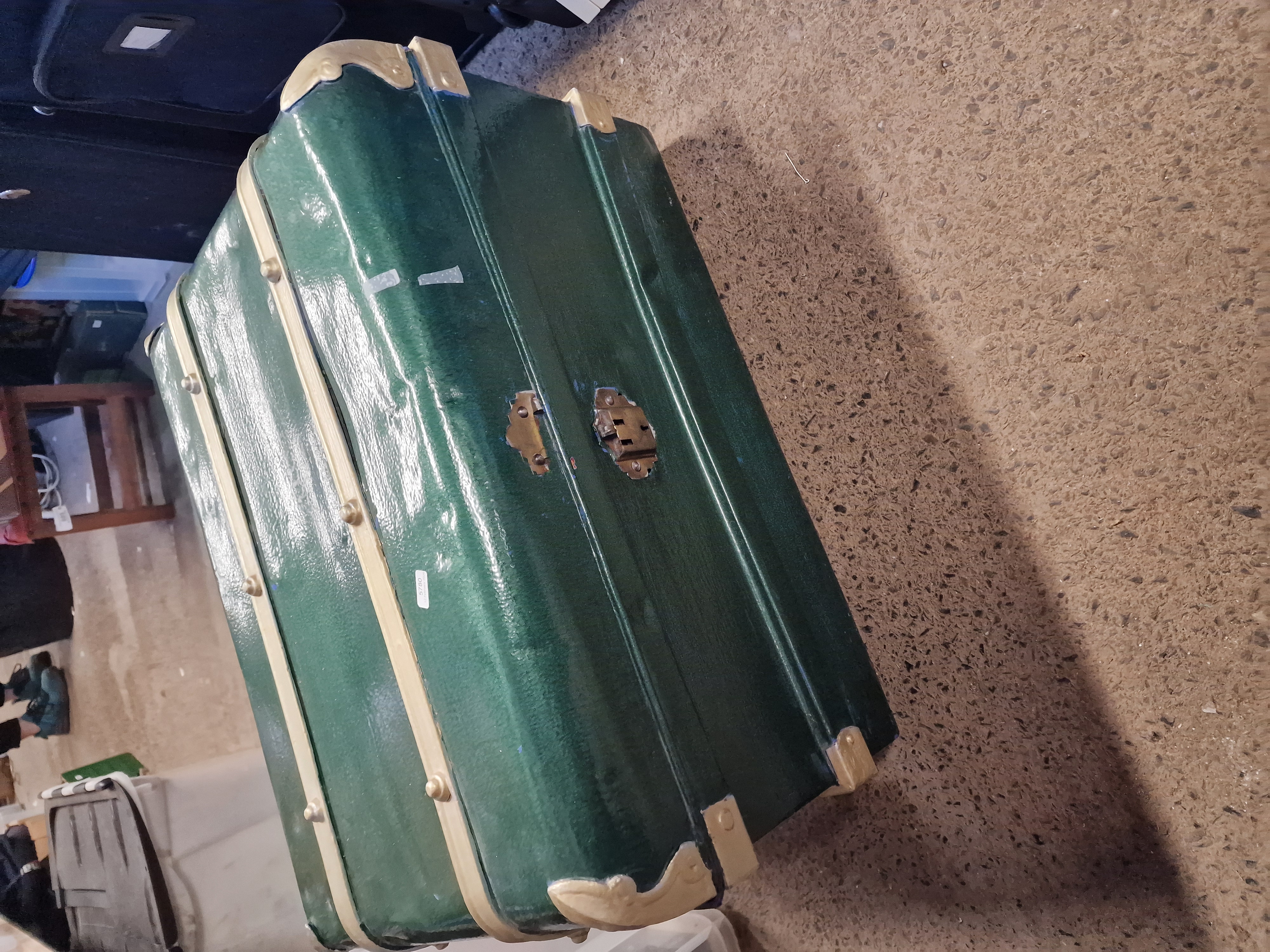 A mid-20th century Concourse storage trunk featuring a domed-top silhouette and sheet metal construction over a wooden frame. The exterior is fitted with longitudinal strengthening bands, reinforced corner plates, and a central brass-toned lock plate with flanking latches. The interior is open and finished in a contrasting high-gloss paint.