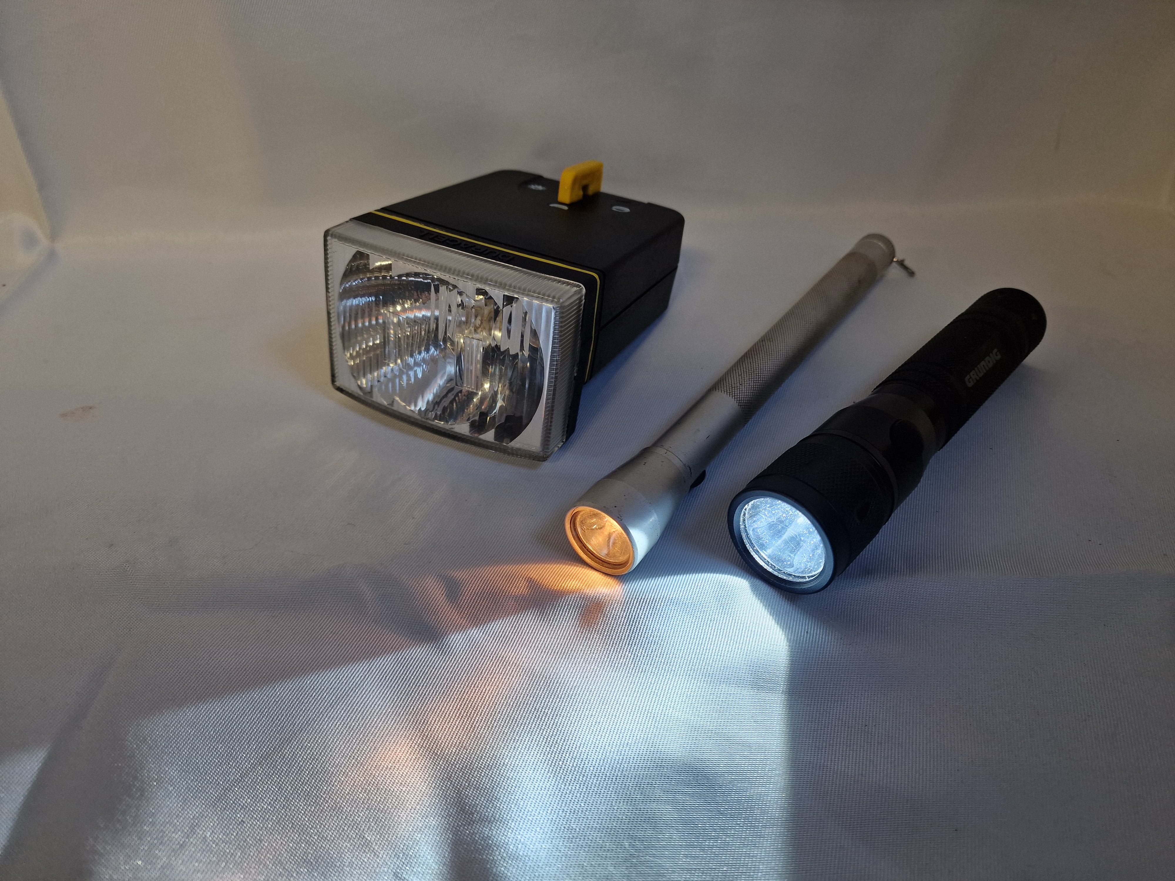 Three portable torches including Duracell and Grundig examples. The group comprises a black plastic Duracell lantern with a rectangular lens and yellow slide switch, a silver-tone metal torch with a knurled grip, and a black Grundig torch. Visible brand markings are present on the lantern and the black cylindrical torch barrel.