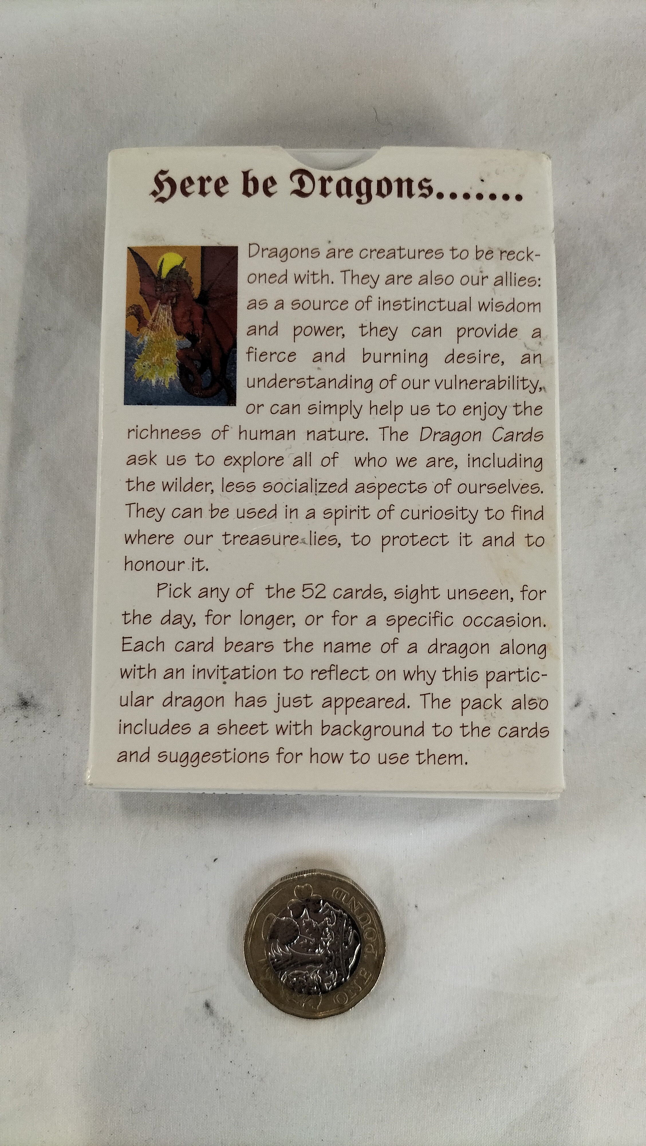 A boxed set of Dragon Cards, an oracle-style deck designed for self-reflection and inspiration by Polly Waterfield. The collection consists of 52 cards, each featuring a specific dragon name and an invitation to reflect, accompanied by a background and instructional sheet. The front of the box displays a colour illustration of a red dragon breathing fire, signed Brian Nobbs 01. The reverse of the box contains descriptive text regarding the use of the cards for exploring instinctual wisdom and power. The deck is housed in its original white cardstock box. A United Kingdom one pound coin is shown in the images for scale purposes.
