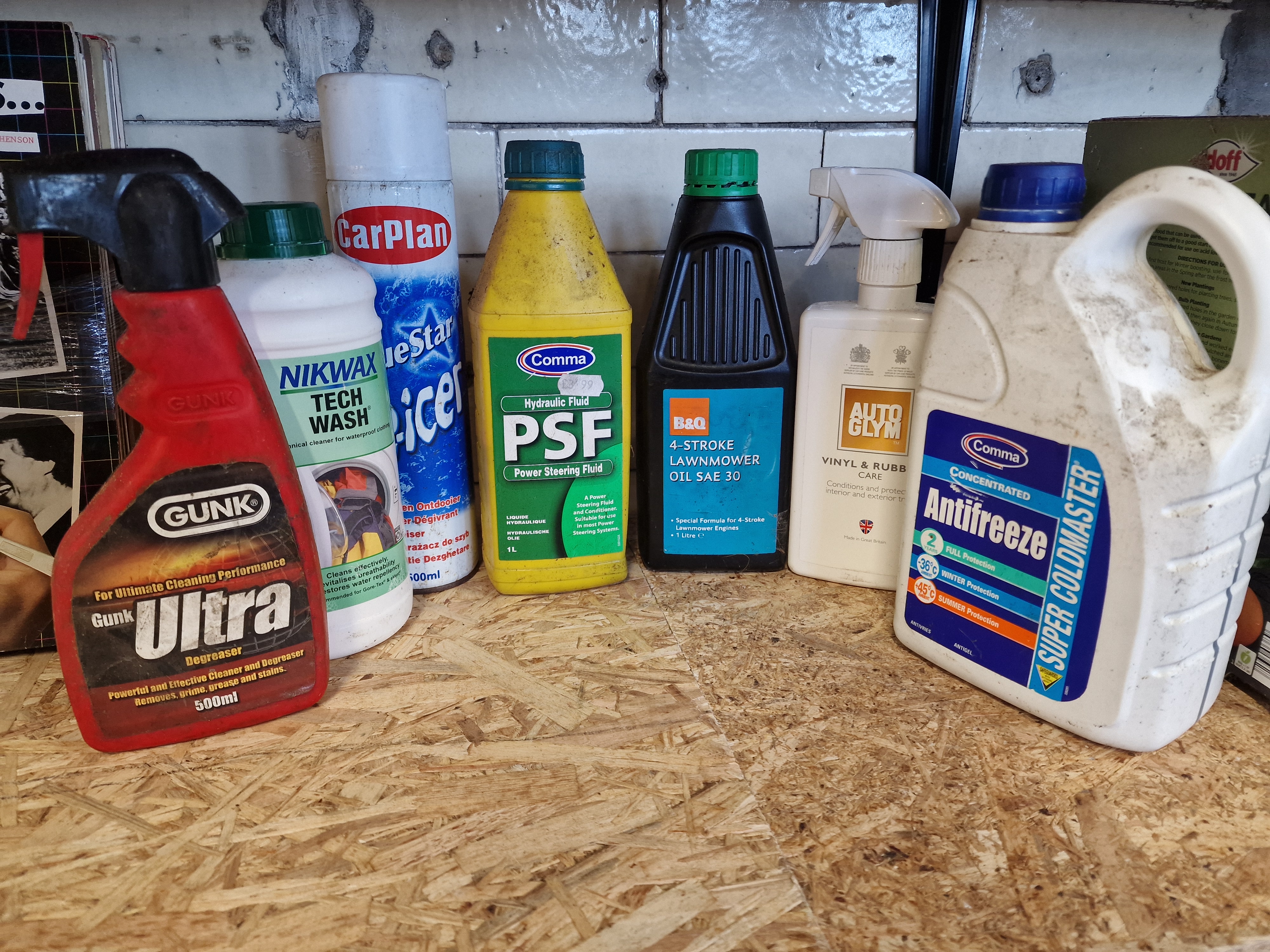 An assortment of seven maintenance fluids featuring Comma Super Coldmaster antifreeze and coolant concentrate for engine systems. The collection includes Comma PSF power steering fluid, Gunk Ultra degreaser, Autoglym Vinyl and Rubber Care, Nikwax Tech Wash, CarPlan Blue Star de-icer, and B&Q SAE 30 4-stroke lawnmower oil. Items are contained in original plastic bottles and an aerosol canister, with volumes including 500ml and 1-litre units.
