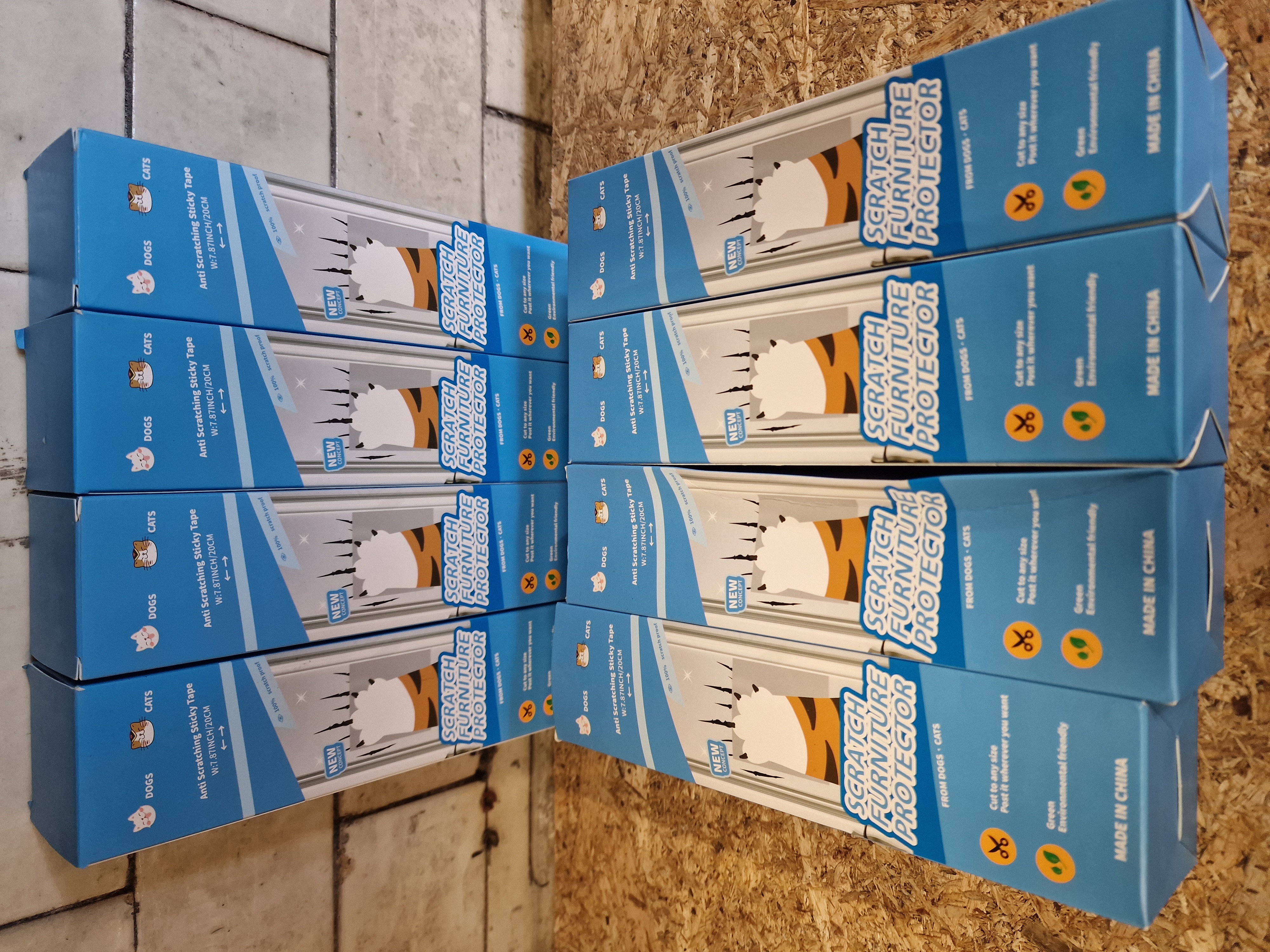 Eight boxes of New Concept anti-scratching sticky tape for furniture protection, contemporary. The product is designed to prevent pet damage and features a width of 20cm. Each unit is housed in original retail cardboard packaging marked Made in China.