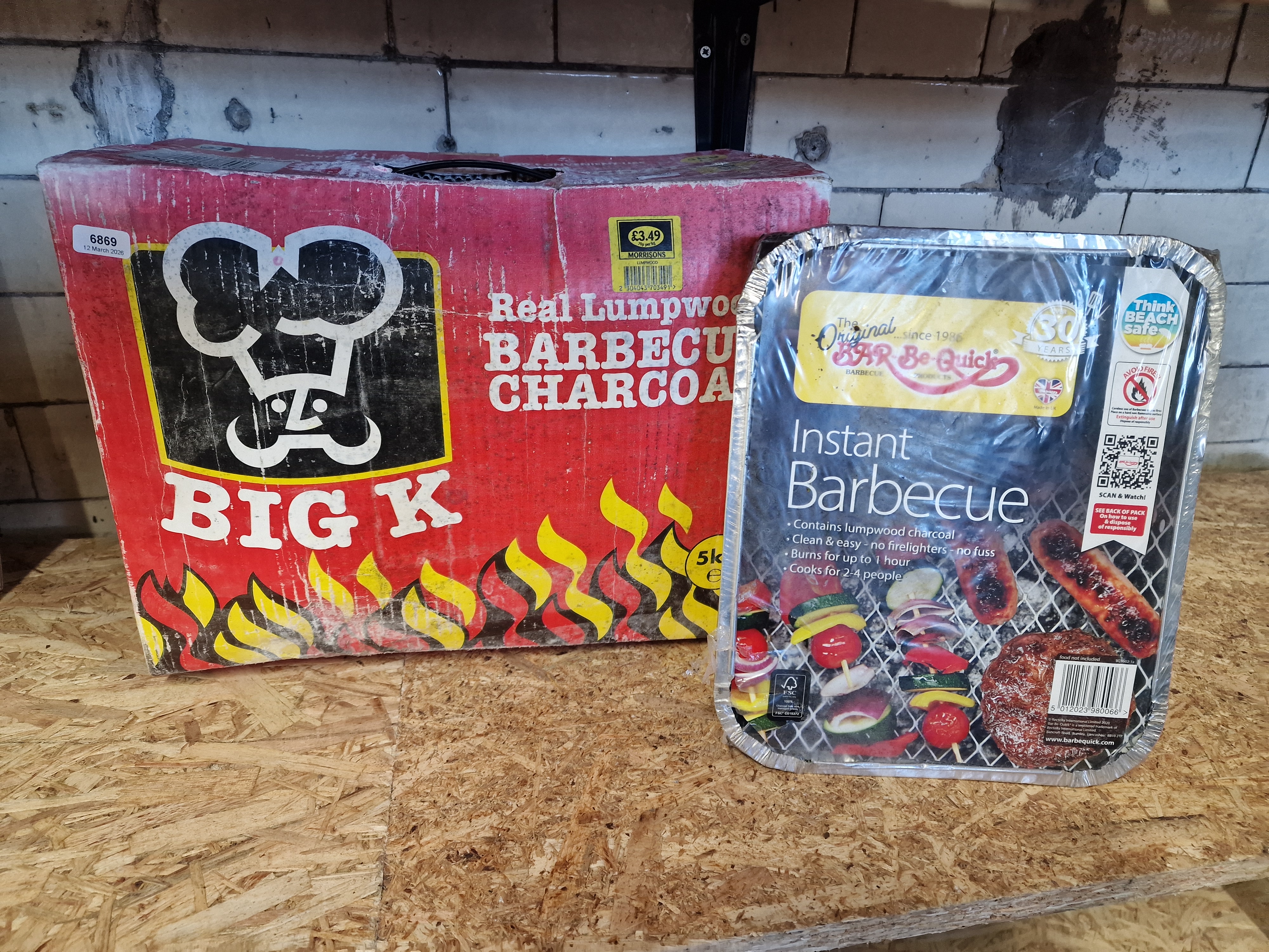 Big K and Bar-Be-Quick barbecue supplies. The lot includes one 5kg box of Big K Real Lumpwood Barbecue Charcoal and one Bar-Be-Quick Instant Barbecue unit. The instant barbecue is an all-in-one foil tray unit with an integrated wire grill, while the charcoal is supplied in a cardboard carry box.