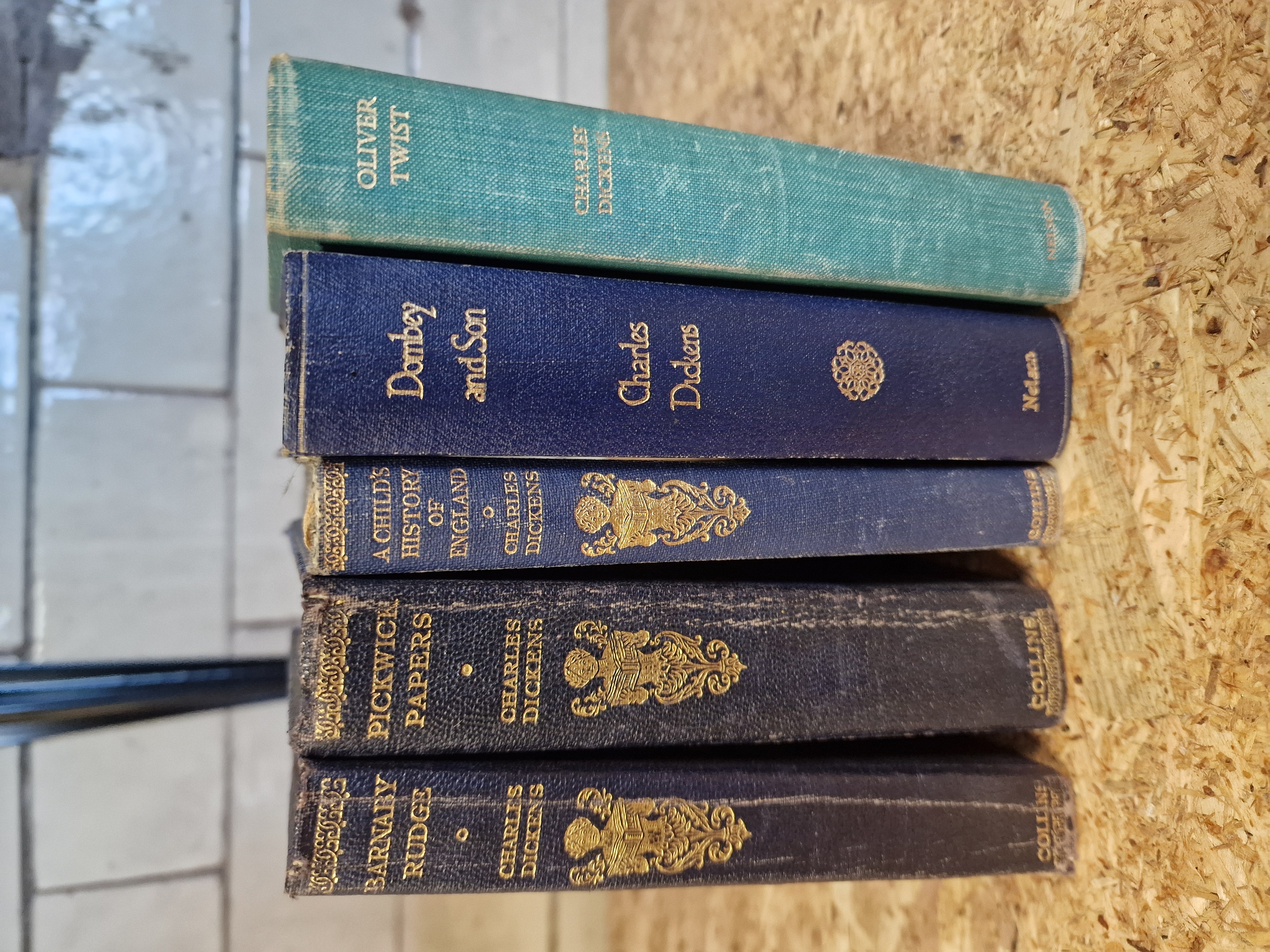 An assortment of duodecimo (12mo) size pocket-edition works by Charles Dickens, published by Thomas Nelson and Sons and Collins. The volumes are bound in publisher’s cloth of teal and dark blue, featuring gilt-stamped titles and decorative spine motifs, lacking dust jackets. Included titles are Oliver Twist, Dombey and Son, A Child’s History of England, Pickwick Papers, and Barnaby Rudge.