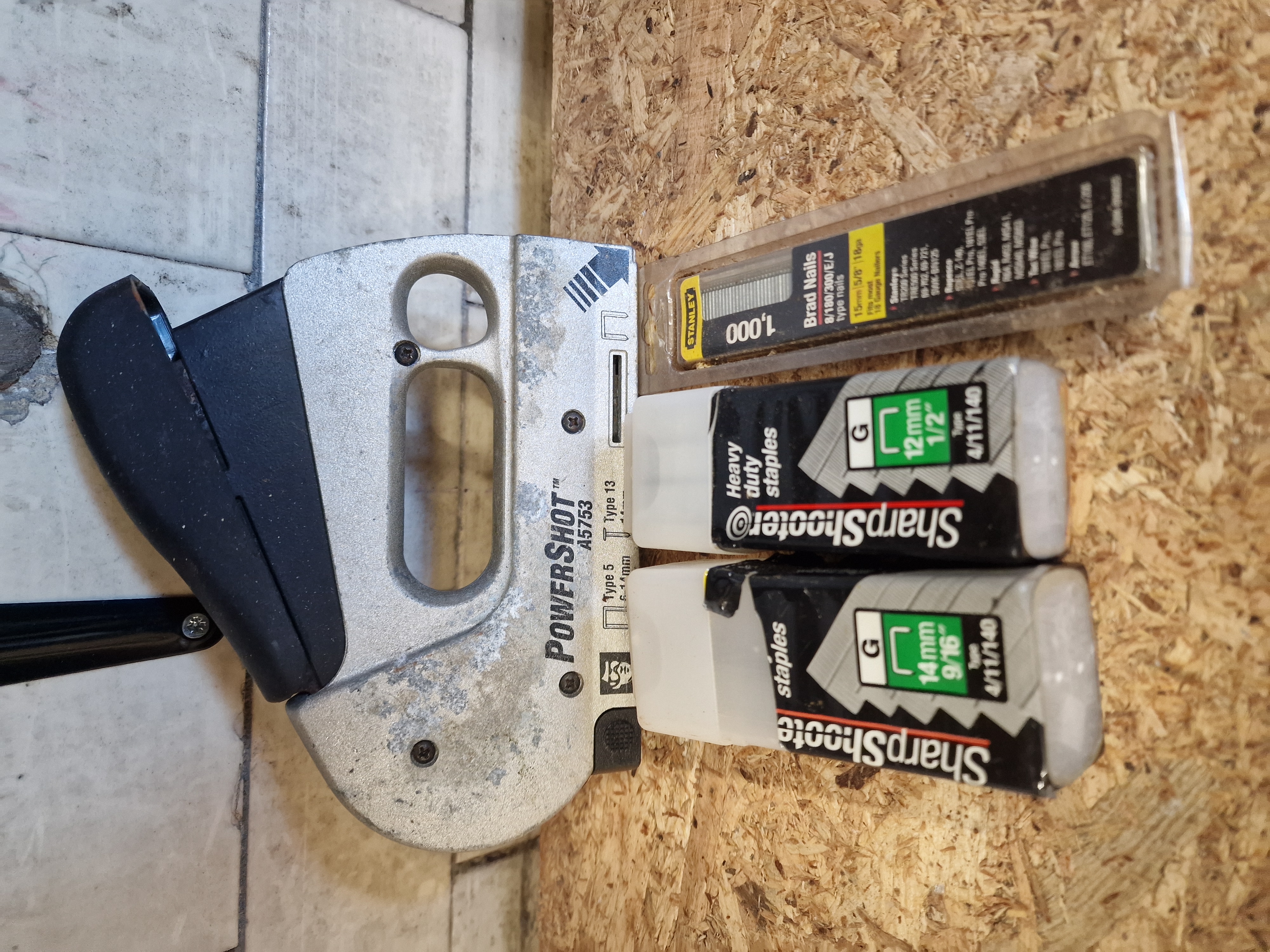 PowerShot model A5753 manual heavy-duty staple and brad nail gun, contemporary. Cast metal body with a black composite handle grip, featuring forward-action drive technology. Includes an assortment of fasteners comprising Stanley 15mm brad nails, SharpShooter 12mm staples, and SharpShooter 14mm staples. Marked with model number A5753 and compatible fastener types 5, 13, and 53.