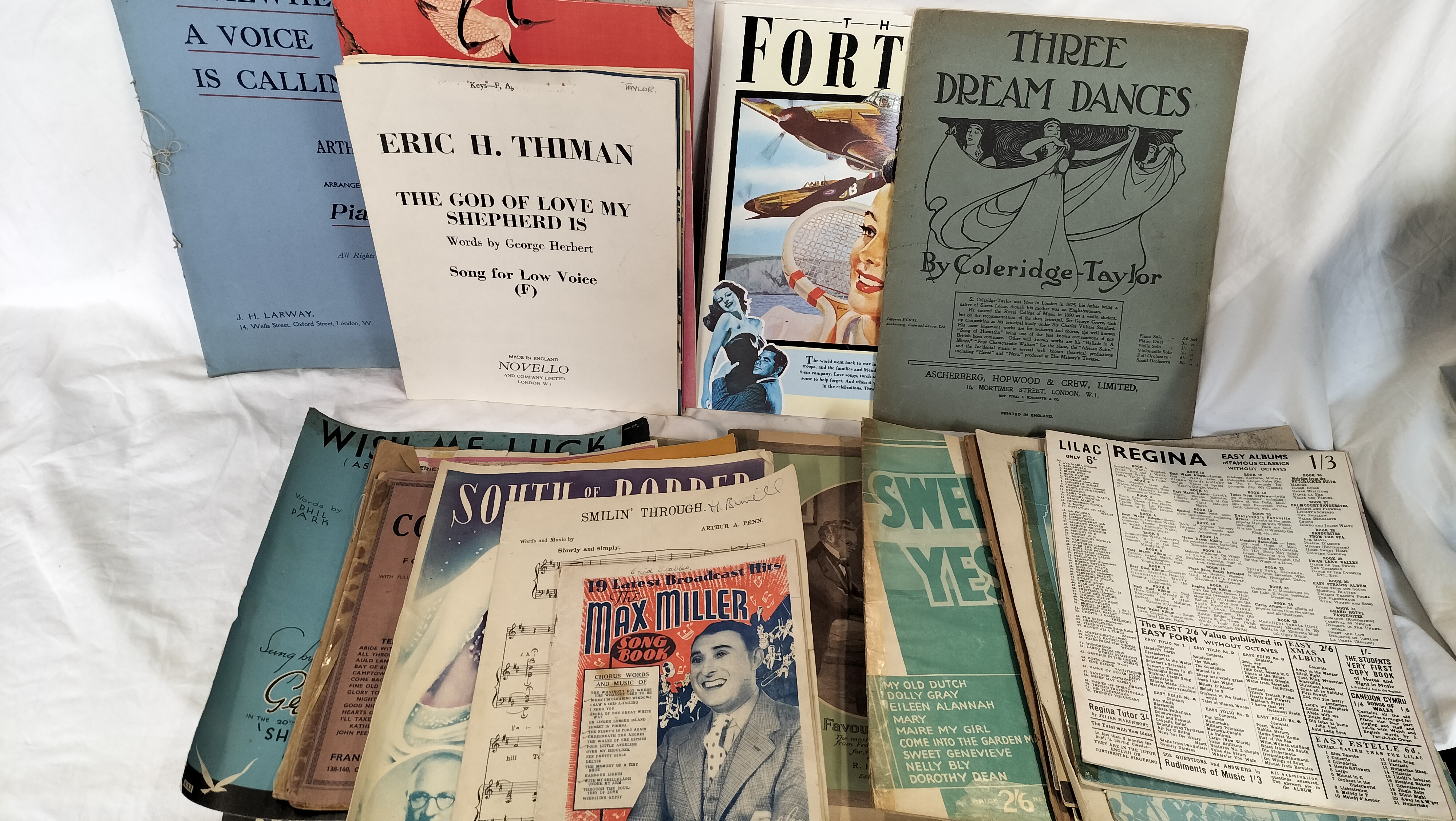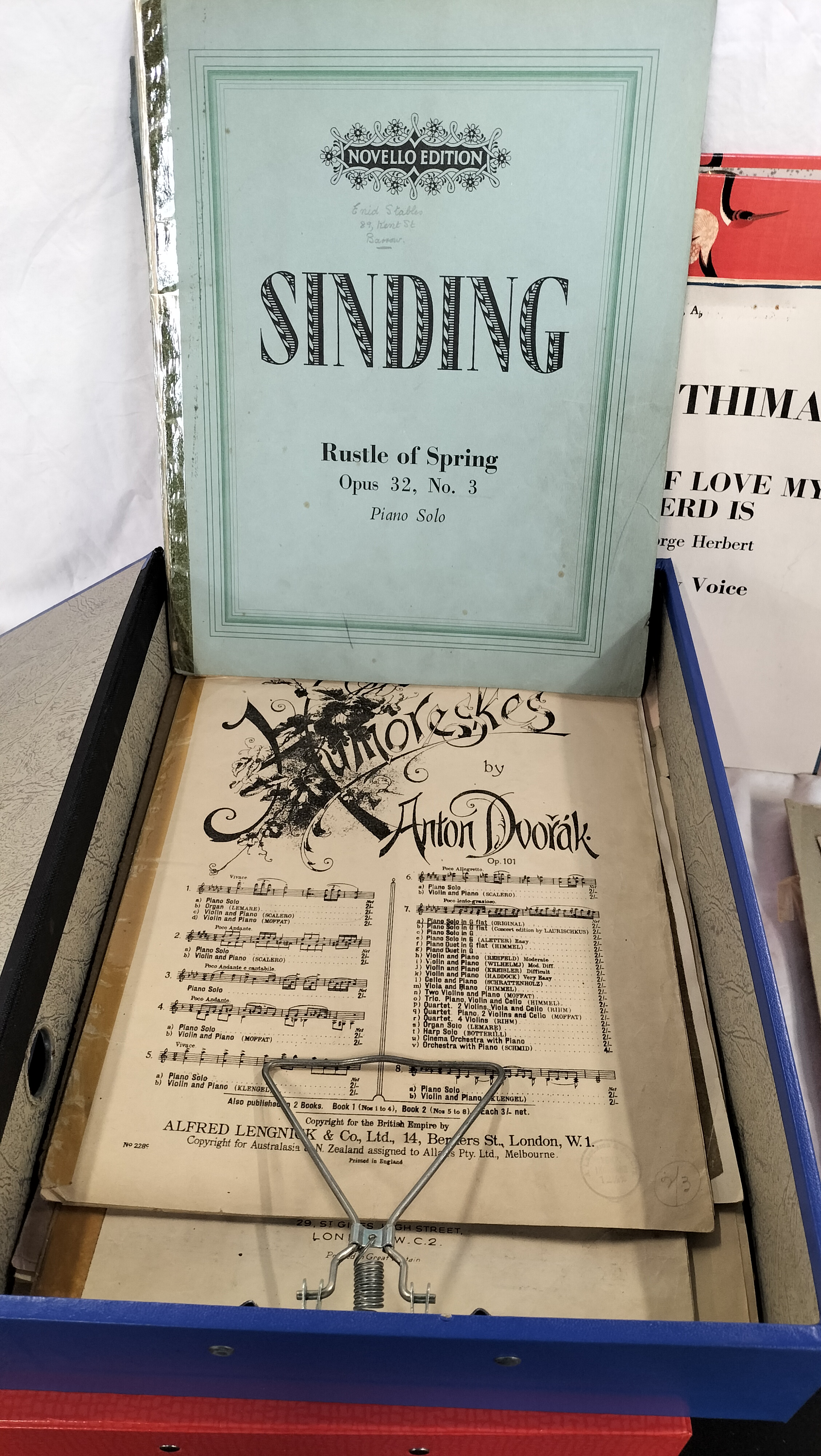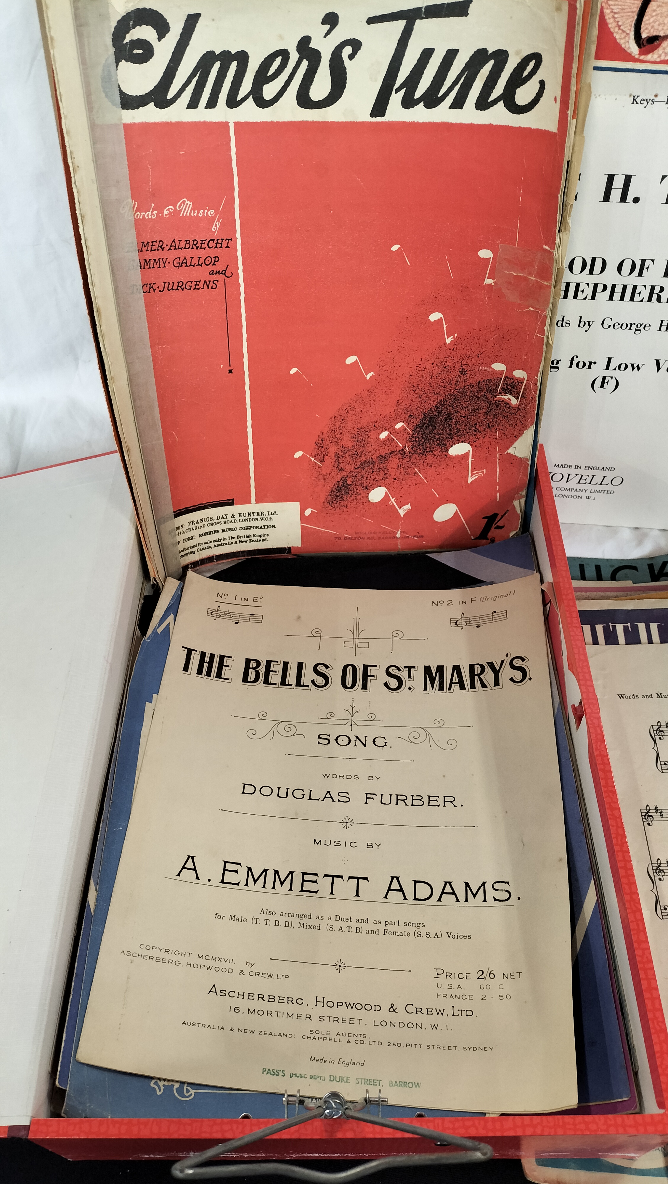 An assortment of sheet music, songbooks, and music folios, primarily dating from the 1920s to the 1950s. The collection is housed within two modern ring binders, one red and one blue. Notable publishers represented include Novello and Co., Ascherberg, Hopwood & Crew, Alfred Lengnick, and Francis, Day & Hunter. The contents feature a range of classical and popular works, including Coleridge-Taylor’s Three Dream Dances, Eric H. Thiman’s The God of Love My Shepherd Is, and A. Emmett Adams’ The Bells of St Mary’s (copyright 1917). Also present are Christian Sinding’s Rustle of Spring (Novello Edition), Anton Dvořák’s Humoreskes Op. 101, the Max Miller Song Book, and Elmer’s Tune. Many pieces bear the retail stamp of Pass’s (Music Dept.), Duke Street, Barrow, and several feature handwritten ownership inscriptions for Enid Stables of 89 Kent Street, Barrow. The items range in size from octavo songbooks to quarto-sized sheet music.