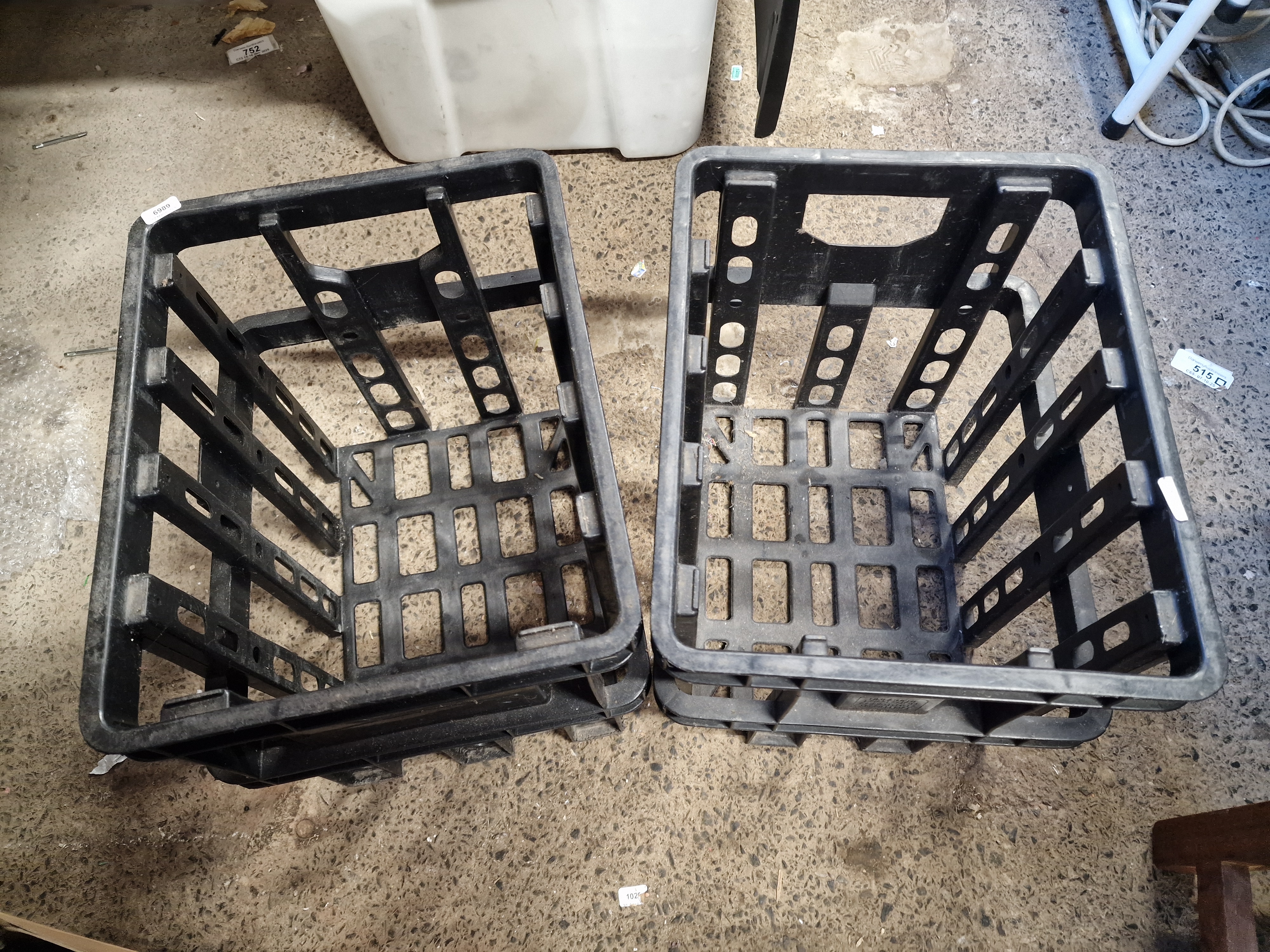 A pair of industrial-style storage crates, commonly referred to as milk crates. Constructed from heavy-duty black plastic with an open-grid lattice design and integrated handles moulded into the upper rim. Features include moulded side panels with illegible markings and small white identification labels numbered 6989 and 515.