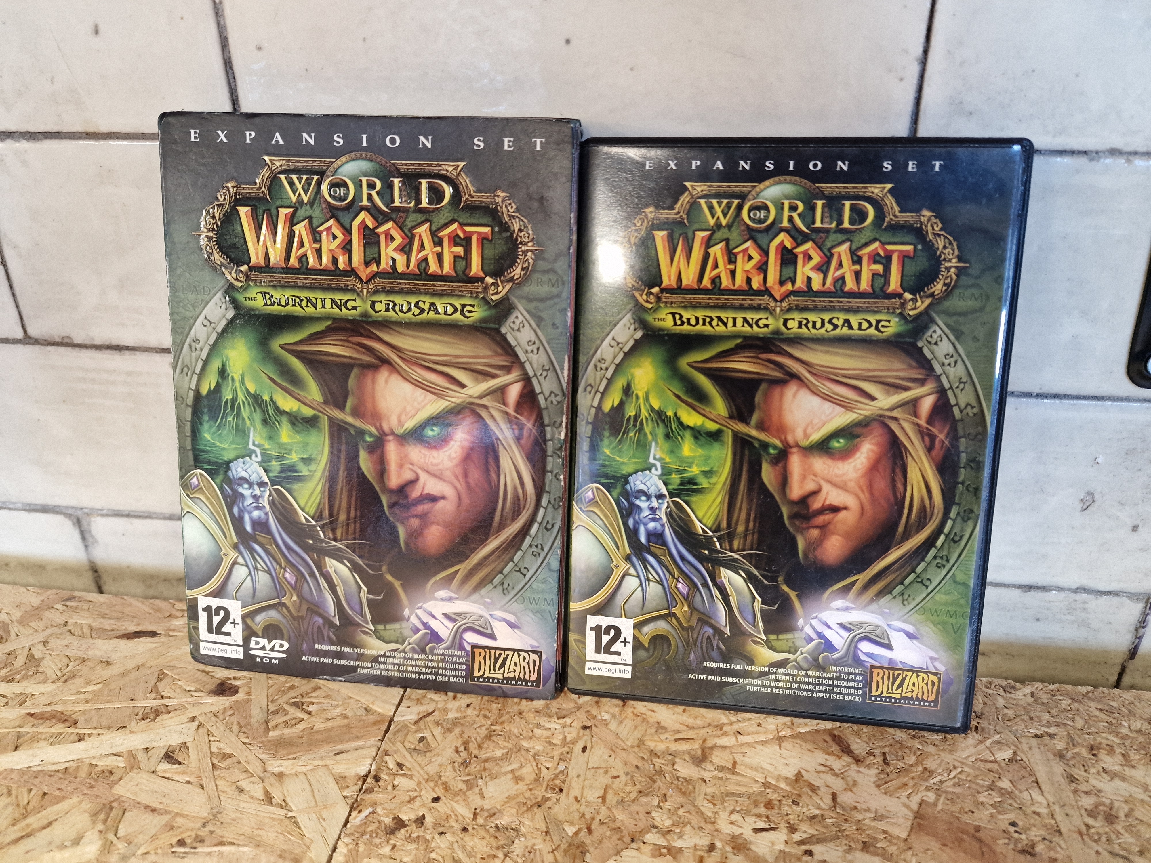 A pair of World of Warcraft: The Burning Crusade expansion sets for PC, produced by Blizzard Entertainment circa 2007. One example includes the original cardboard slipcase with metallic-style lettering over a plastic DVD case, while the other is a standard plastic DVD case. Both items feature the iconic cover art depicting Blood Elf and Draenei characters and are in DVD-ROM format.