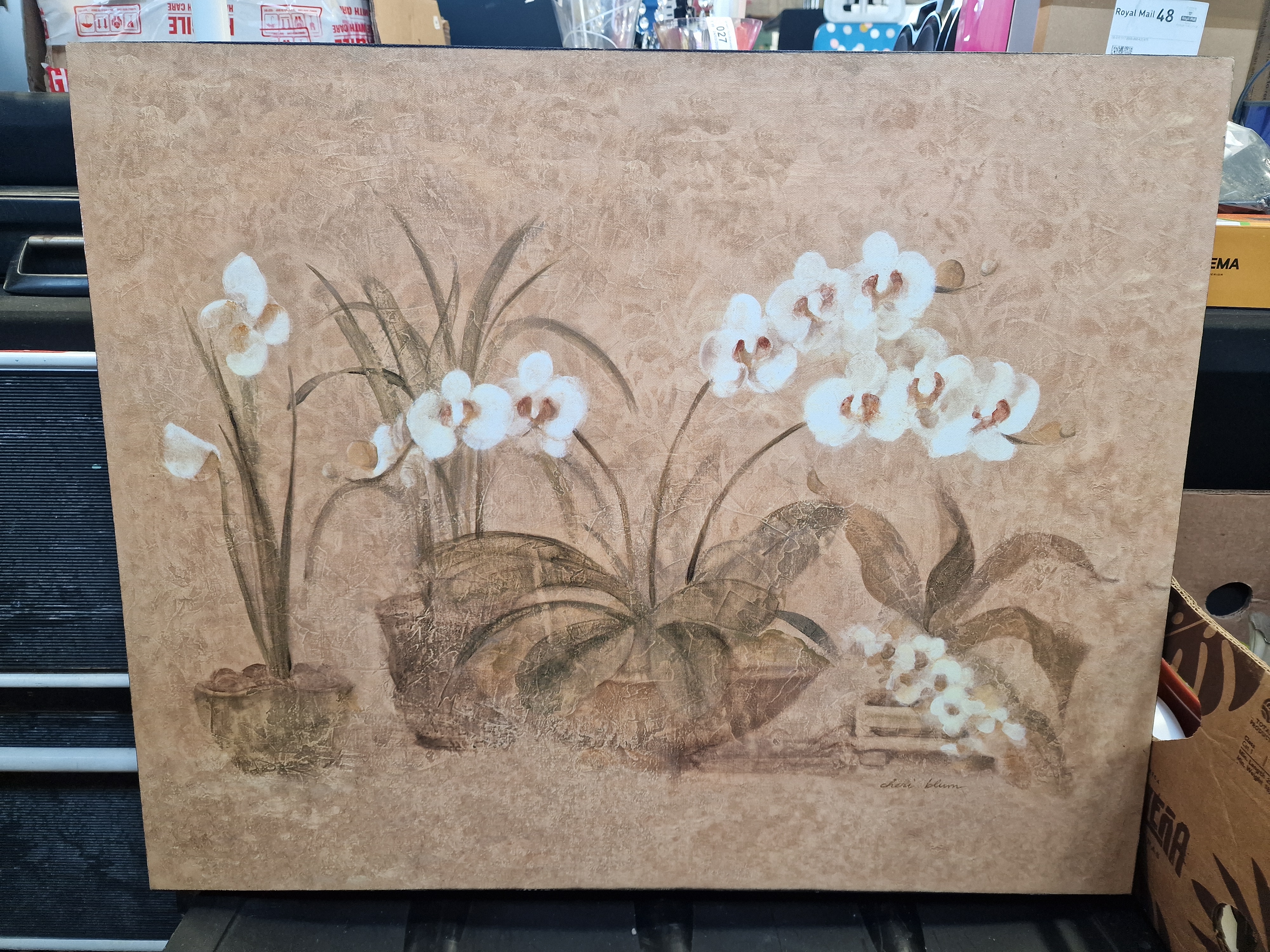 Cheri Blum (American, 1969-2003), Four Potted Orchids, contemporary botanical study. The work is executed in acrylic or mixed media on stretched canvas, featuring white orchids with tan centres against a mottled, earth-toned background with gestural foliage. Signed cheri blum in the lower right corner.