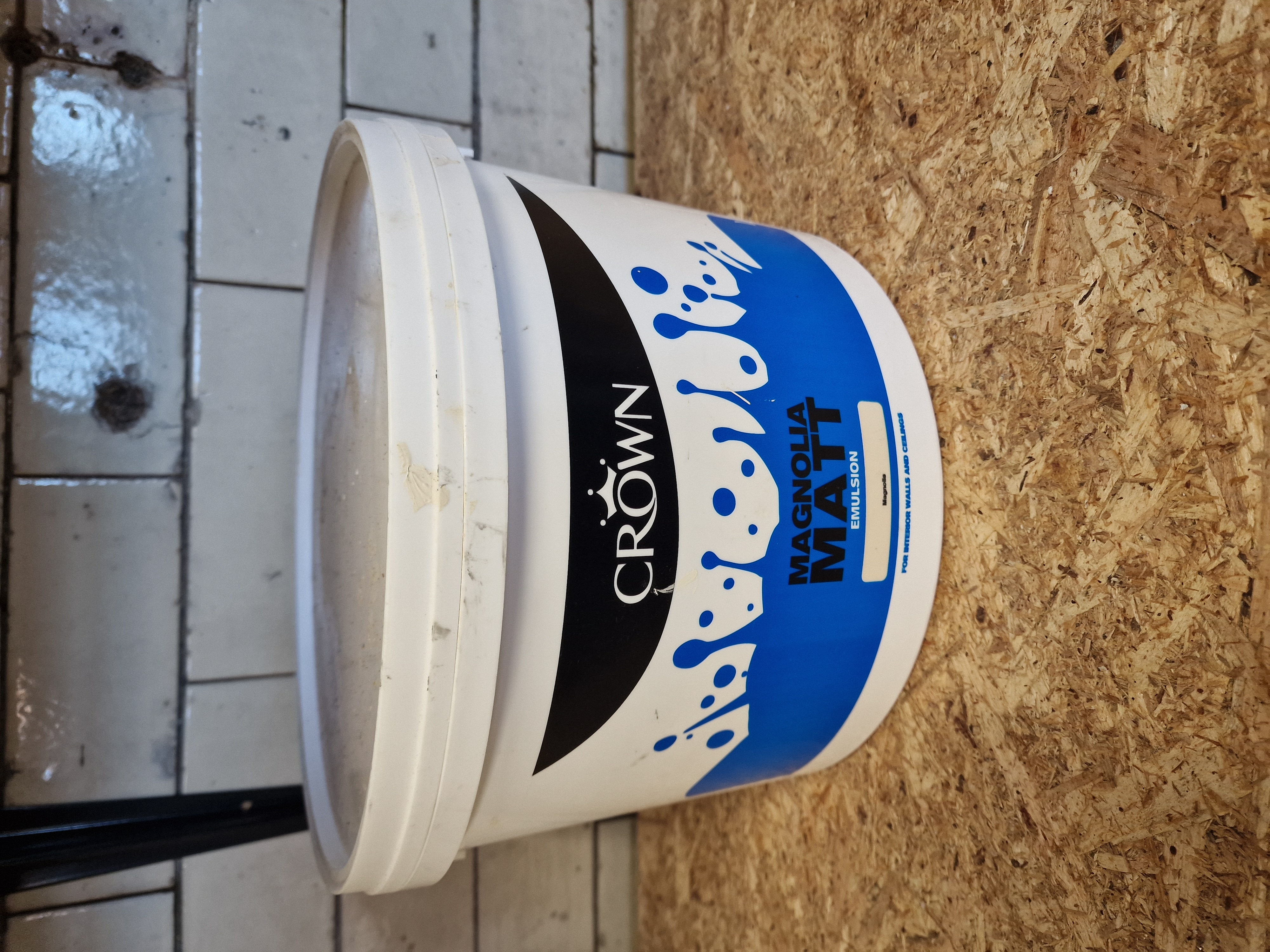 Crown Magnolia Matt Emulsion interior wall and ceiling paint. The product is housed in a single white plastic tub with printed brand markings and product identification. This water-based emulsion is formulated for application on interior masonry and plaster surfaces.