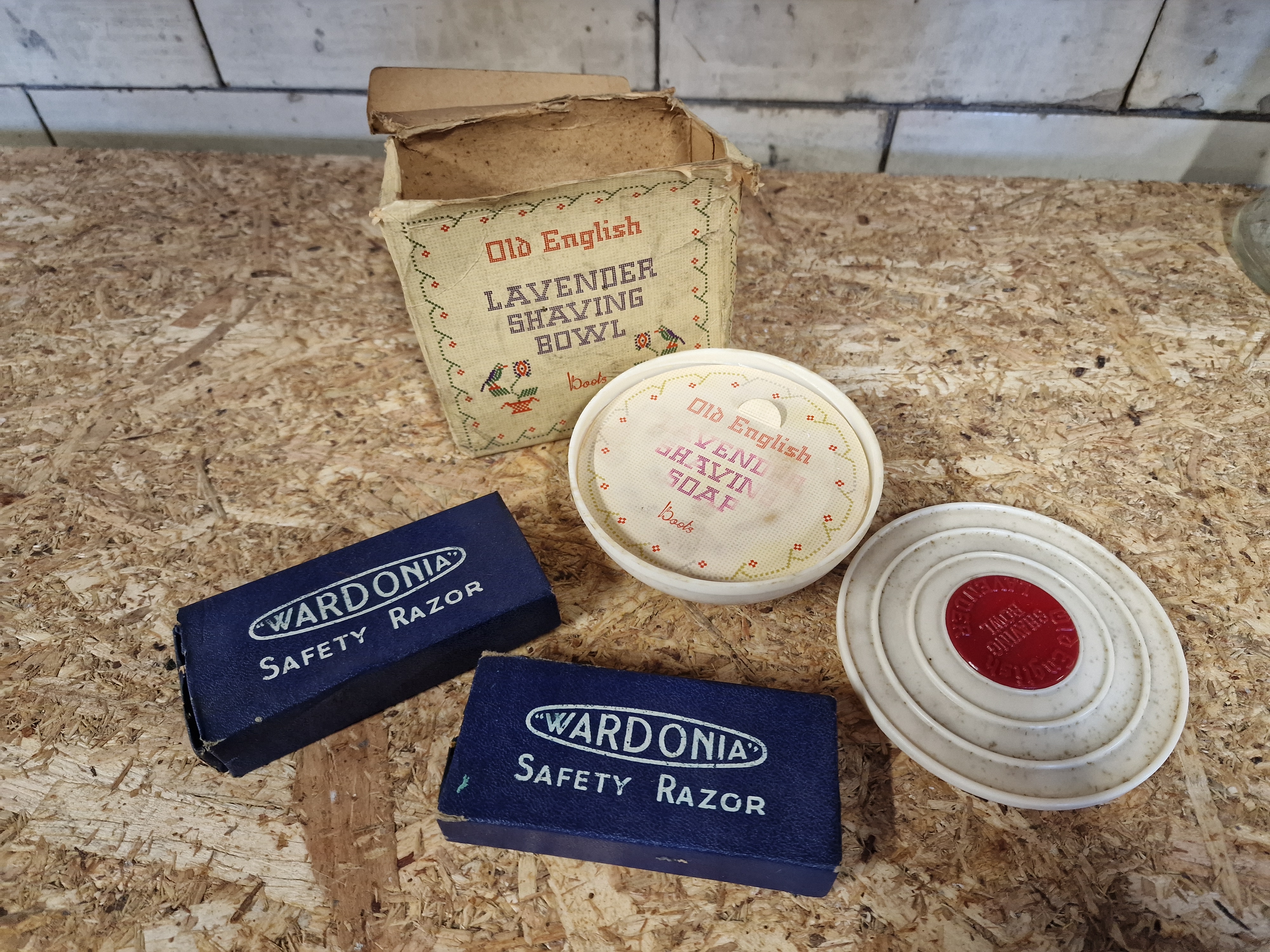 A collection of mid-20th century British grooming items, featuring Wardonia safety razor boxes and a Boots Old English lavender shaving bowl set. The shaving bowl is constructed from white urea-formaldehyde with a concentric-ring lid and red central medallion, containing an unused soap puck in its original paper wrapper. The items include original decorative cardboard packaging and blue cardboard boxes printed with the Wardonia brand mark inside an oval.