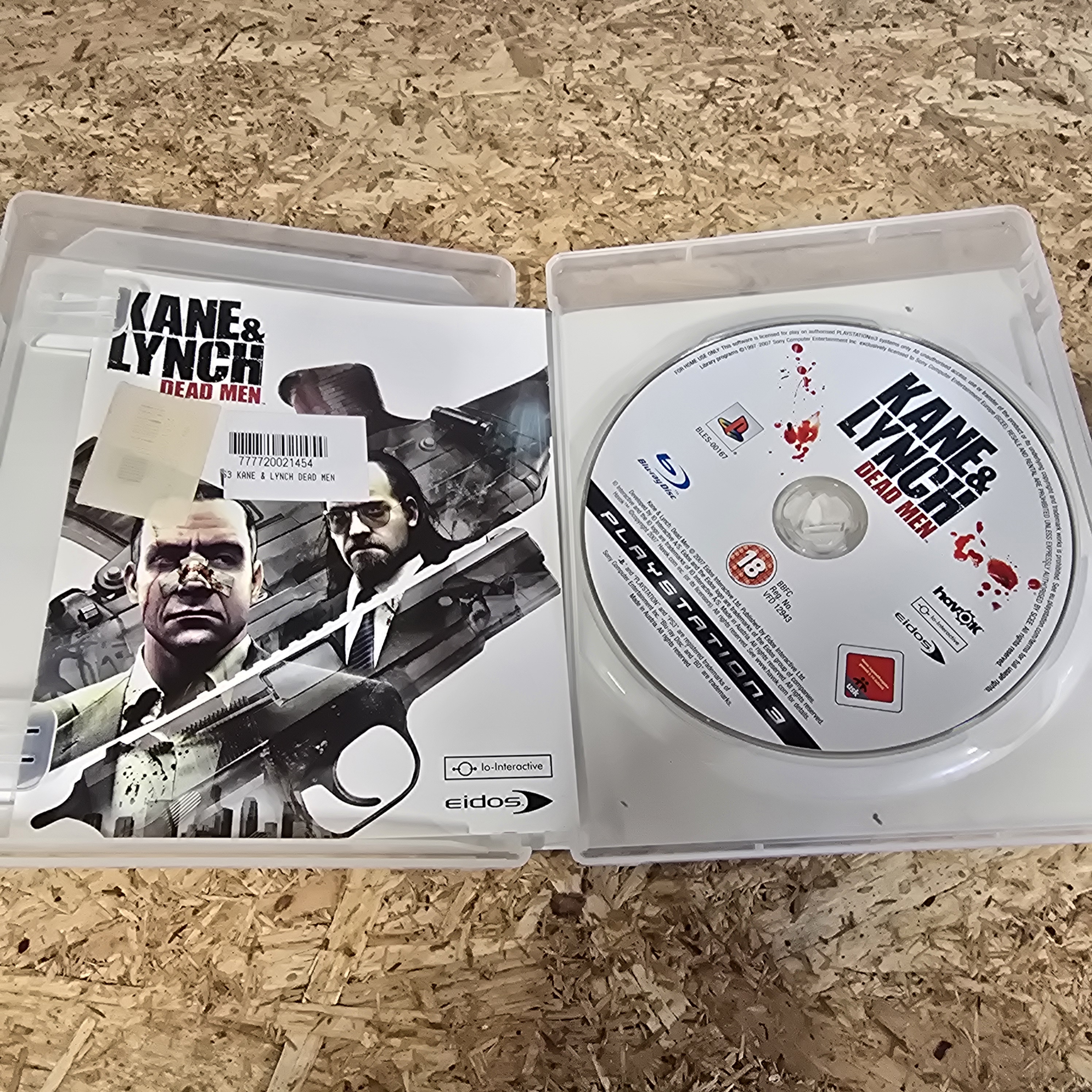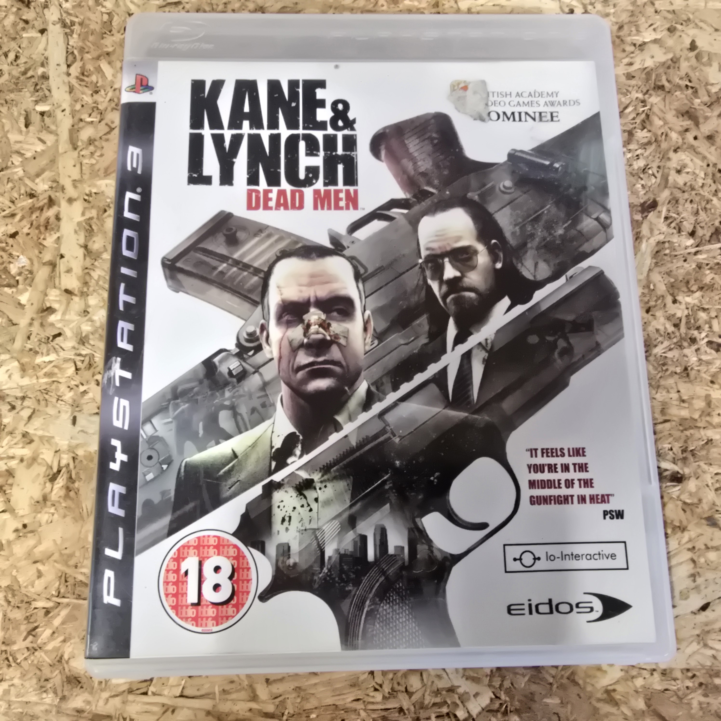 A complete-in-box physical copy of the video game Kane & Lynch: Dead Men for the Sony PlayStation 3 console. This UK and European release, bearing the code BLES-00167, was published by Eidos and developed by Io-Interactive. The item consists of a clear plastic case, a printed paper cover insert, a paper instruction manual, and a polycarbonate Blu-ray game disc. The front cover artwork displays a British Academy Video Games Awards Nominee seal and a quote from PSW magazine. The disc surface is printed with the title, the BBFC 18 age rating, and the registration number VFD 12943. The manual features a barcode sticker on the front cover with the number 777720021454.