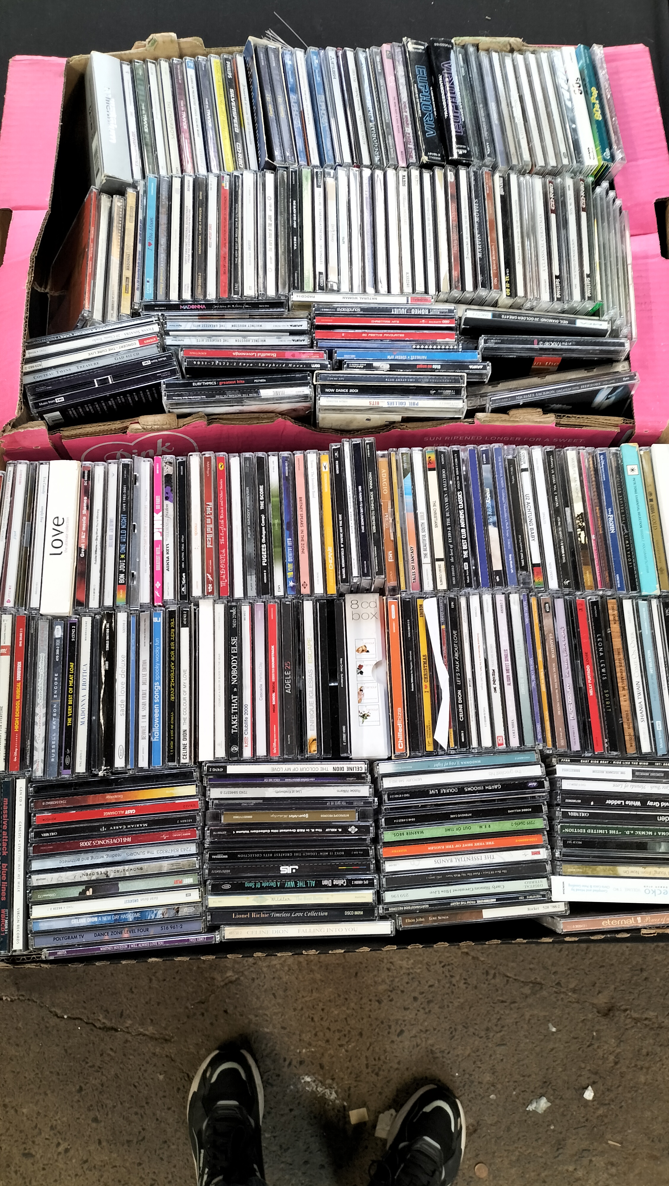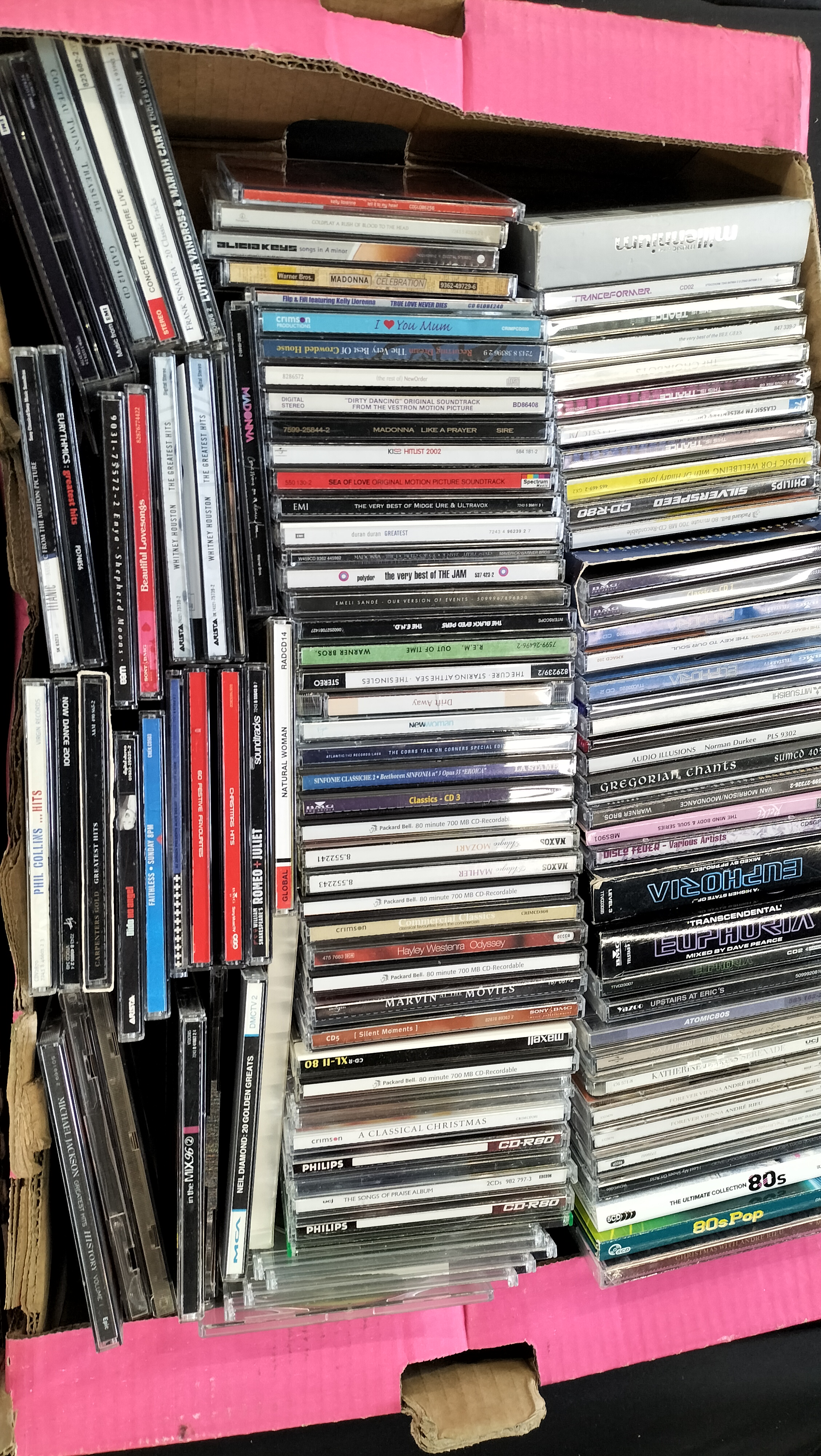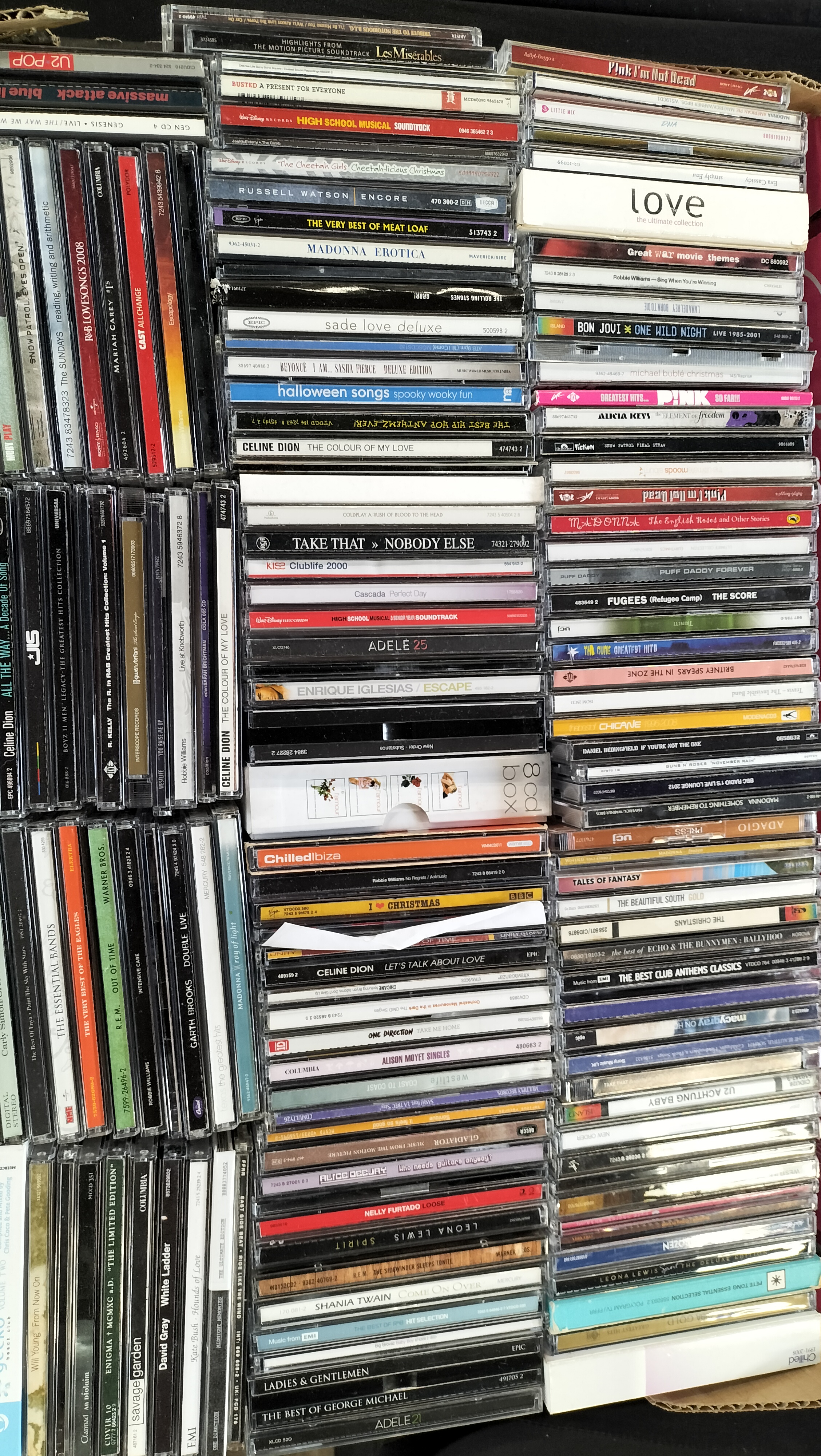A substantial collection of music compact discs comprising several hundred titles across various genres including pop, rock, classical, dance, and film soundtracks. The collection features numerous internationally recognised recording artists with visible titles including Madonna (Erotica, Like a Prayer, Something to Remember), Adele (21, 25), Celine Dion (The Colour of My Love, Falling Into You, Let’s Talk About Love), Whitney Houston (The Greatest Hits), Michael Jackson (HIStory: Volume I), U2 (Achtung Baby), George Michael (Ladies and Gentlemen), R.E.M. (Out of Time), and Phil Collins (…Hits). The assortment includes various compilation albums such as Now That’s What I Call Music and Now Dance series, alongside themed collections like Pure Garage, The Best Club Anthems Classics, and High School Musical soundtracks. Classical recordings are present, notably from the Naxos label, featuring works by Mozart and Mahler. The media is predominantly housed in standard plastic jewel cases, with additional formats including multi-disc box sets, slimline cases, and card sleeves. Visible record label attributions include Sony, Epic, Columbia, Arista, Warner Bros, and Virgin Records.