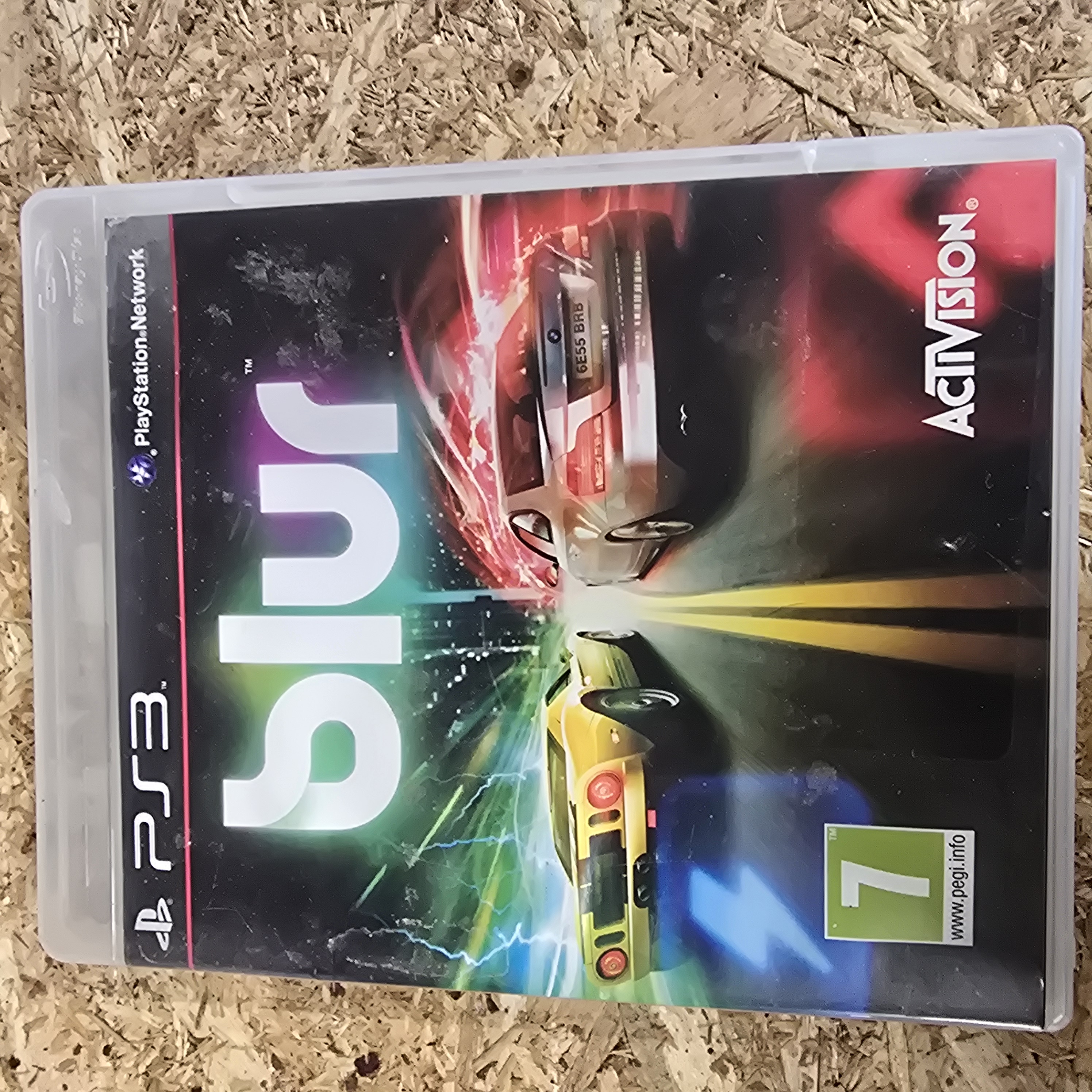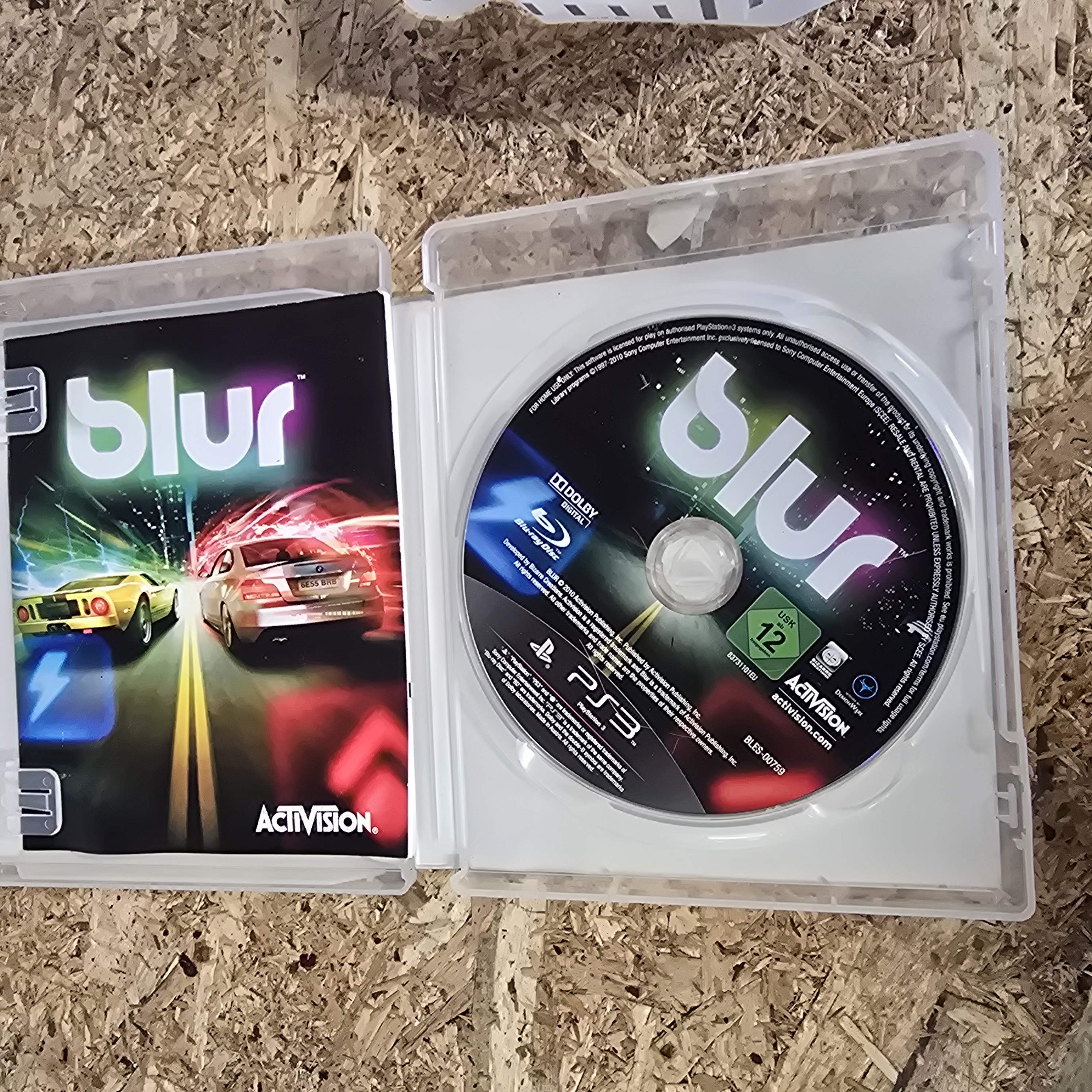 A boxed copy of the racing video game Blur for the Sony PlayStation 3 console. This title was published by Activision and developed by Bizarre Creations. The lot comprises the original clear plastic retail case, the printed paper cover insert, the internal instruction manual, and the Blu-ray game disc. The front cover displays the PS3 and PlayStation Network logos, the PEGI 7 age rating, and the Activision publisher mark. The disc face includes the BLES-00759 code, identifying this as a European PAL region release, alongside the USK 12 rating, Dolby Digital logo, and developer marks for Bizarre Creations and DemonWare. The disc also carries the identification number 83731101EU.