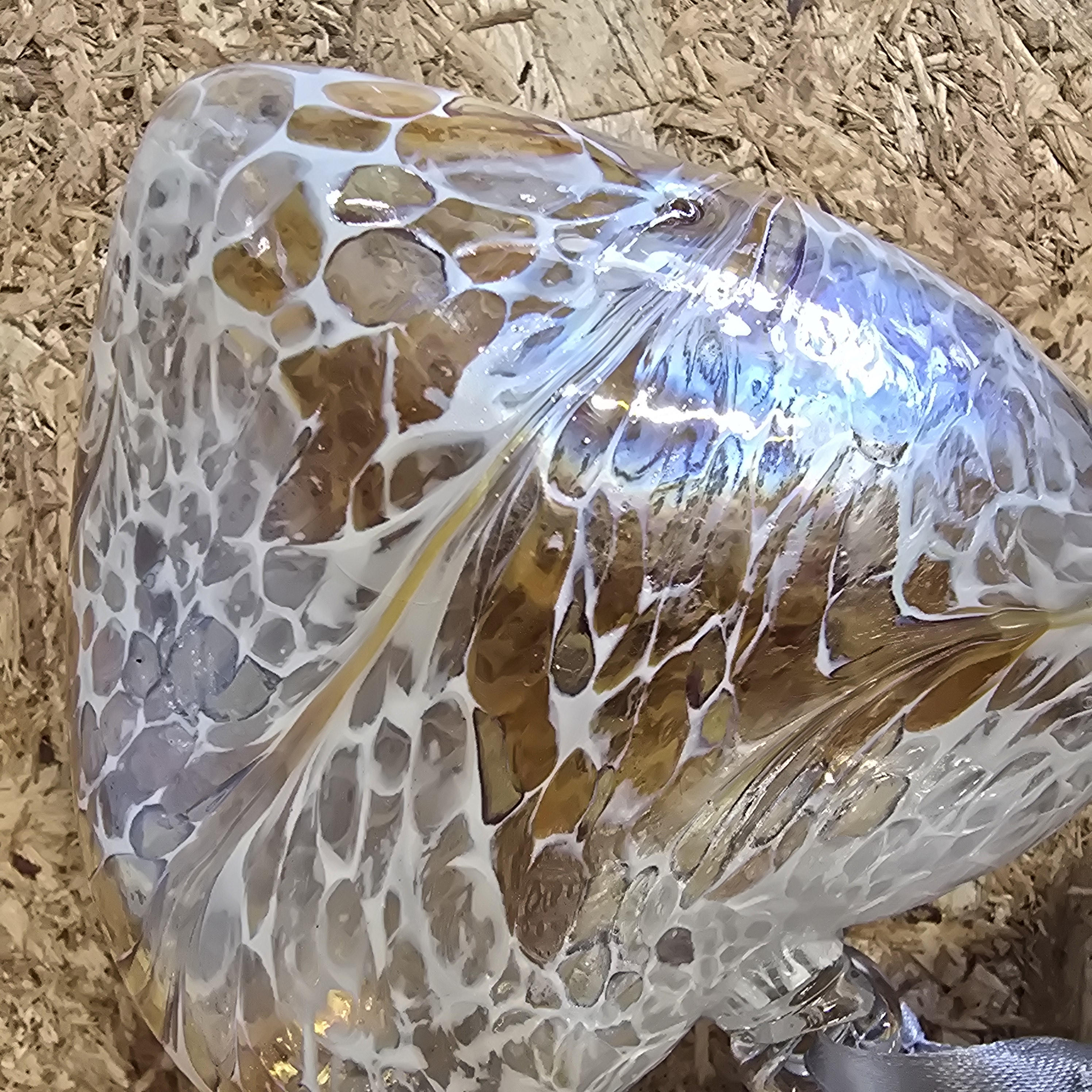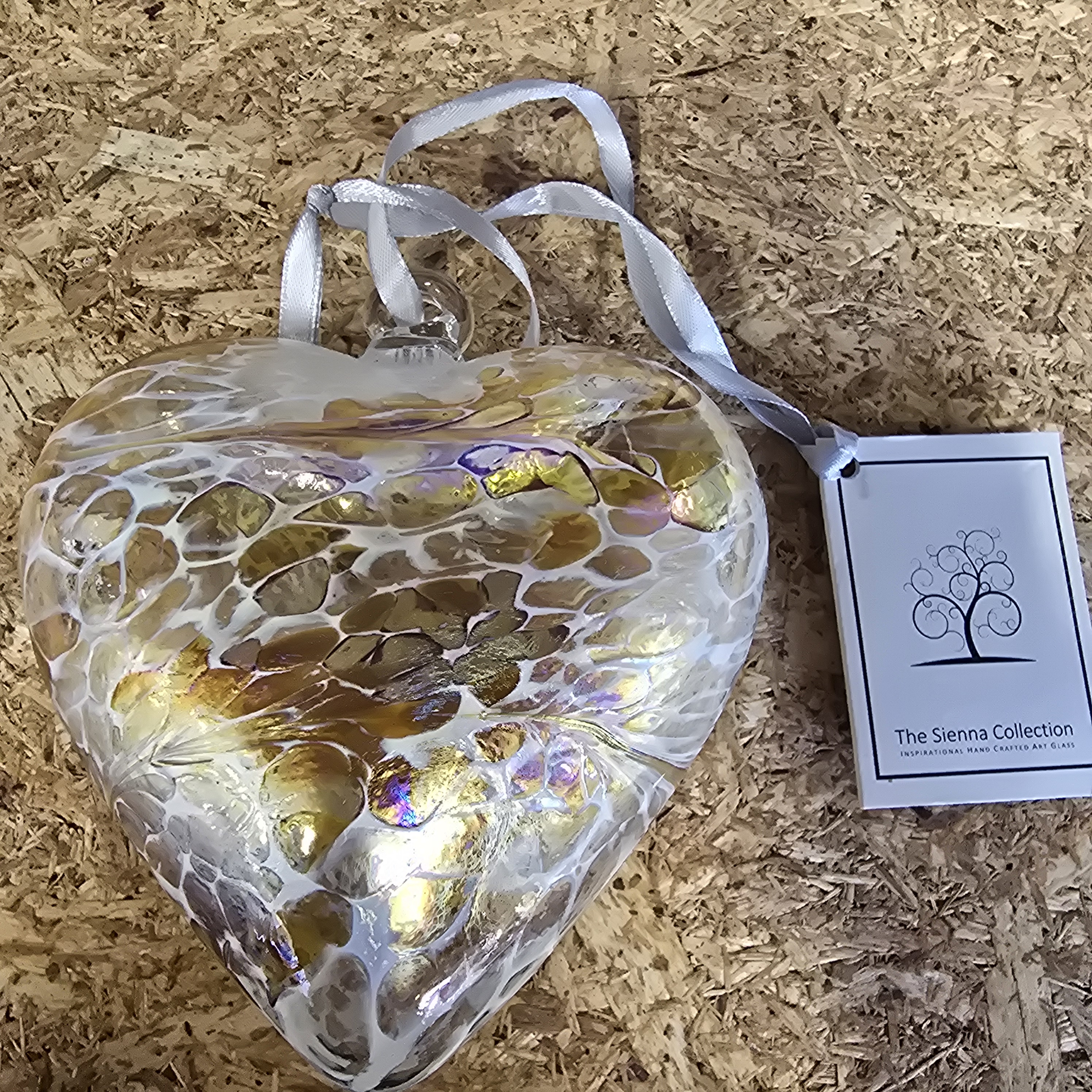 A contemporary hand-blown art glass friendship heart ornament from The Sienna Collection. The piece is constructed from clear glass with an internal white latticino web-like pattern layered over a golden-amber ground. The exterior surface features an iridescent lustre finish, displaying flashes of blue, pink, and purple. The ornament is suspended from a grey satin hanging ribbon and retains its original paper swing tag. The tag features a stylized tree logo and is printed with the text The Sienna Collection, Inspirational Handcrafted Art Glass. No marks are present on the glass itself.