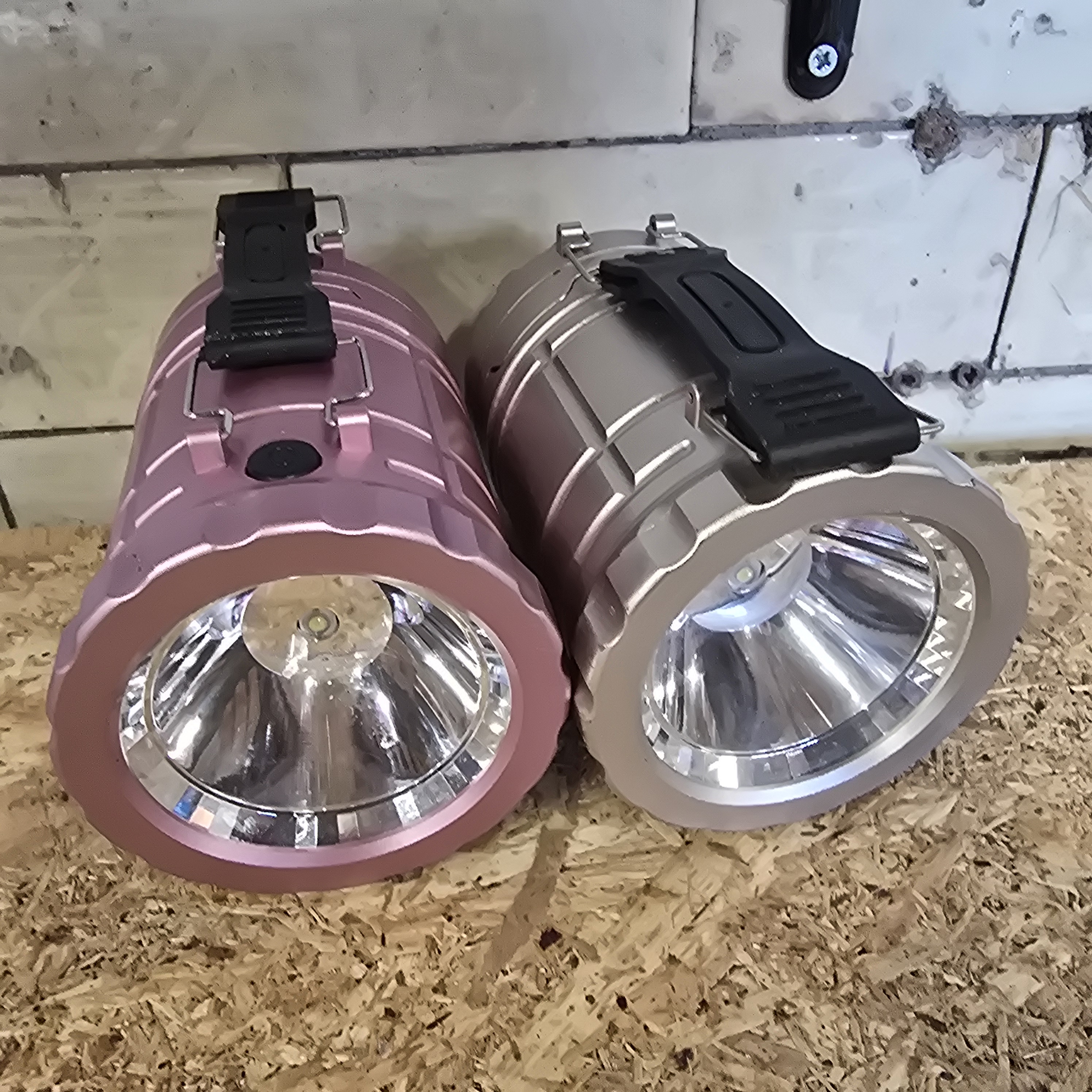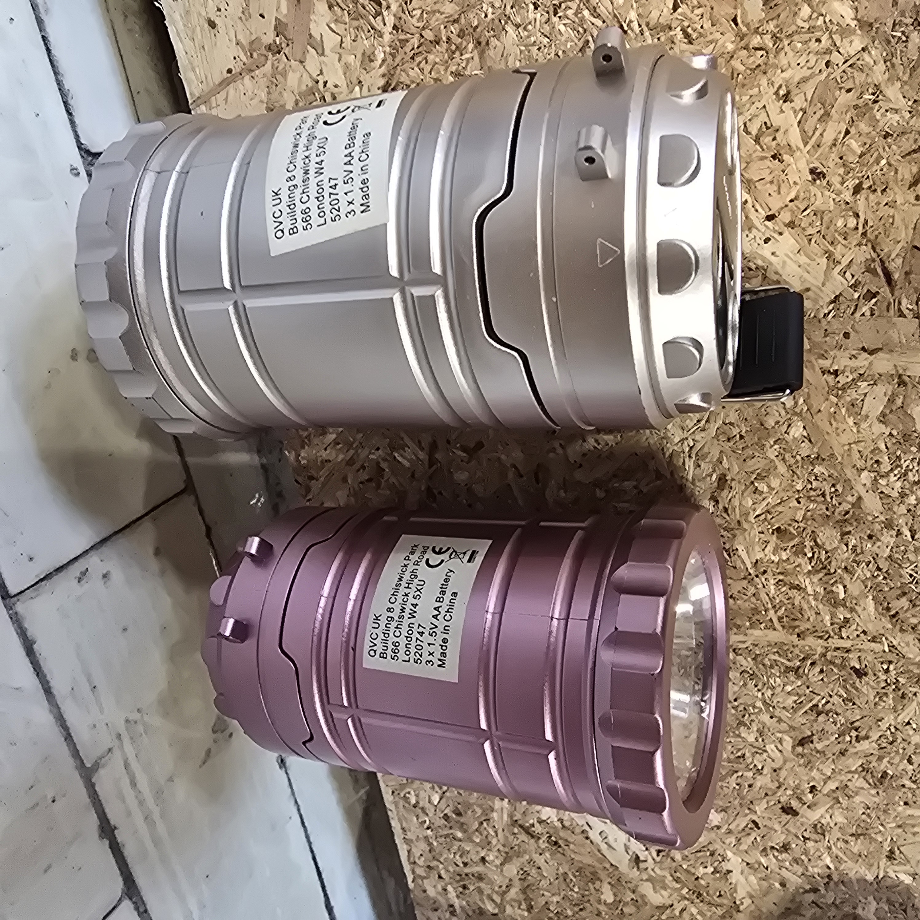 A pair of modern portable LED lanterns with metallic finishes. One unit features a metallic pink finish and the other a metallic silver finish. Each lantern is constructed with a cylindrical, ribbed body, a clear lens at the front, and an integrated black plastic carry handle. The design incorporates a collapsible pop-up mechanism. Printed labels on the body of each item include the text QVC UK, Building 8 Chiswick Park, 566 Chiswick High Road, London W4 5XU, 520747, 3 x 1.5V AA Battery, and Made in China, accompanied by a CE mark and disposal symbol.