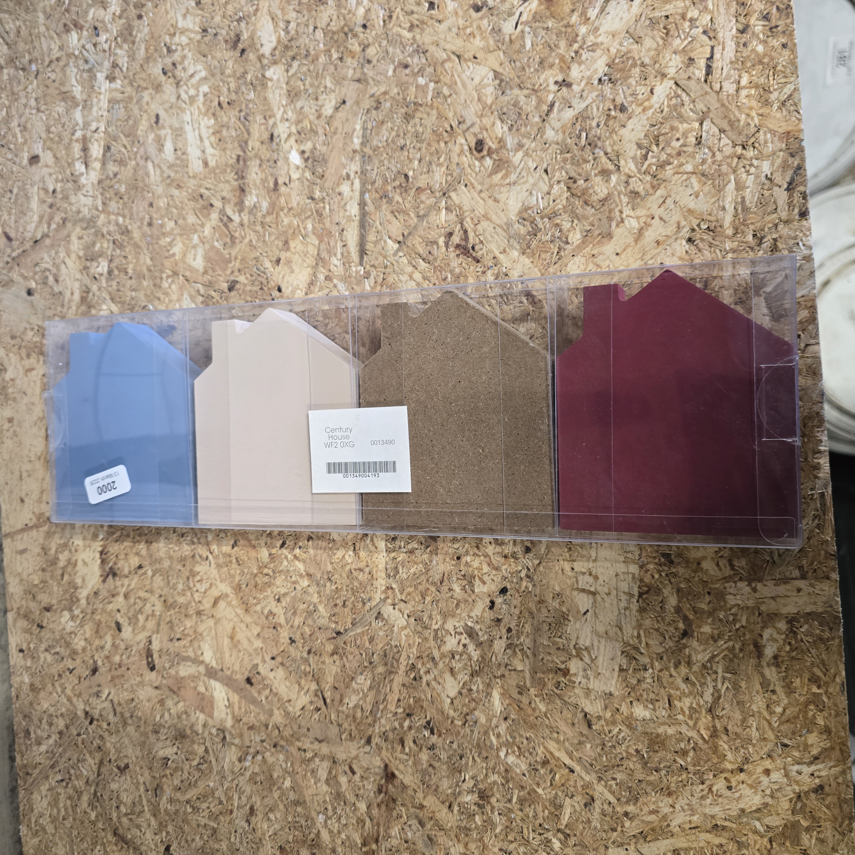 A set of four contemporary freestanding decorative blocks constructed from engineered wood. Each block is shaped as a house with a gabled roof and finished in a palette of light blue, cream, natural wood stain, and deep red. The blocks feature applied lowercase letters in contrasting colours that together spell the word home. A retail label on the reverse of the packaging identifies the distributor as Century House, Wakefield (WF2 0XG), with the reference number 0013490 and barcode 001349004193. A secondary label is dated 13 March 2024.