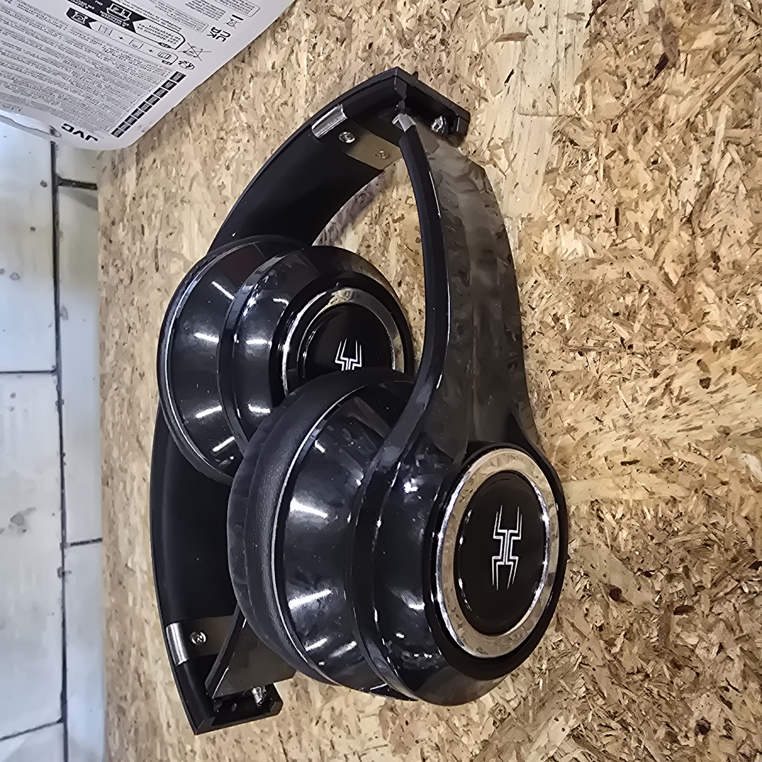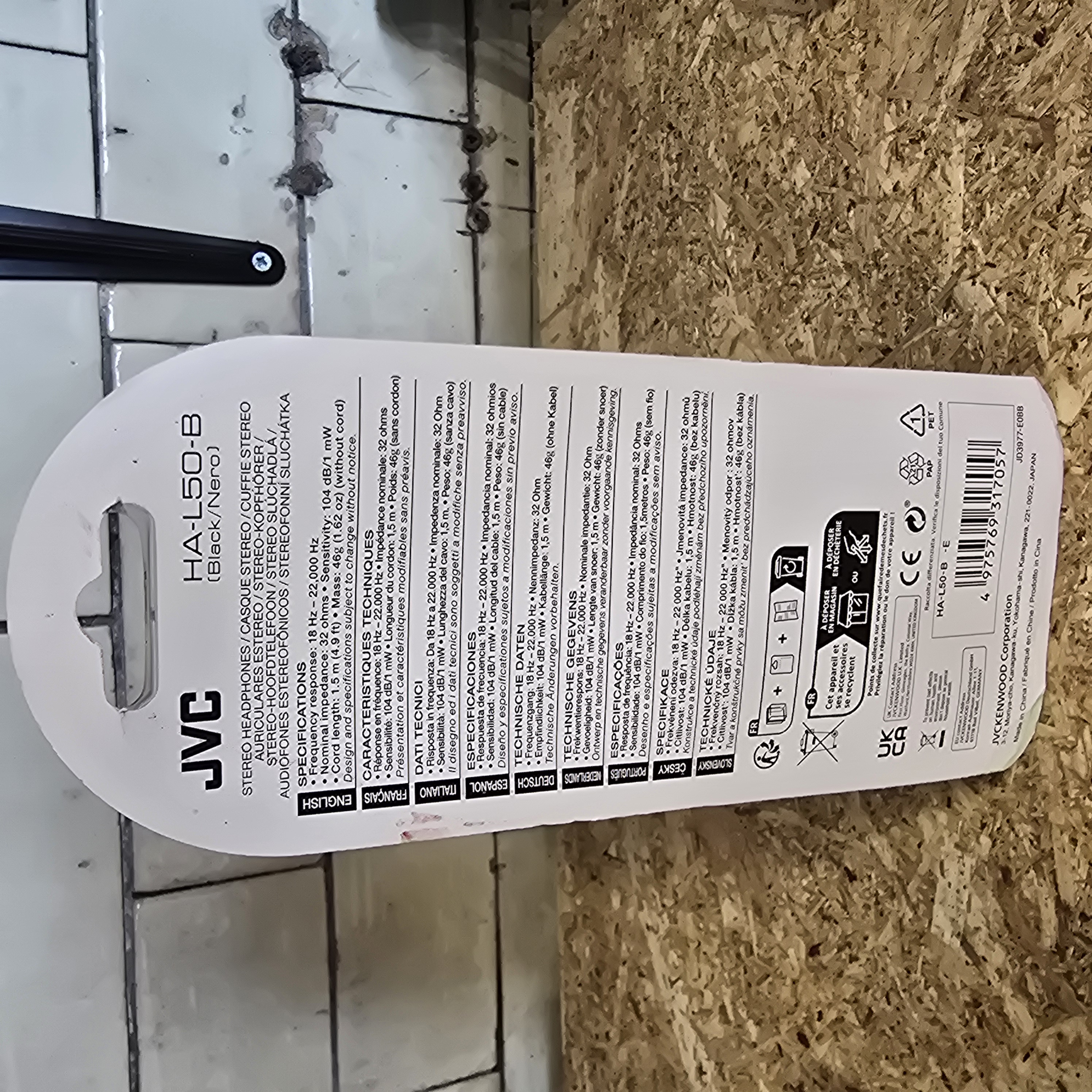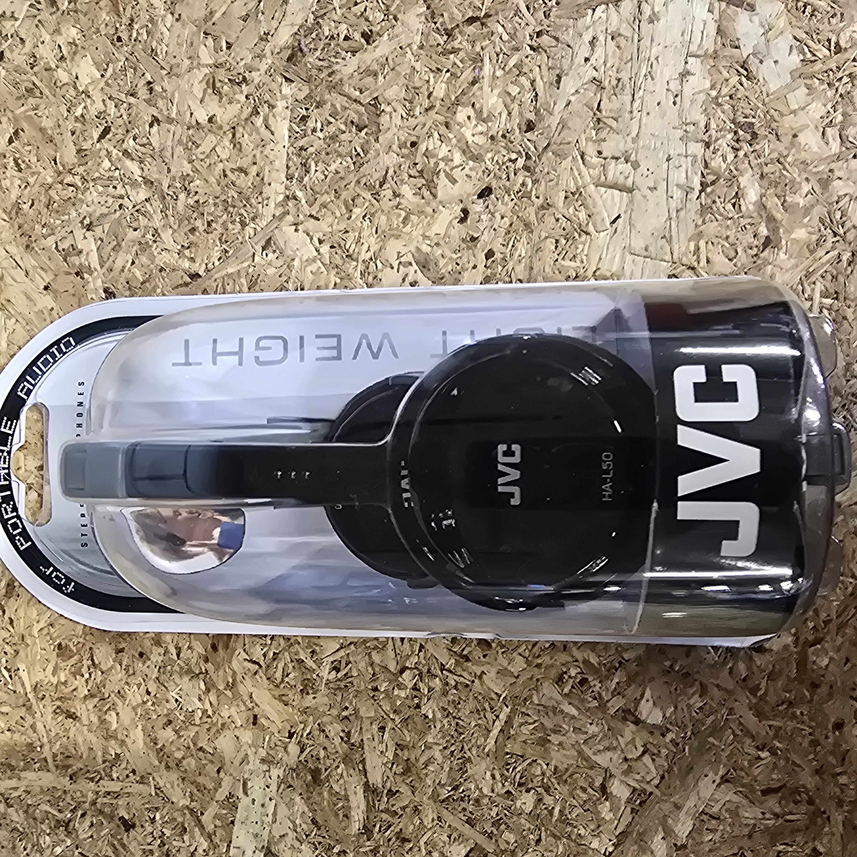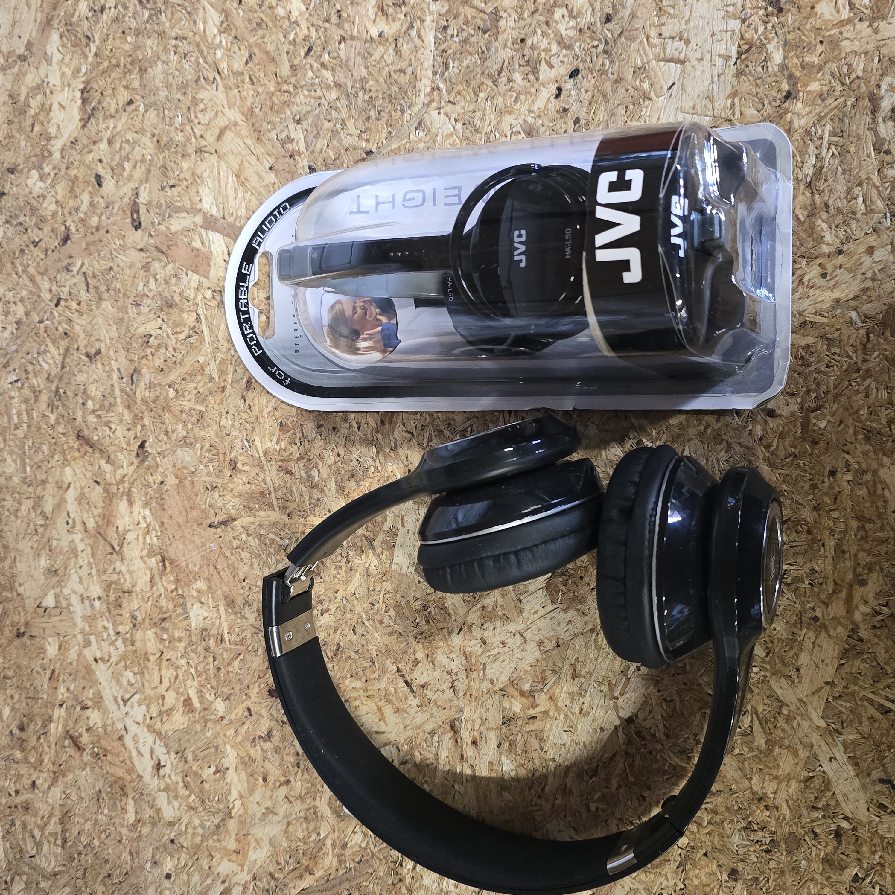 A collection of headphones including a pair of JVC lightweight stereo headphones, model HA-L50-B, finished in black and presented in original retail blister packaging. Technical specifications for the JVC unit include a frequency response of 18 Hz to 22,000 Hz, 32 ohm impedance, and a 1.5 m cord. Also included is a pair of black over-ear folding headphones featuring silver-tone circular accents and a stylised logo consisting of three vertical bars joined by a horizontal bar on the exterior of the earcups.