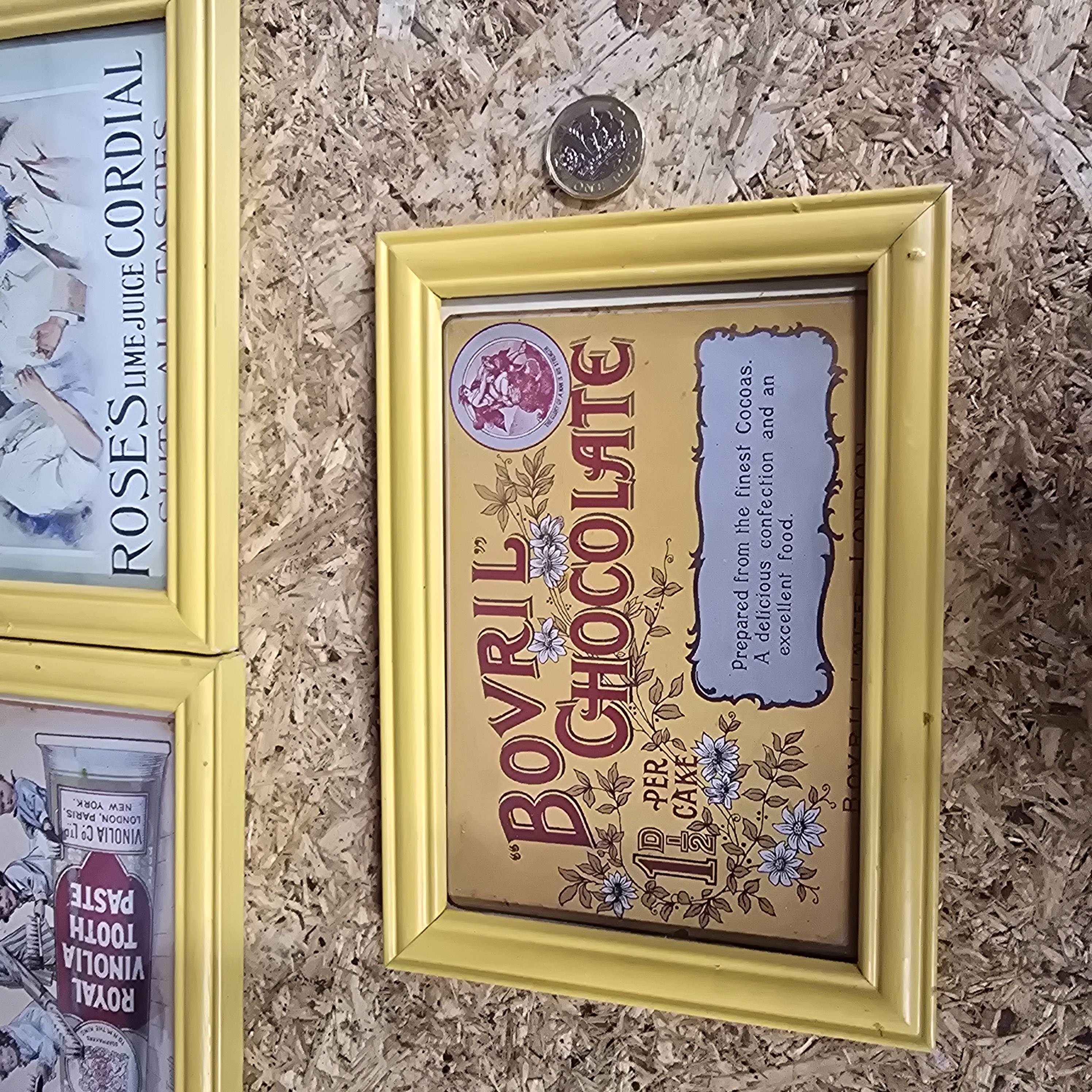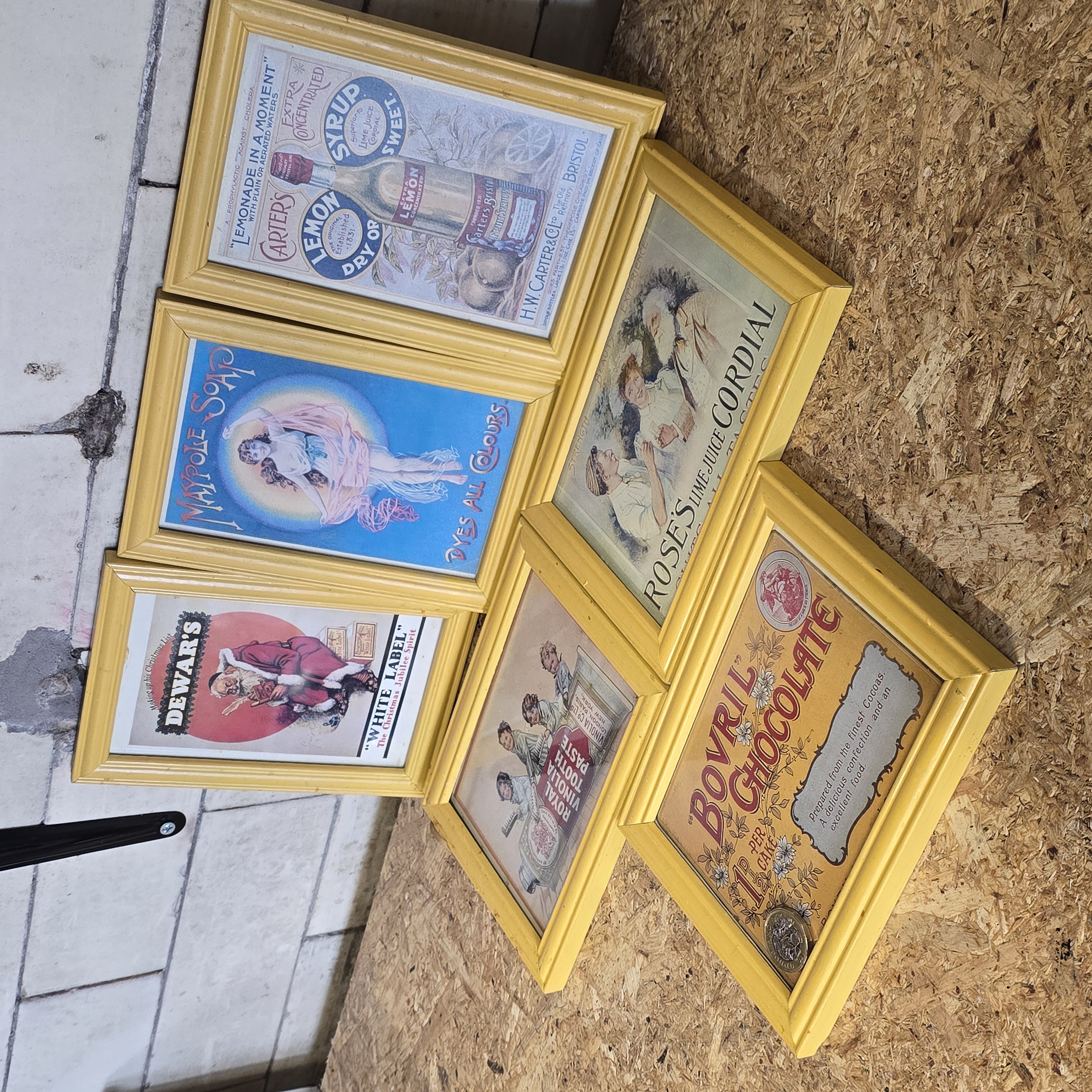 A collection of framed miniature prints featuring modern reproductions of Victorian and Edwardian era British commercial advertisements. The subjects depicted include Bovril Chocolate, Maypole Soap, Dewar’s White Label Whisky, Rose’s Lime Juice Cordial, Royal Vinolia Tooth Paste, and H.W. Carter and Co. Ltd. Lemon Syrup. The Bovril Chocolate advertisement includes a decorative cartouche and pricing of one and a half pence per cake. The Maypole Soap print features an Art Nouveau style illustration of a woman with flowing pink fabric and the text Dyes All Colours. The Dewar’s White Label Whisky print shows Santa Claus with the text The Christmas Jubilee Spirit. The Rose’s Lime Juice Cordial print illustrates three figures in an outdoor setting. The Royal Vinolia Tooth Paste print features rugby players and branding for Vinolia Co. Ltd. of London, Paris, and New York. The Carter’s Lemon Syrup print shows a bottle and citrus fruit with text for H.W. Carter and Co. Ltd. of The Old Refinery, Bristol. Each print is housed in a matching yellow-painted wooden or composite frame behind glass or clear plastic.