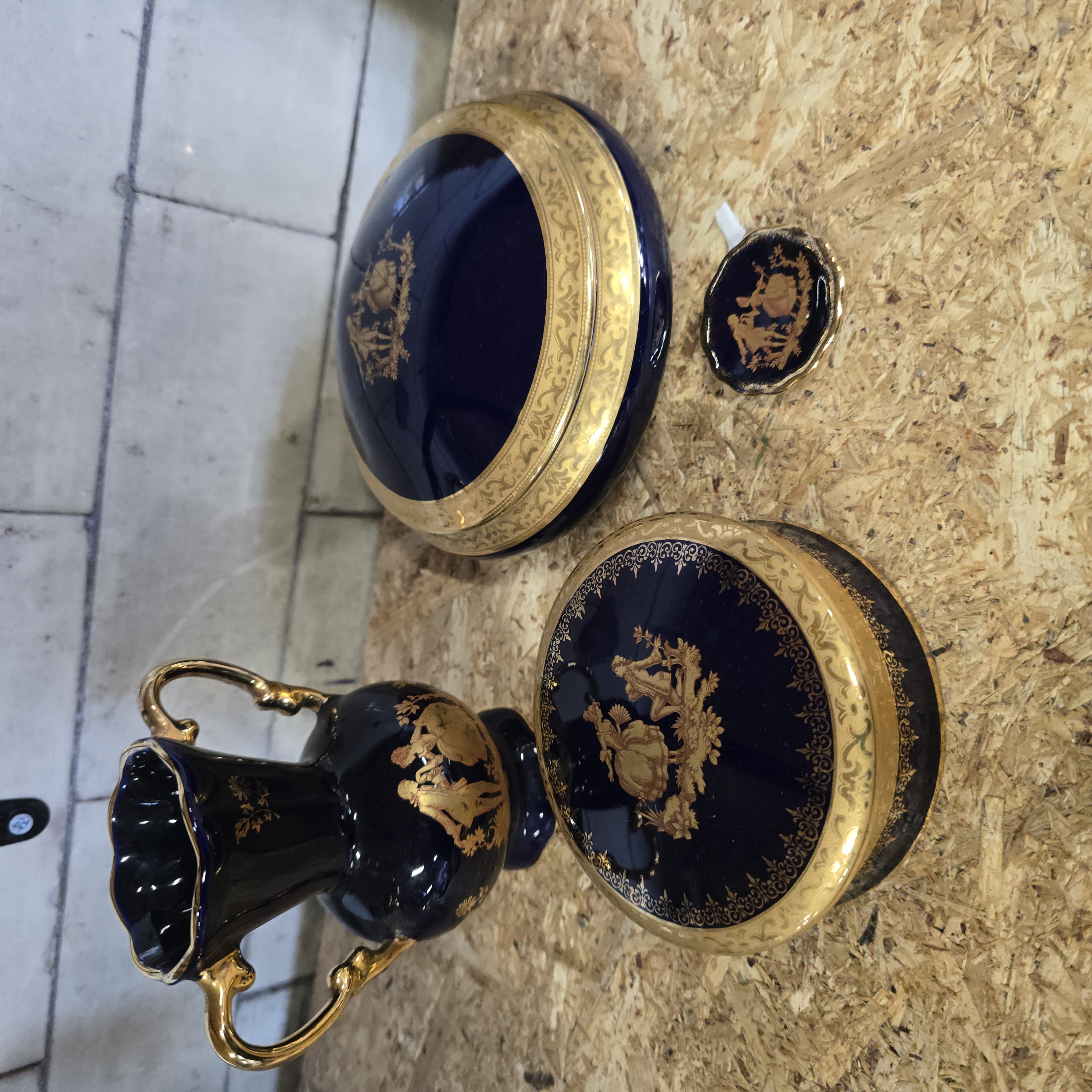 This collection of decorative porcelain is finished in a deep cobalt blue glaze with extensive gilded decoration. The assortment includes a double-handled vase with a scalloped rim and ornate scrolled handles, two circular lidded trinket boxes of different dimensions, and a small circular pin dish. Each item is decorated with a central transfer-printed vignette in gold depicting romanticised 18th-century figures in a fete galante style. These vignettes are framed by wide gilded borders featuring repeating scroll and floral motifs. The construction and decorative scheme are characteristic of mid-20th century European porcelain, specifically resembling the production of Limoges Castel, France. No maker marks are visible on the underside of the pieces.