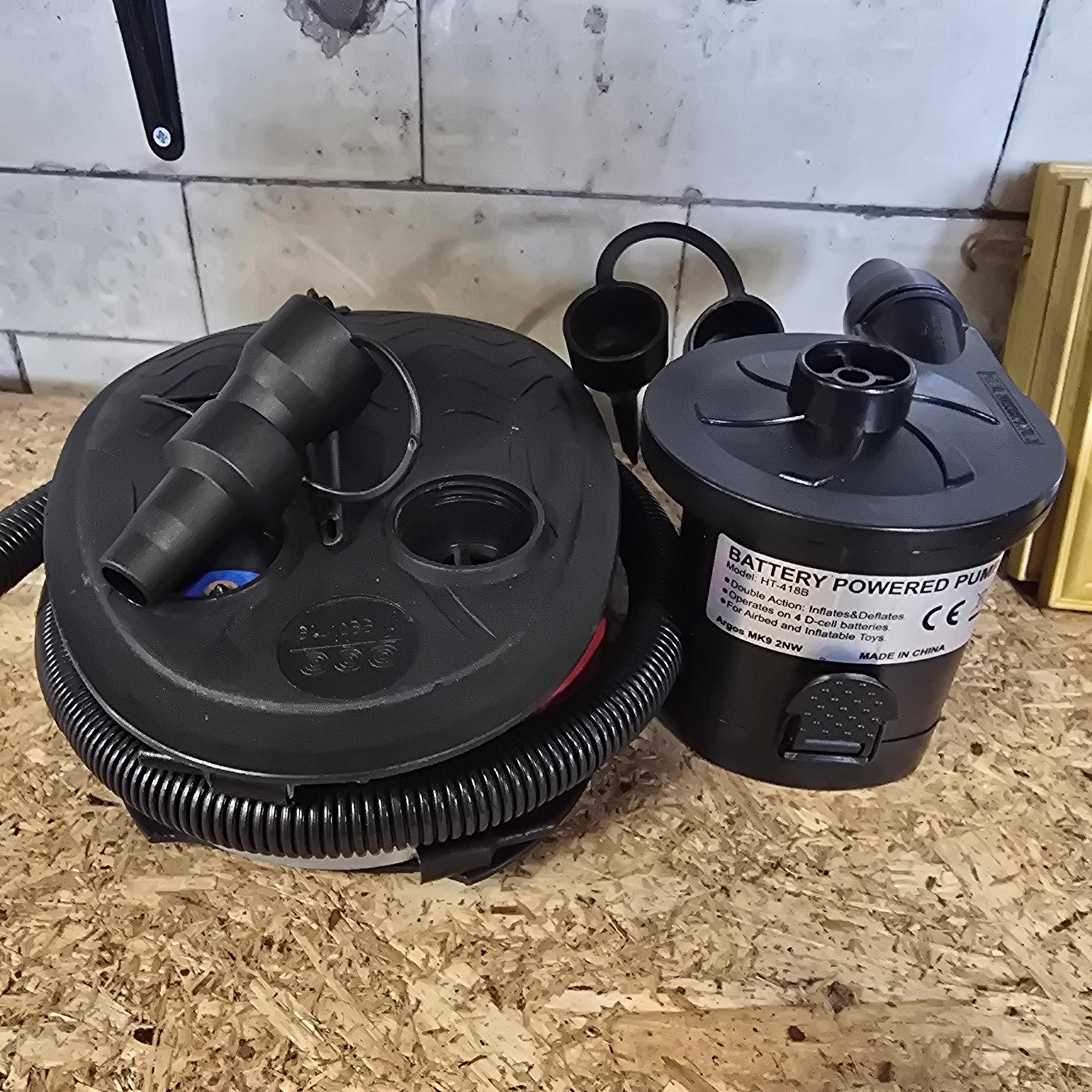 This lot comprises two portable air pumps designed for use with inflatables. The first unit is a manual bellows-style foot pump with a black plastic body and a white and red base, resembling an Intex 69611E model. It is equipped with a coiled black corrugated hose and a plastic nozzle attachment. The top of the pump is embossed with circular marks containing 3L, 1988, and SGS. The second unit is a black plastic electric pump identified by a label as Model HT-418B, produced for the retailer Argos. The label indicates it is a double-action pump for inflation and deflation, suitable for airbeds and inflatable toys, and requires four D-cell batteries for operation. This unit is accompanied by two additional nozzle attachments.