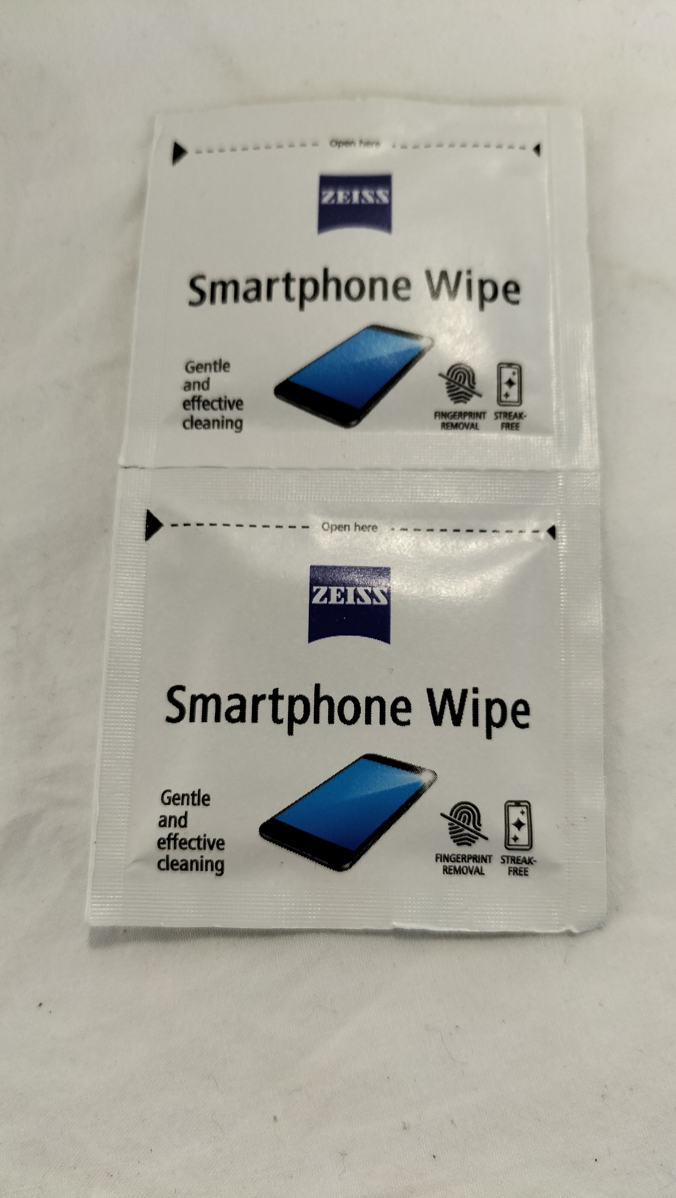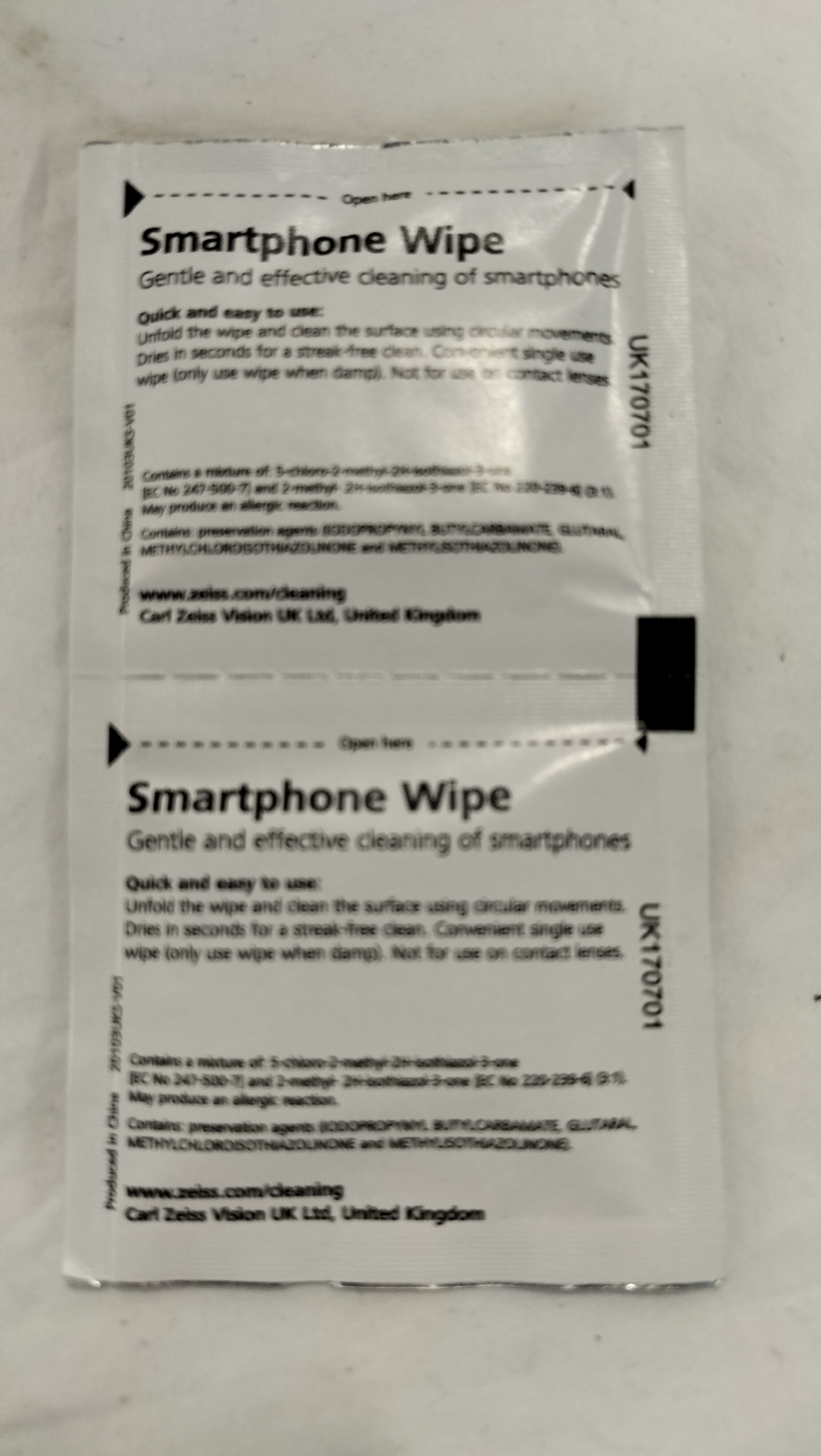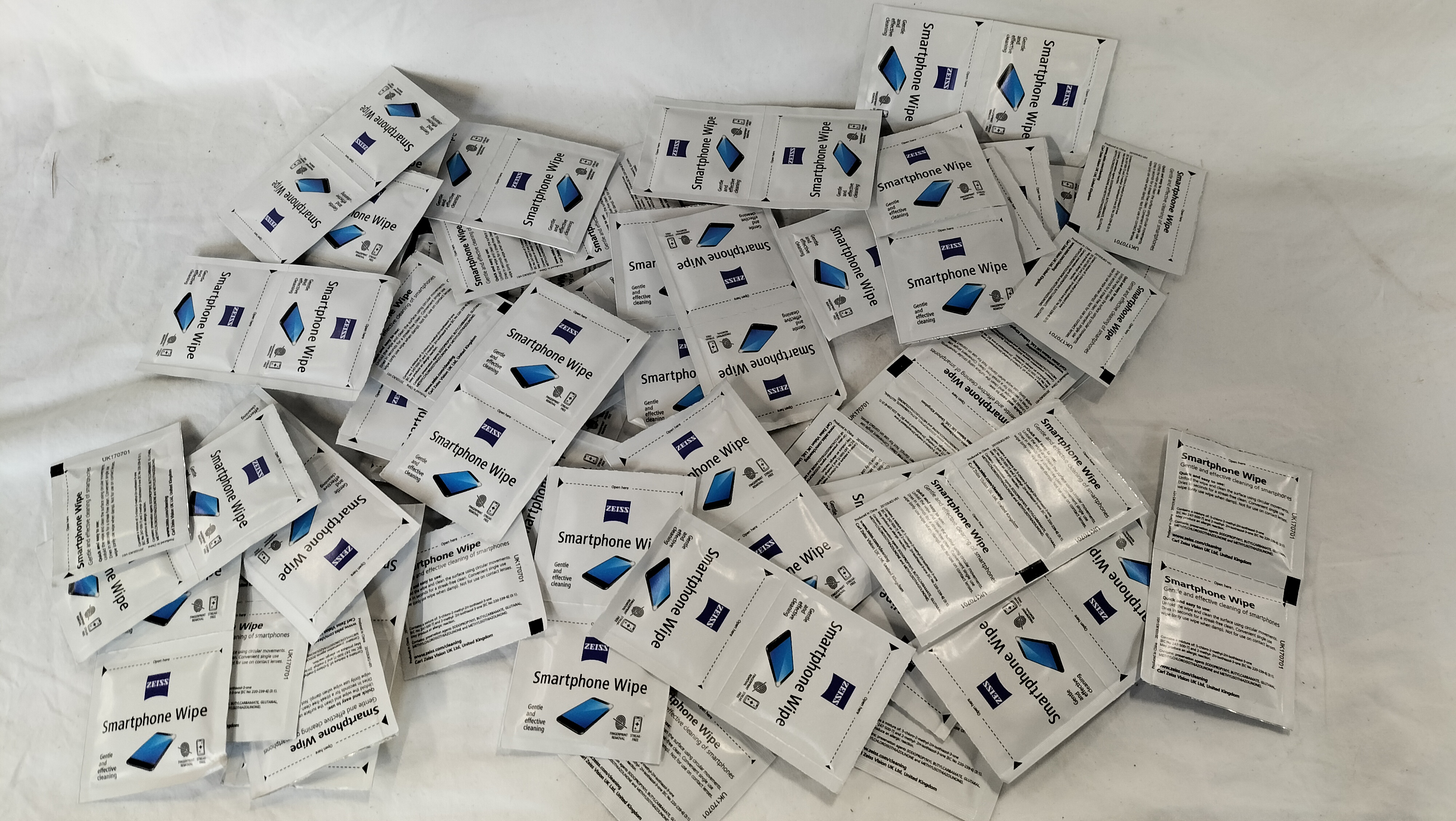 A collection of individual, single-use pre-moistened smartphone cleaning wipes manufactured by Zeiss. The lot consists of numerous sachets, primarily joined in pairs by perforated edges. Each sachet is printed with the Zeiss logo and the text Smartphone Wipe on the front, accompanied by icons for fingerprint removal and streak-free cleaning. The reverse of each sachet contains detailed instructions for use, chemical composition information, and the manufacturer attribution Carl Zeiss Vision UK Ltd, United Kingdom. The sachets also bear the reference UK170701 and are marked as produced in China. These wipes are specifically designed for the gentle cleaning of smartphone screens and similar electronic displays.