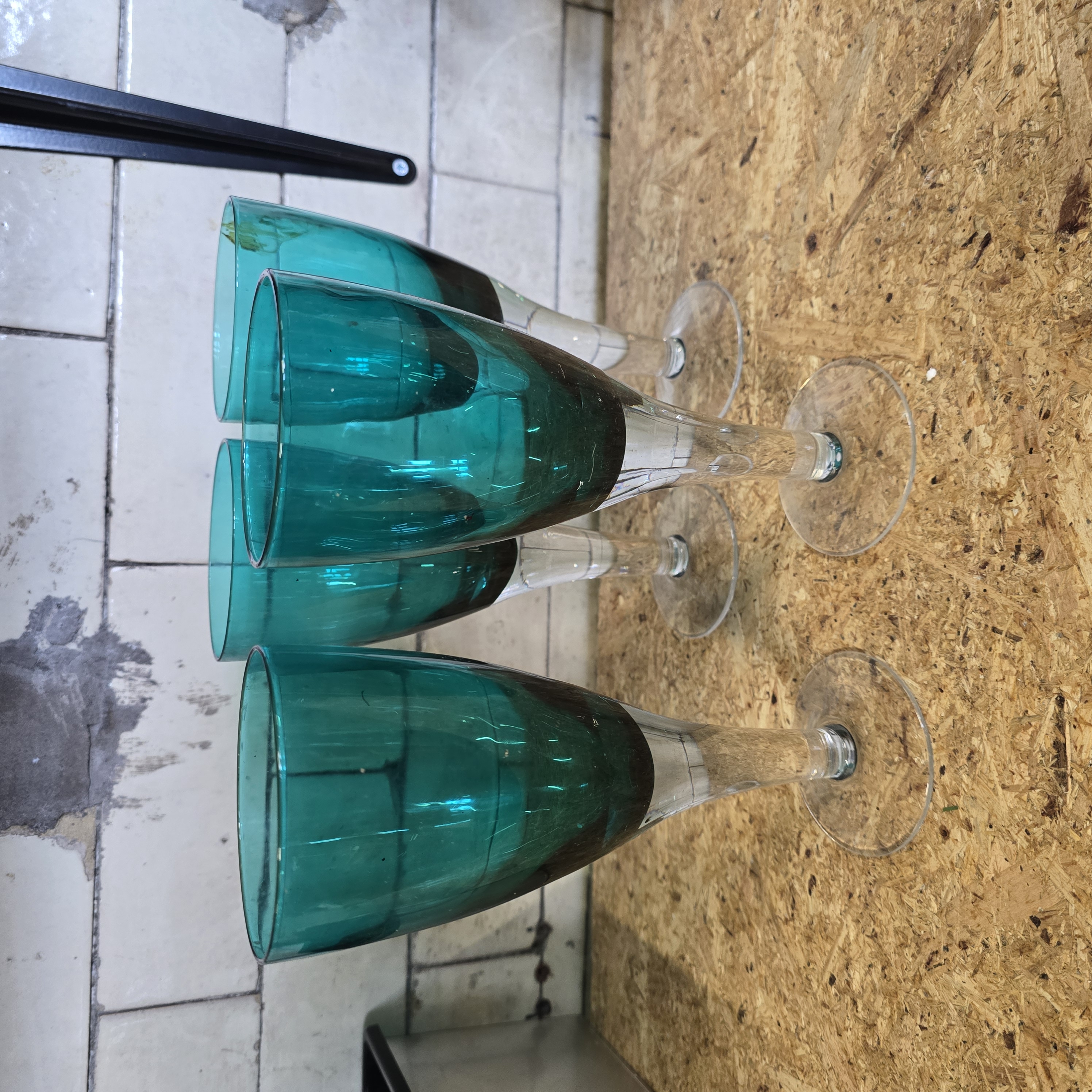 A set of four contemporary wine goblets or large glasses. Each piece is constructed from blown glass featuring a two-tone design. The vibrant teal-green bowl has a rounded form that tapers slightly towards the rim, transitioning to clear glass at the base. The glasses are supported by solid, clear tapering stems which terminate in flat, circular feet. No maker’s marks, etched signatures, or labels are present on the bases or bodies of the items. The style is characteristic of late 20th-century or contemporary European decorative glassware.