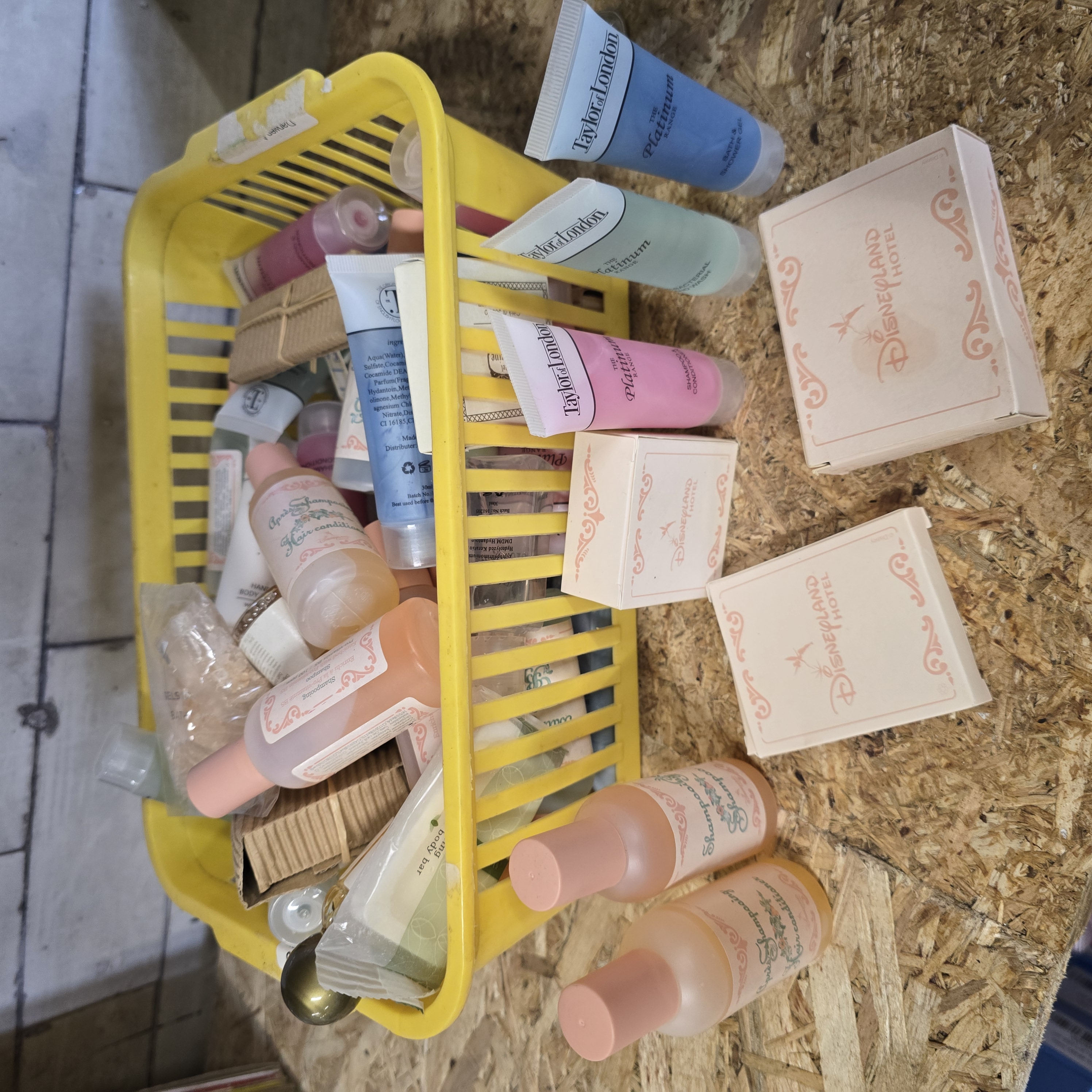 A collection of miscellaneous hotel-style toiletries and amenities. The lot features several items from Taylor of London within The Platinum Range, comprising plastic tubes of bath and shower gel, anti-bacterial hand wash, and shampoo conditioner in blue, green, and pink colourways. Also included is a selection of Disneyland Hotel branded items featuring the Tinkerbell silhouette, consisting of multiple small cardboard boxes and frosted plastic bottles containing hair conditioner and shampoo. The assortment further contains various other tubes and bottles, some labelled Aprés Shampoo and Hair Conditioner, and a wrapped body bar. The items are housed in a yellow plastic basket.